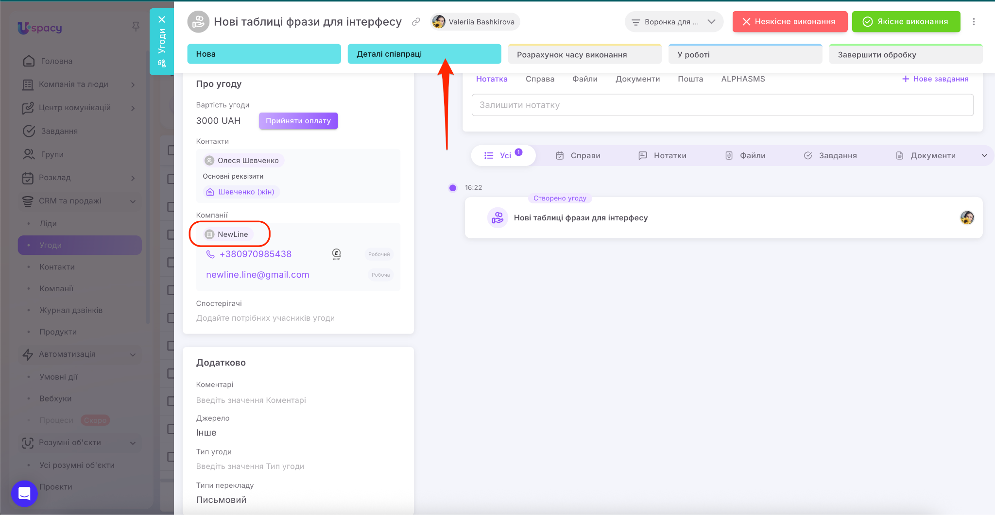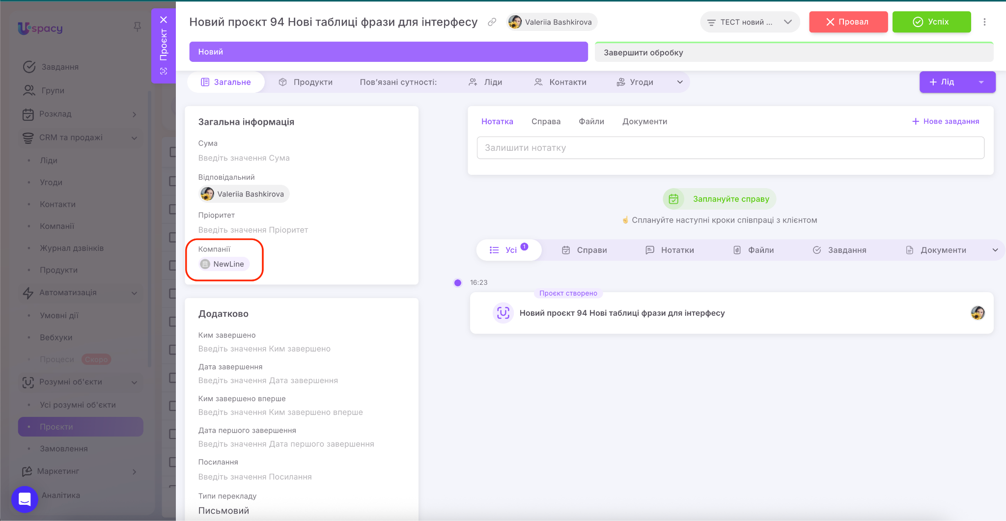Ми пов’язали нашу угоду з компанію NewLine. А після того як угода перейшла у статус Деталі співпраці автоматично був створений елемент нашого РО, тобто новий Проєкт. І як бачимо у його картці теж відображається зв’язок з цією компанією.