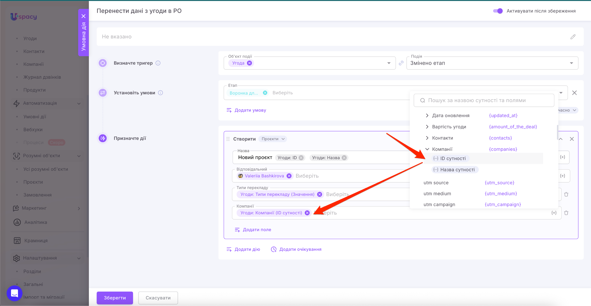 Коли ви налаштовуєте умовну дію, щоб, наприклад, із Угоди передавались Контакти або Компанії в РО (тобто відбувалась переприв’язка до вже існуючих сутностей), важливо підставляти не назву, а ID сутності.