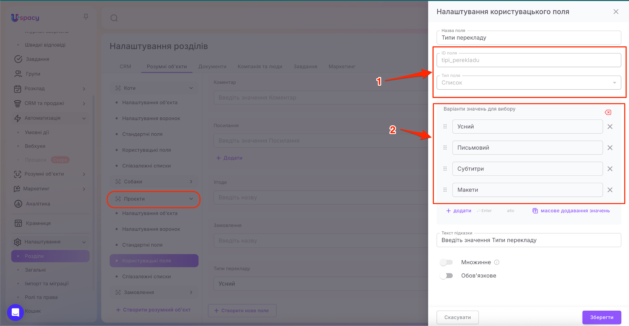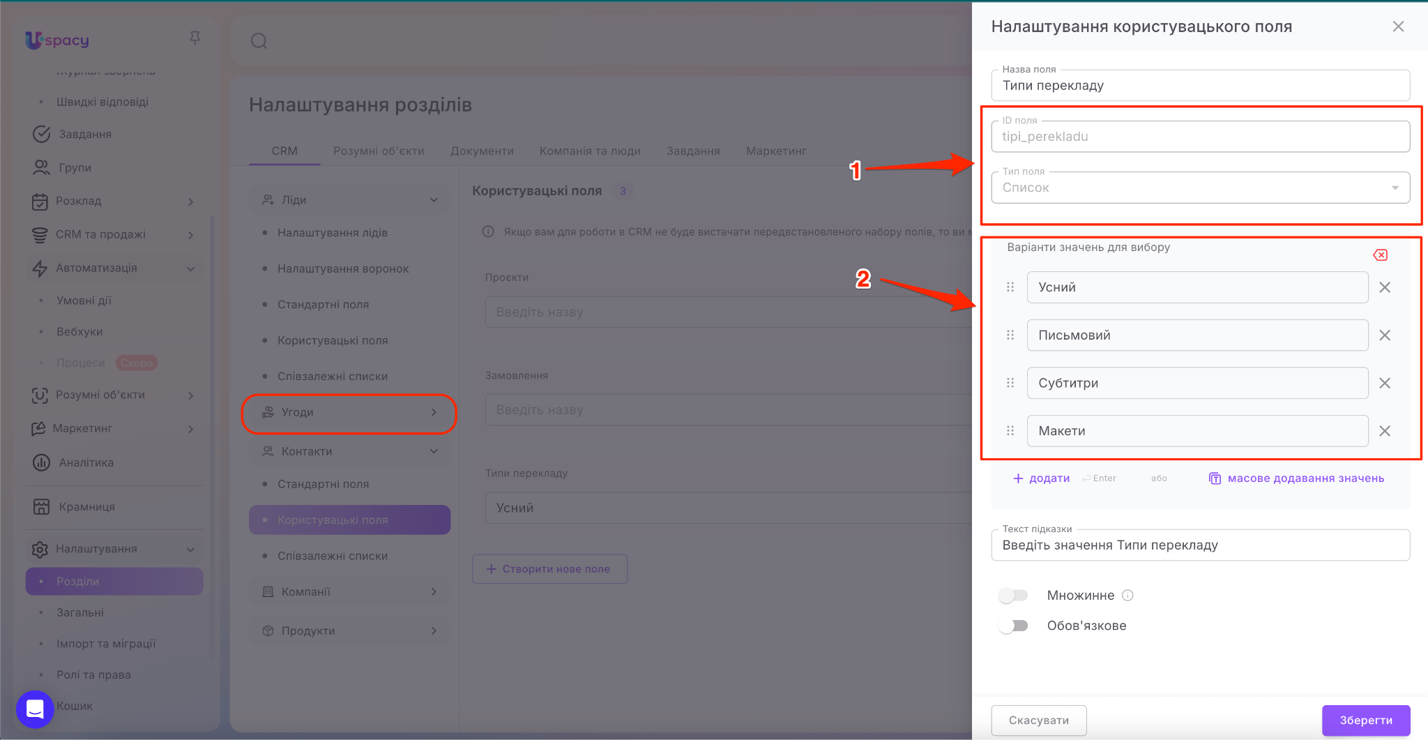 Тут розберемо критично важливий нюанс для полів типу Список і Мітка: під час передачі значень система звіряє не назву, яку ви бачите в інтерфейсі («На розгляді», «Продано», «Внесена передоплата»), а внутрішній ID значення. Тому навіть якщо назви в Угоді та РО виглядають однаково, передача може не спрацювати, якщо ці значення створені по-різному і мають різні ID.