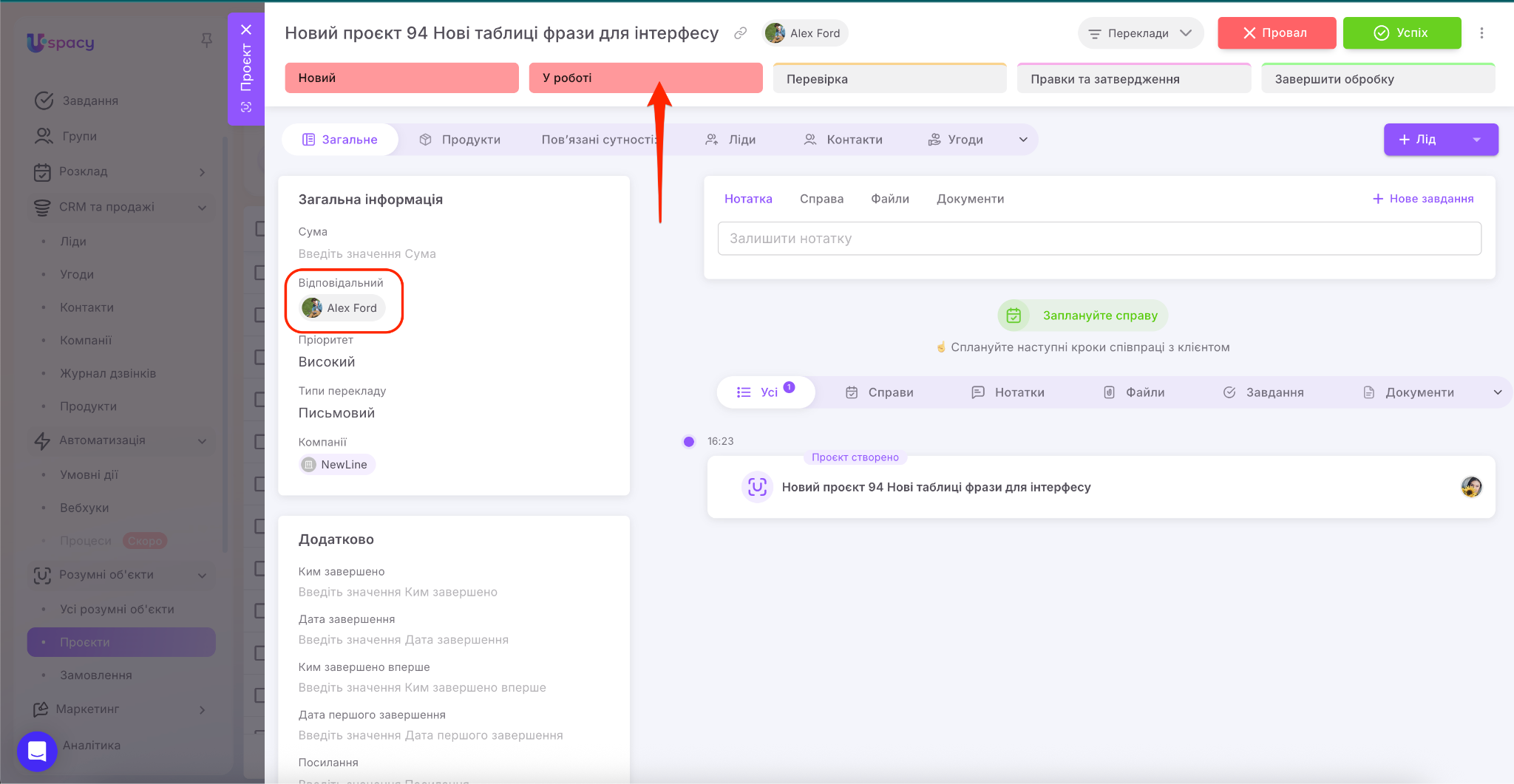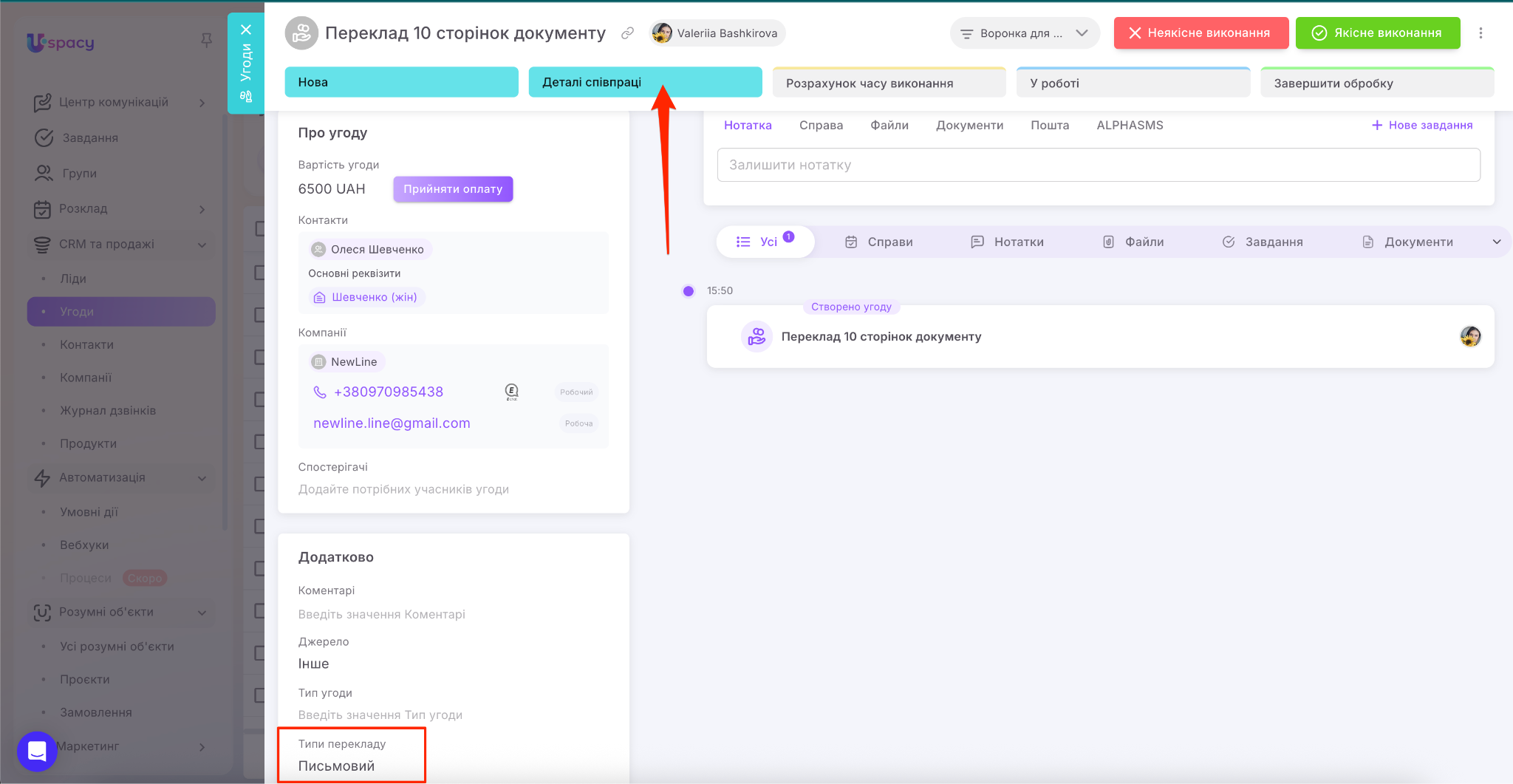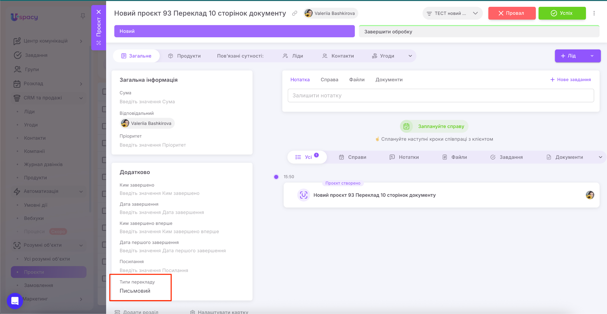 У картці угоди ми заповнили поле Типи перекладу значенням Письмовий. А після того як угода перейшла у статус Деталі співпраці автоматично був створений елемент нашого РО, тобто новий Проєкт. І як бачимо у його картку було перенесено потрібне значення потрібного поля (Типи перекладу – Письмовий).