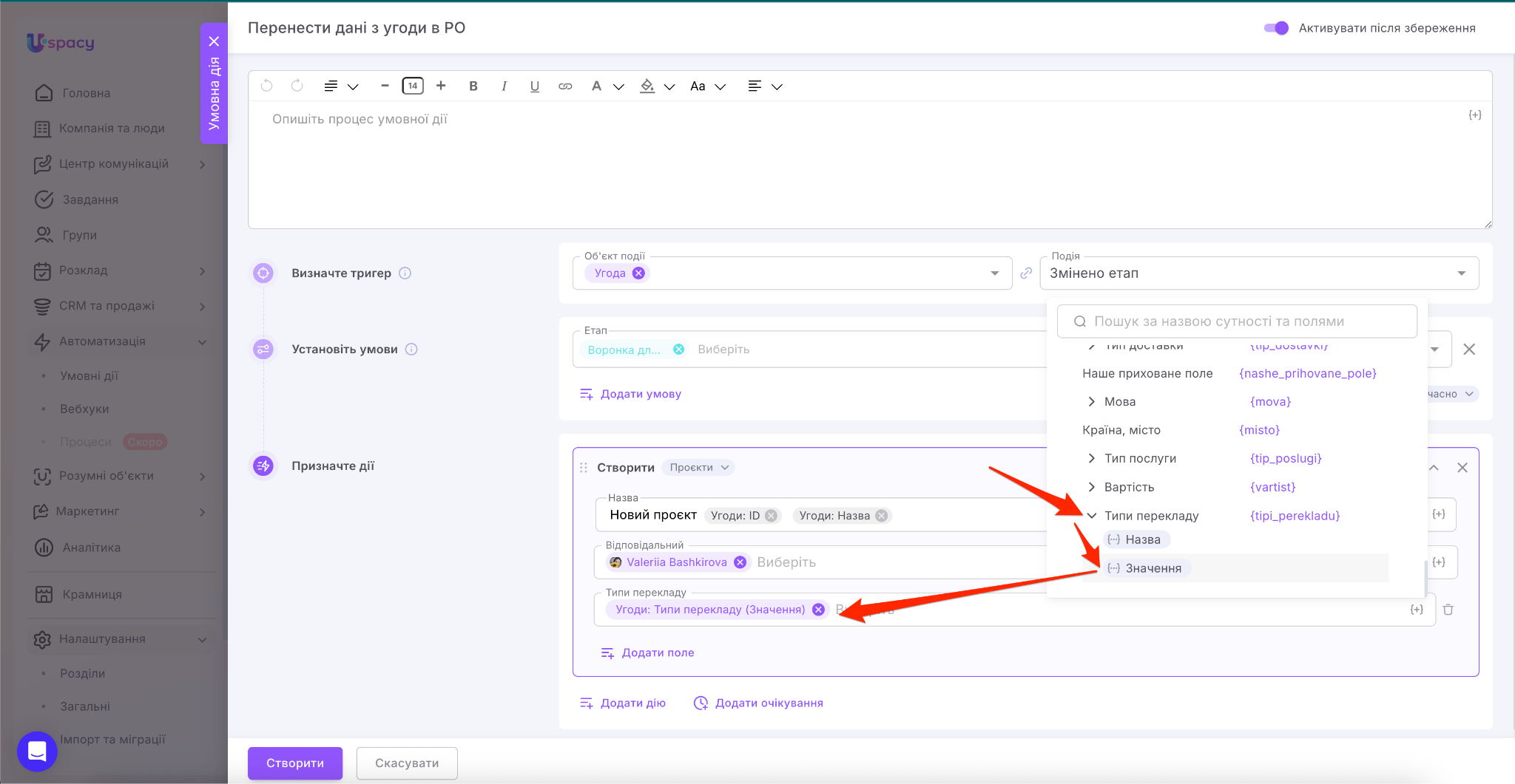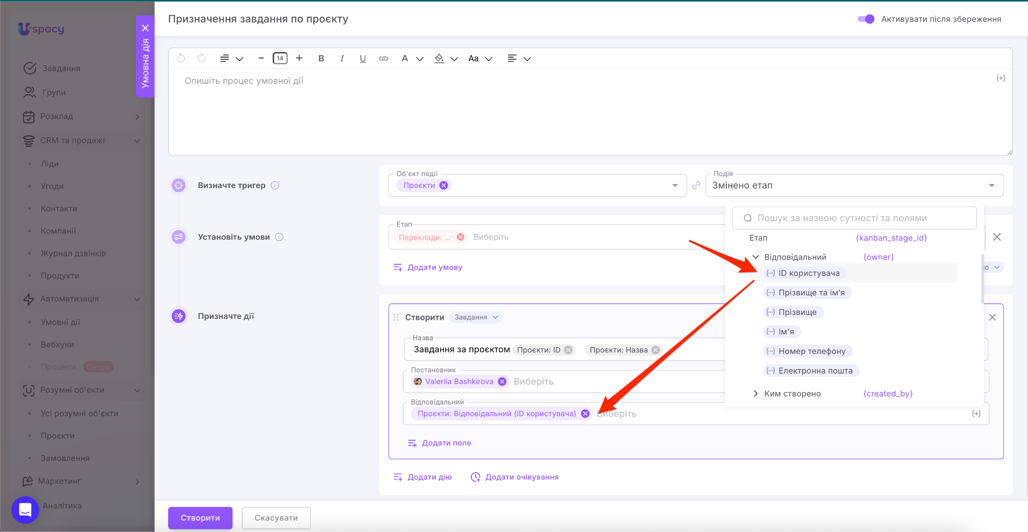 Аналогічно до полів прив’язки до сутностей, для поля типу Користувач (наприклад, Відповідальний) під час перенесення значення через умовну дію потрібно підставляти ID користувача, а не його ім’я/прізвище.