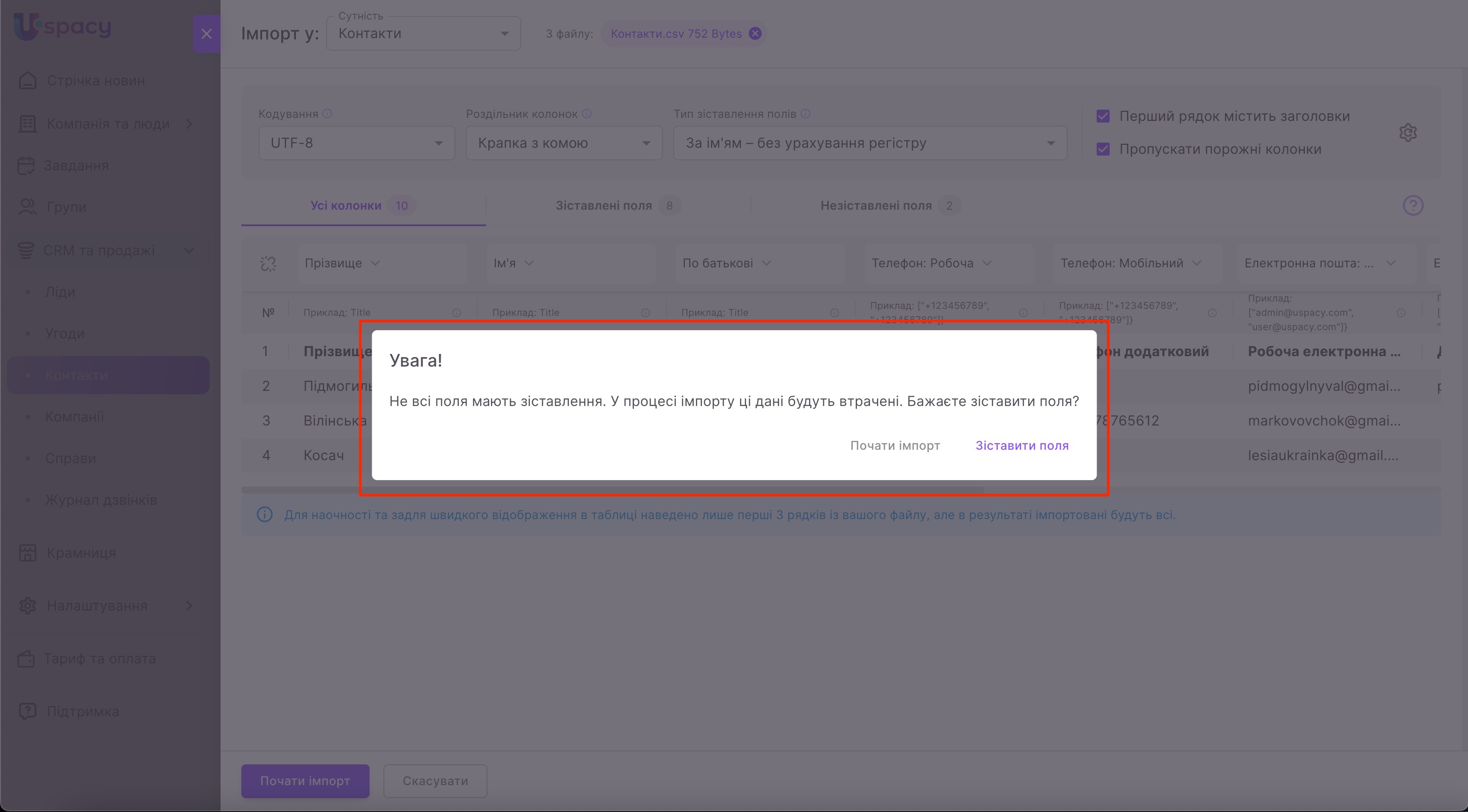 Тобто, якщо вам зручніше прописувати всі дані контакту в одній комірці, тоді зіставляйте цей стовпчик файлу з полем у Uspacy Назва.