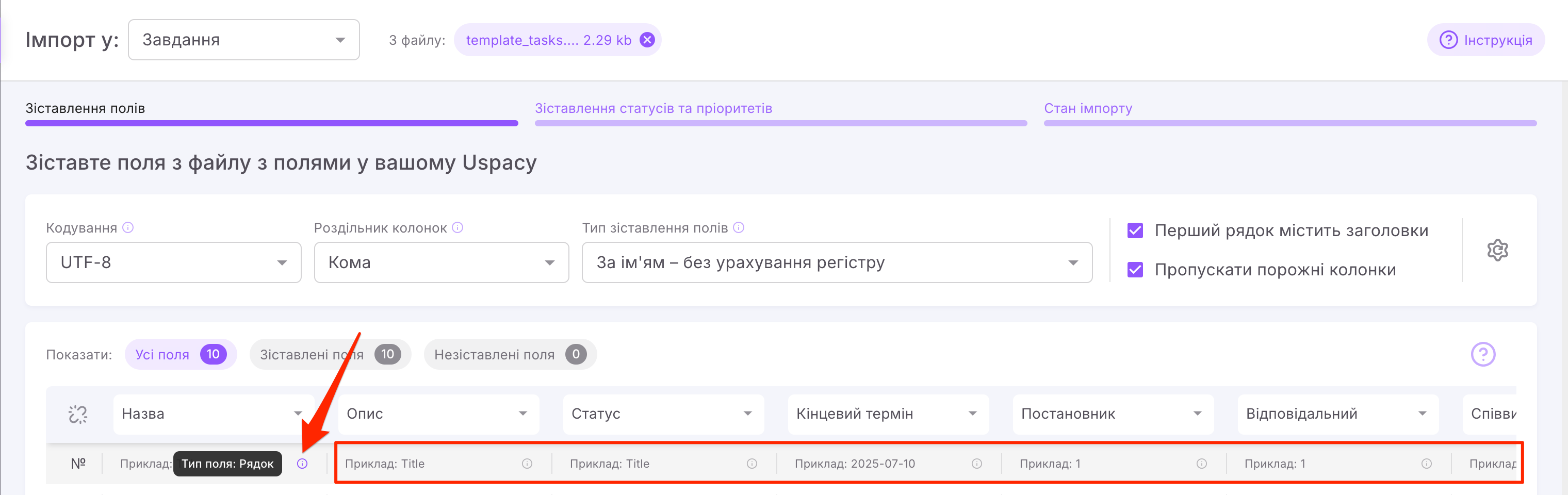 Для успішного імпорту потрібно зіставити поля з файлу з полями в завданнях Uspacy. Система робить це автоматично. Але деякі поля зіставляє одразу за потрібними значеннями.