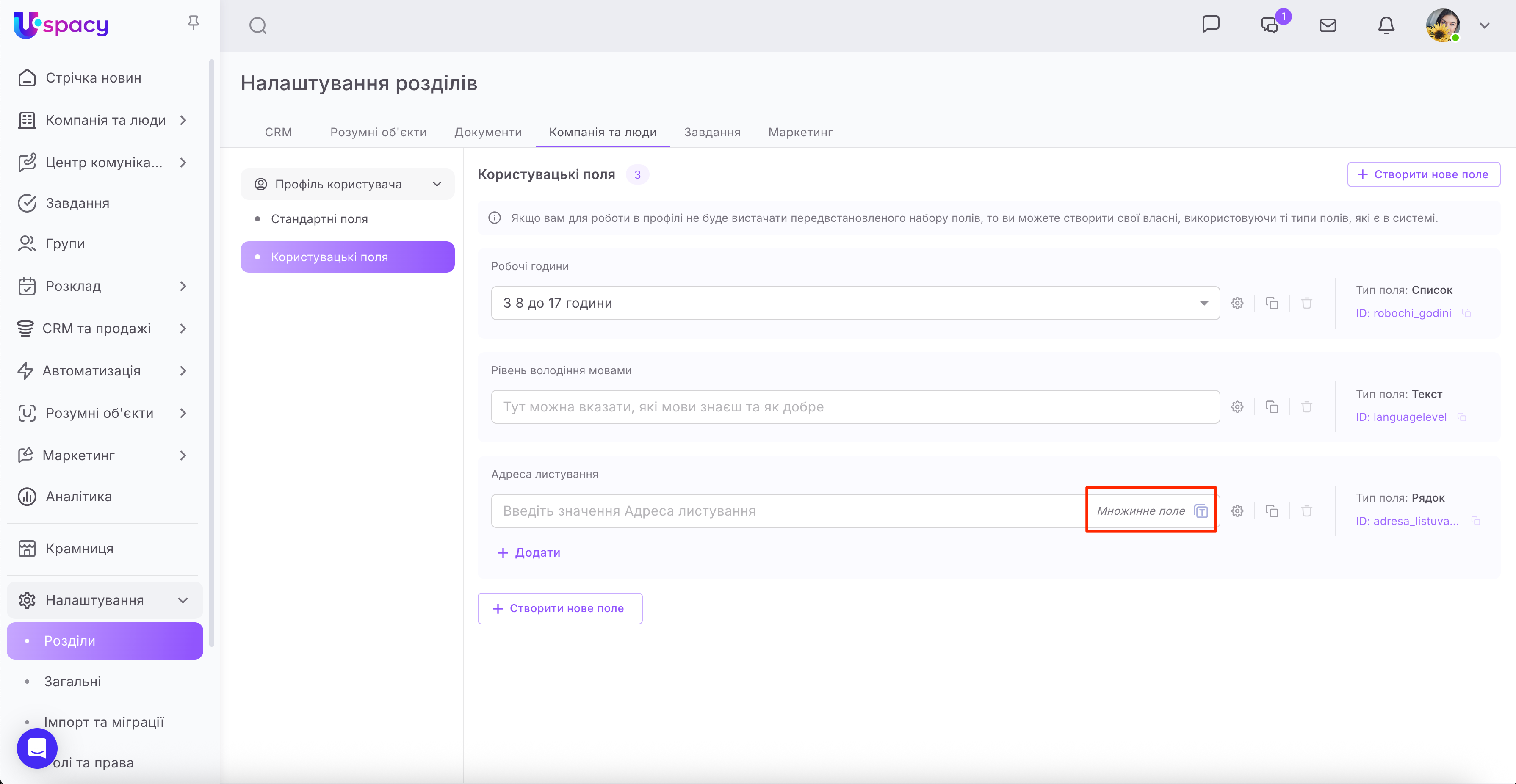 ❗️Доступ до створення та налаштування користувацьких полів має лише адміністратор і власник Простору.