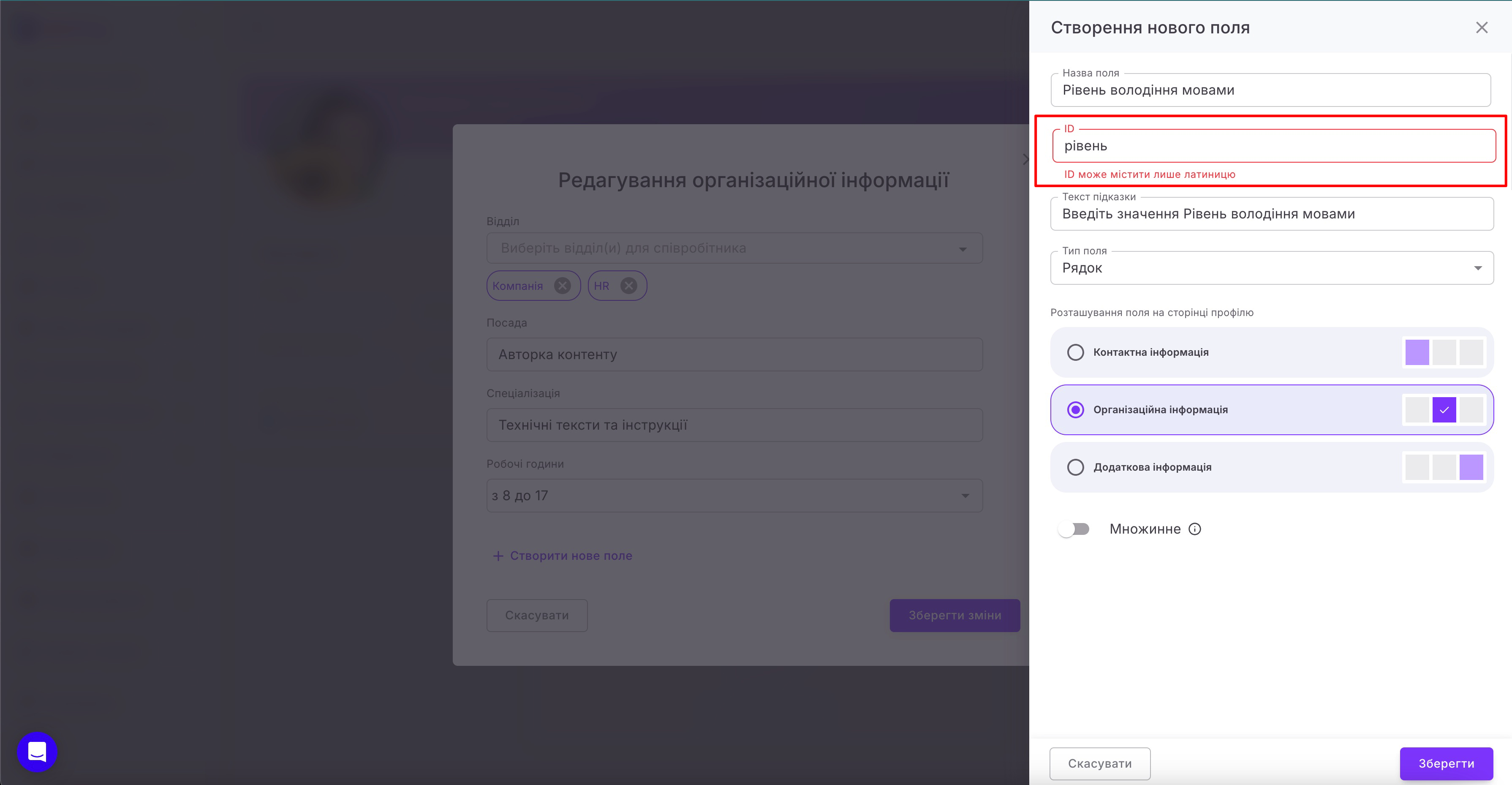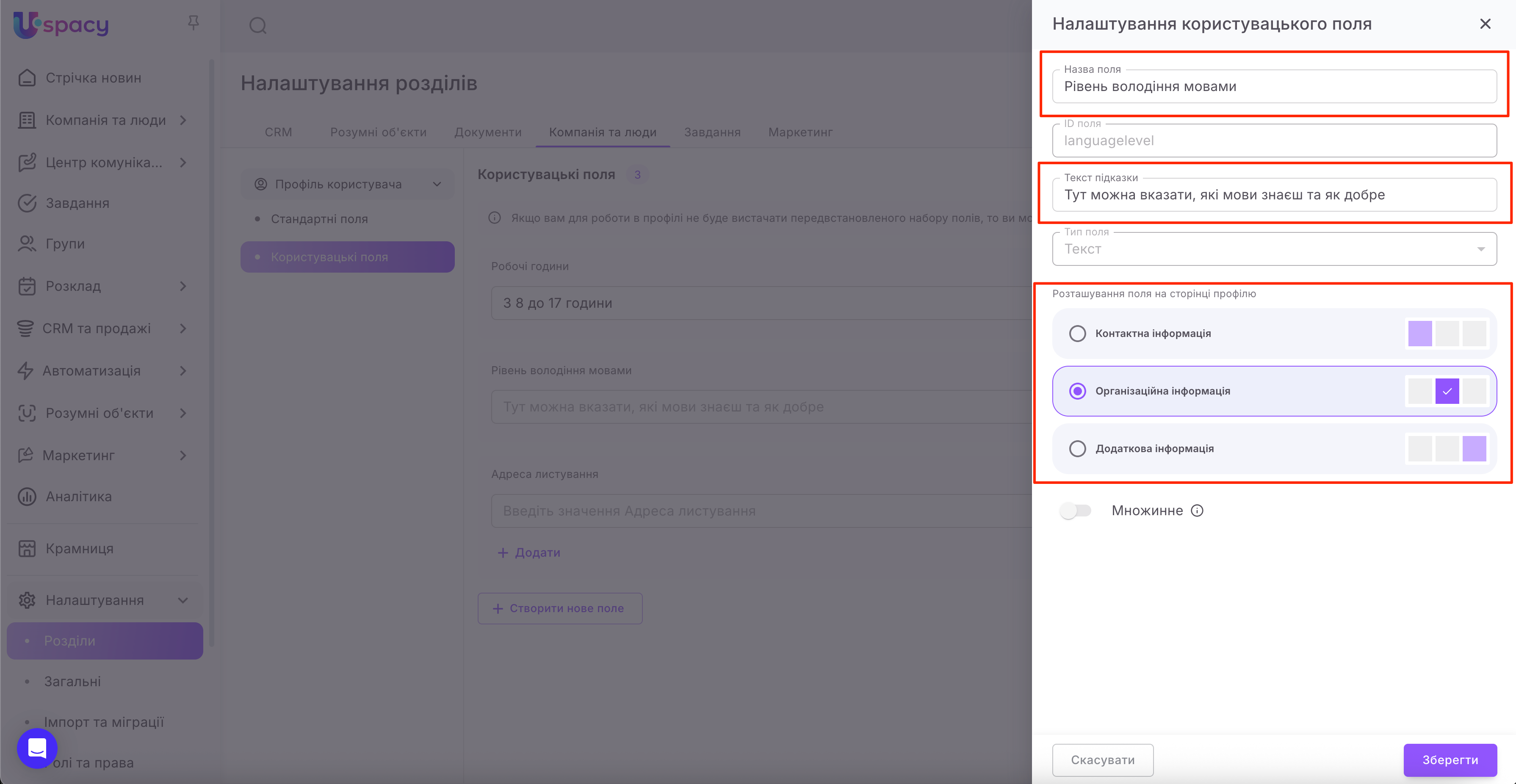 Також створене поле буде збережено в переліку користувацьких полів на сторінці Налаштувань.