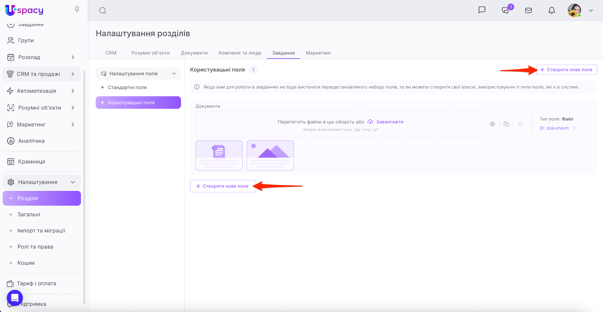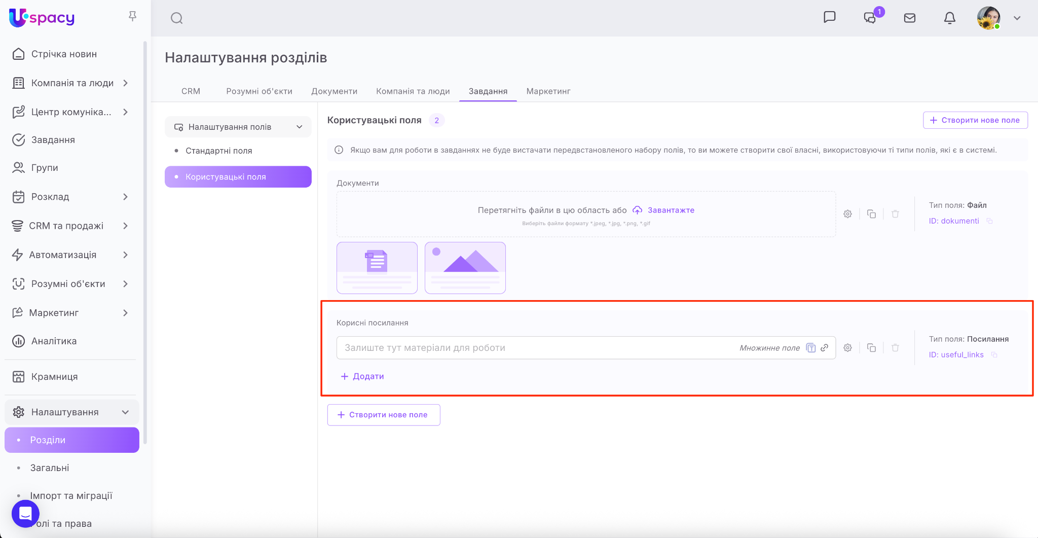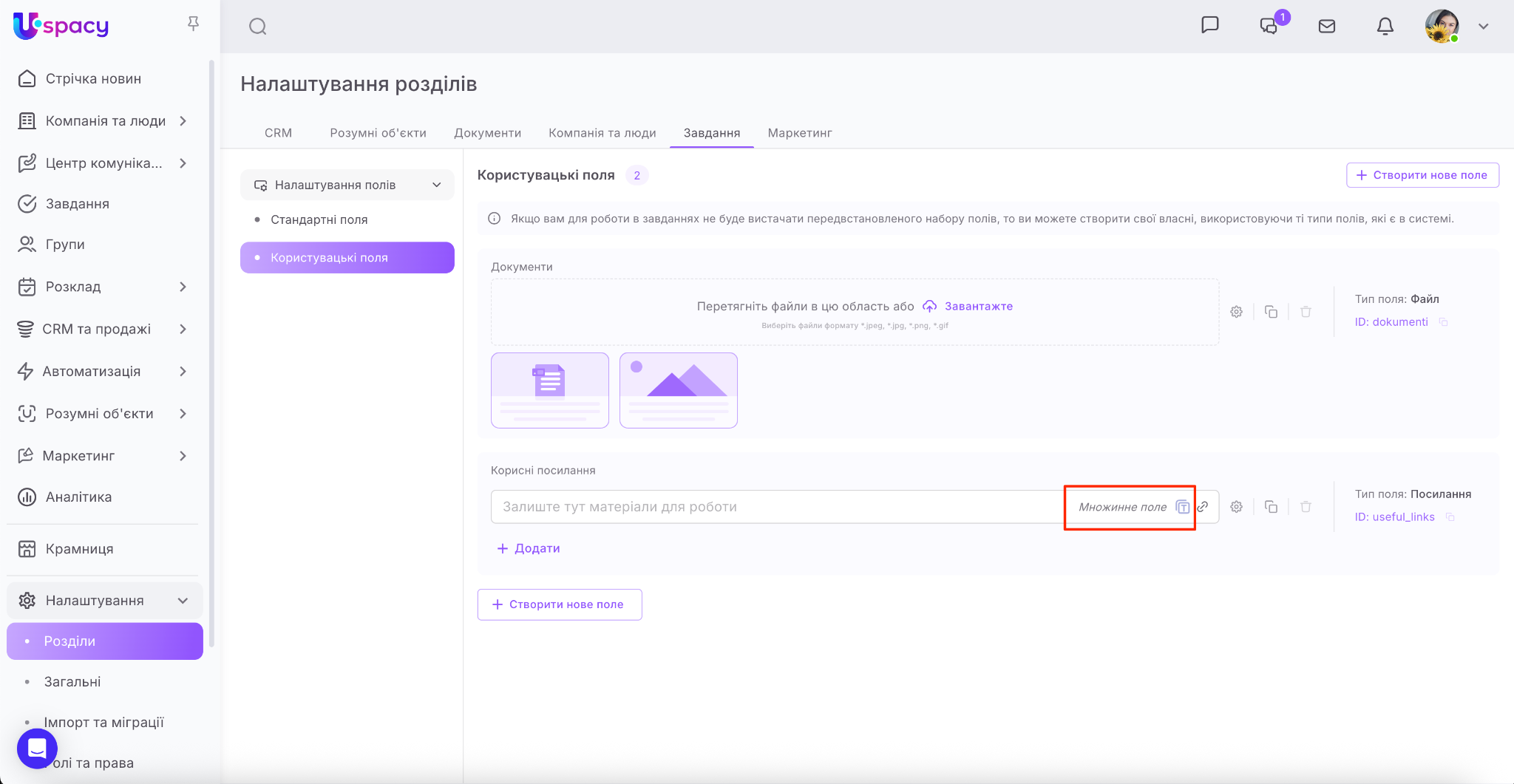 ❗️Доступ до створення та налаштування користувацьких полів має лише адміністратор і власник Простору.