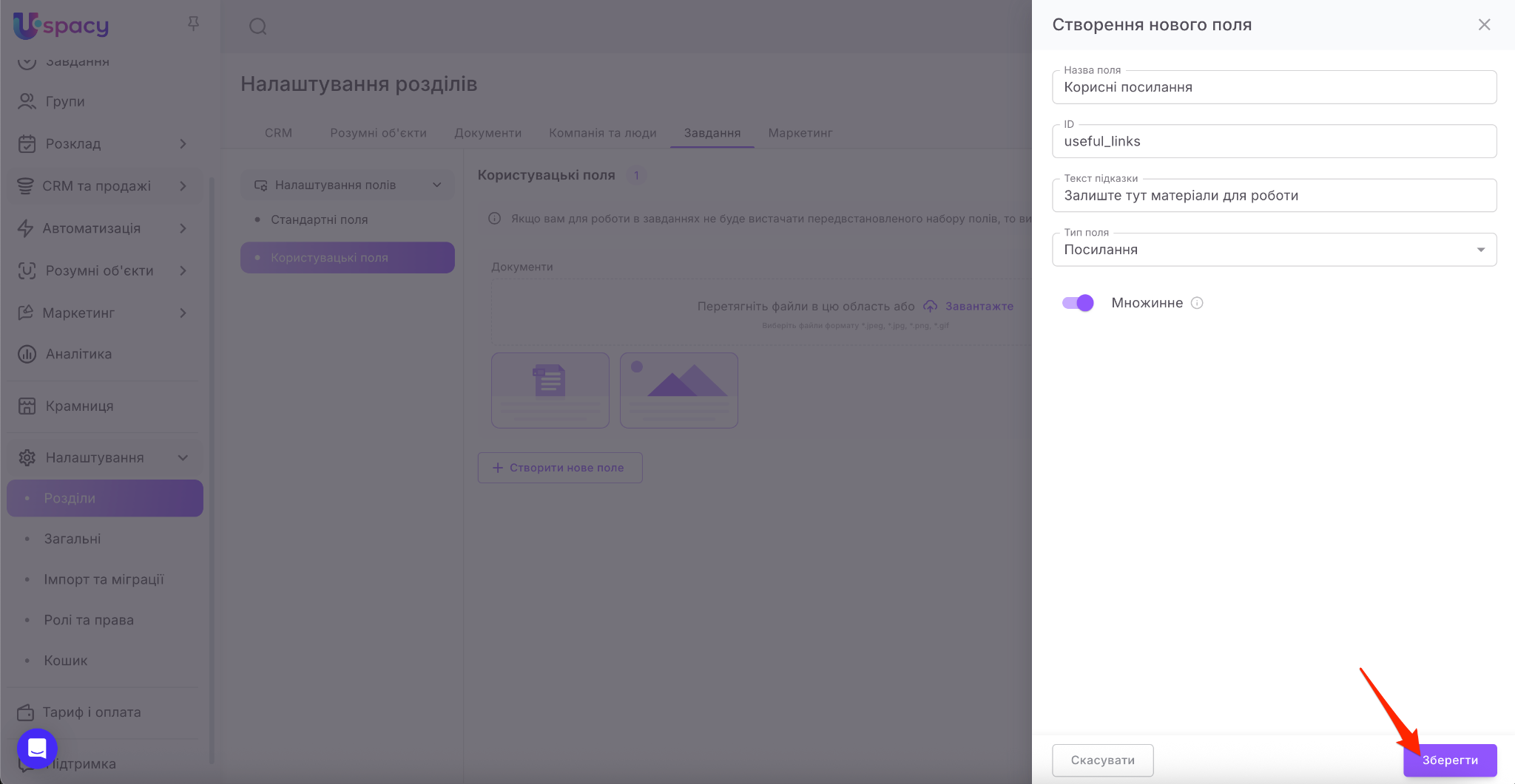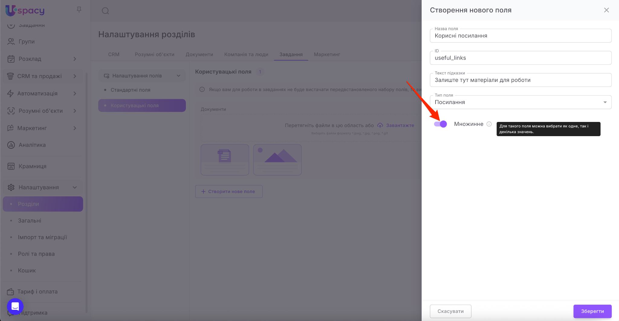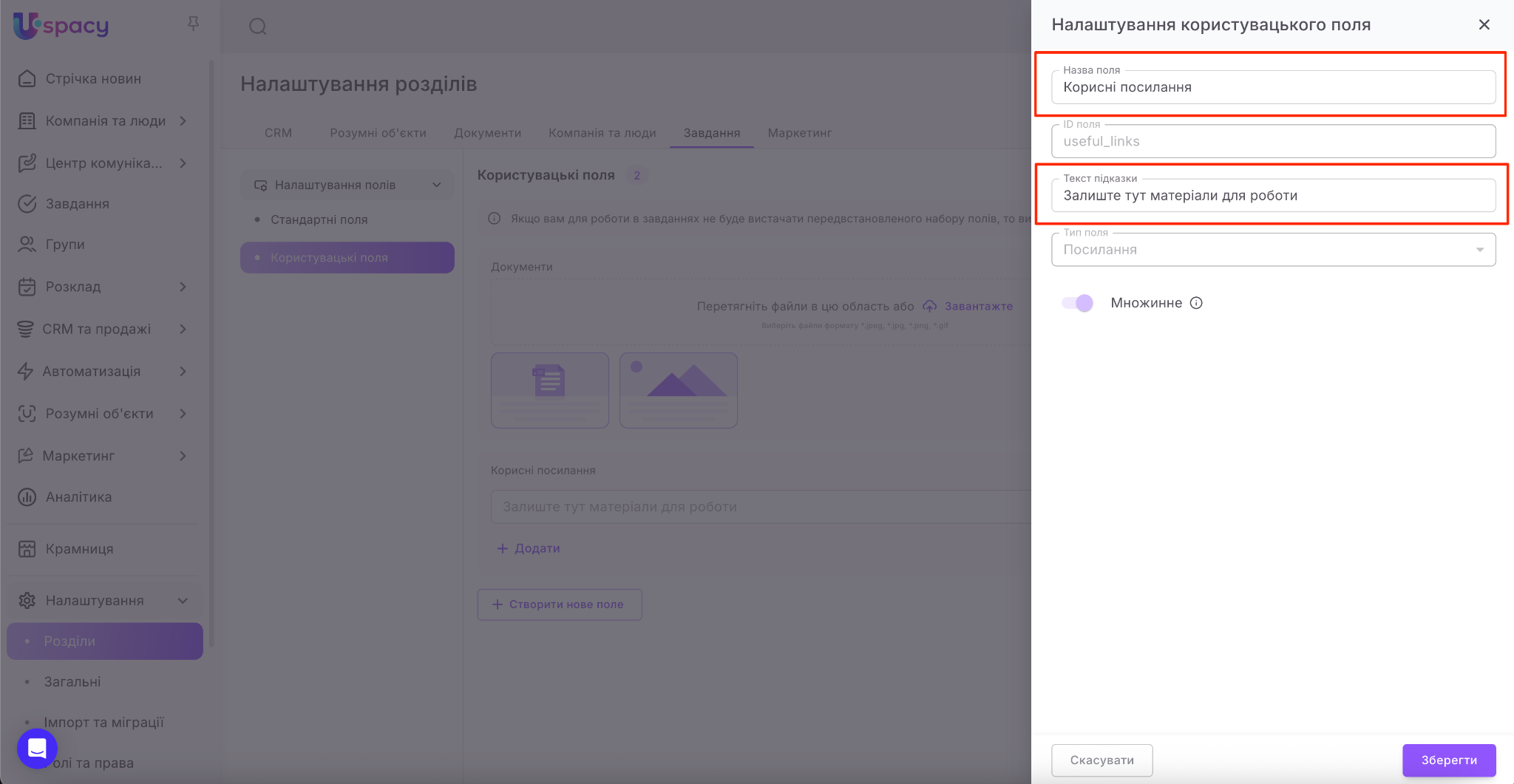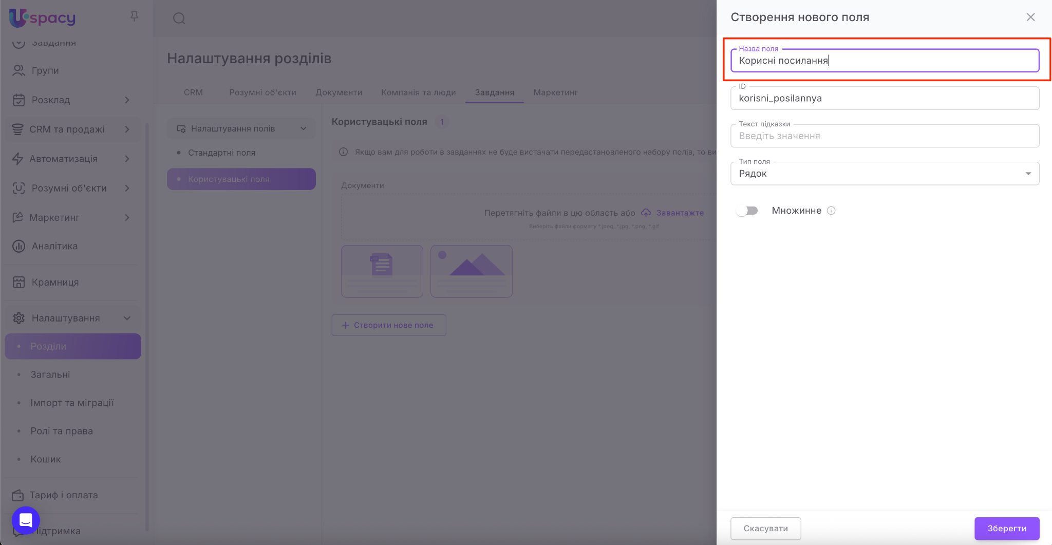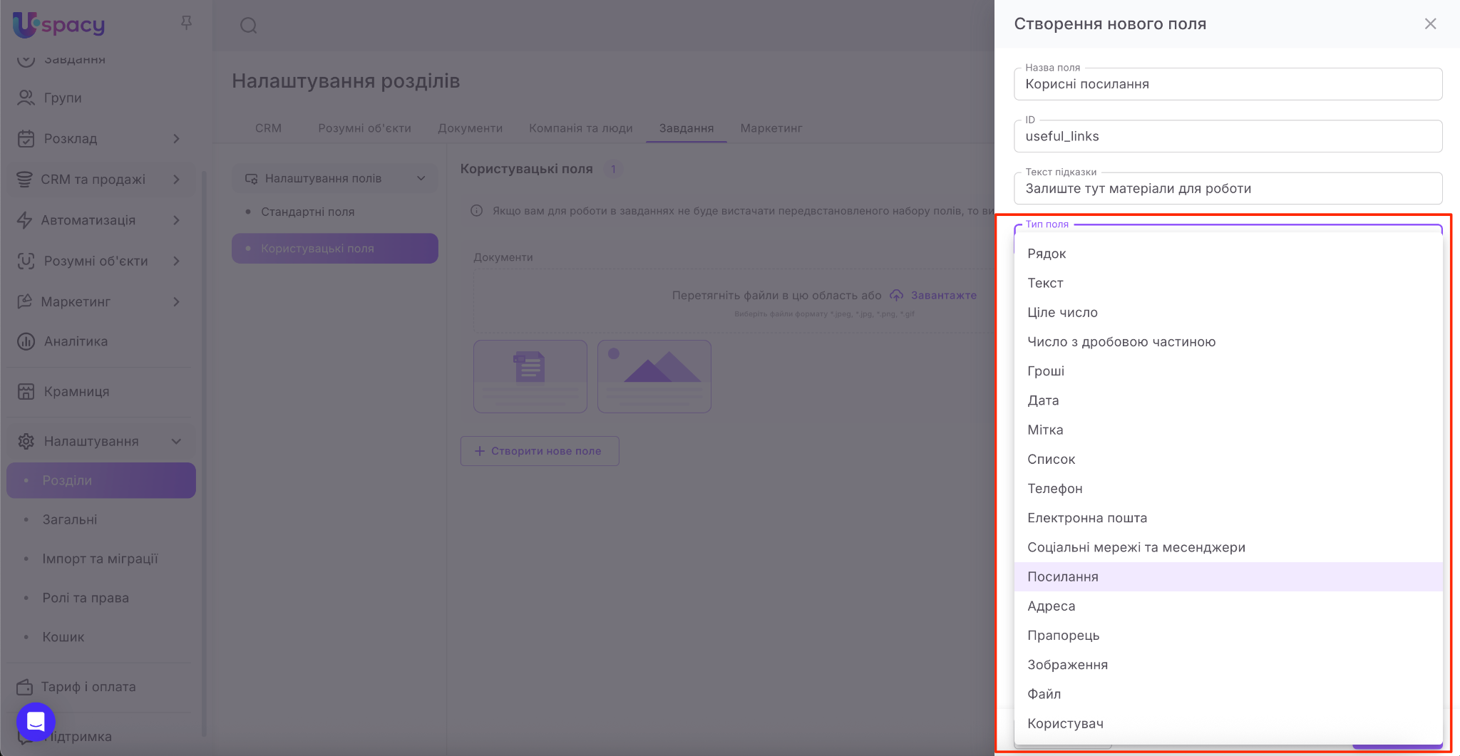 💡 Для завдань передбачений майже такий самий перелік типів полів як і для CRM. Недоступним є тільки тип Прив’язка до сутності (не можна вибрати зі списку).
