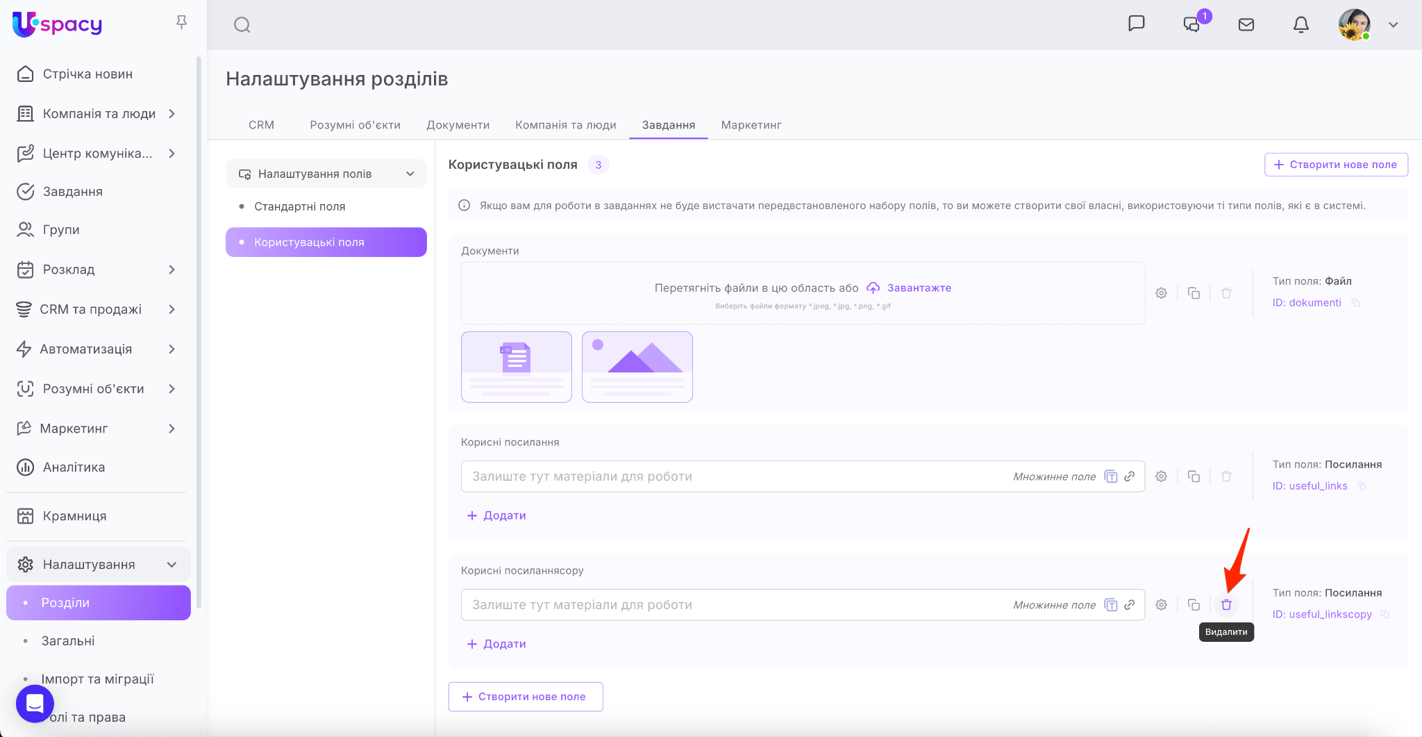 На відміну від стандартних полів, користувацькі можна видаляти. Для цього досить лише натиснути на значок кошика. Поле відразу зникне з переліку.