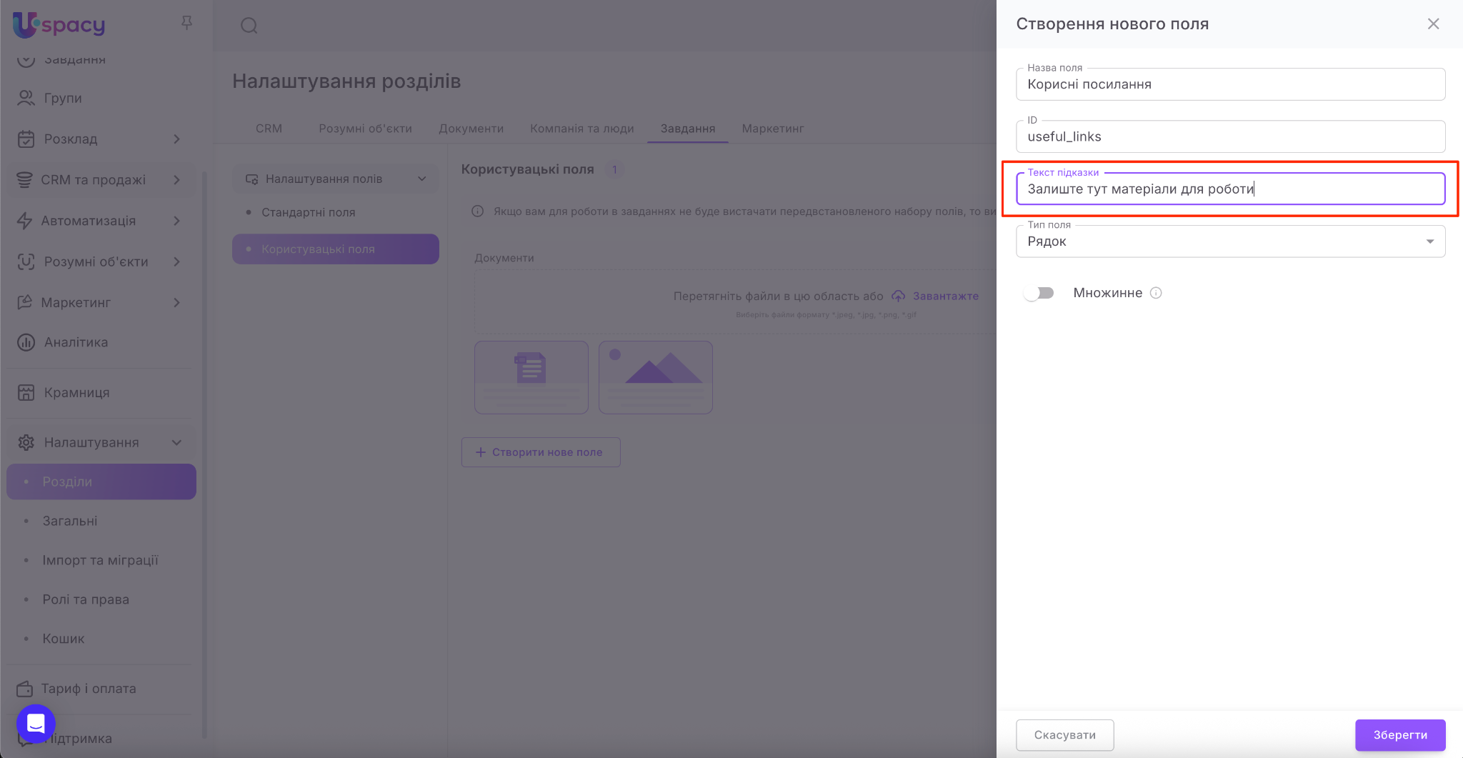 Потім придумайте Текст підказки. Це допоміжна фраза, яка зорієнтує користувача при заповненні поля у картці завдання.