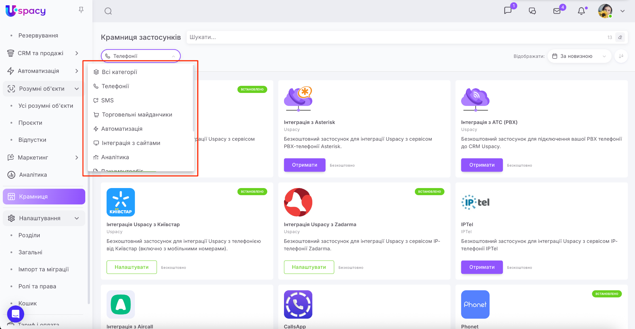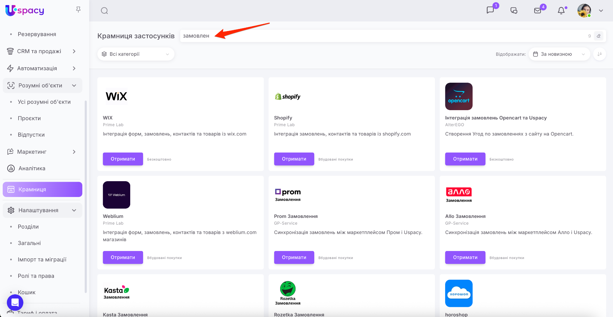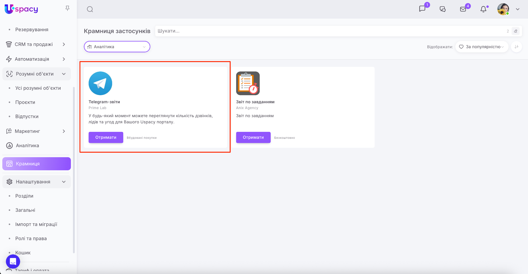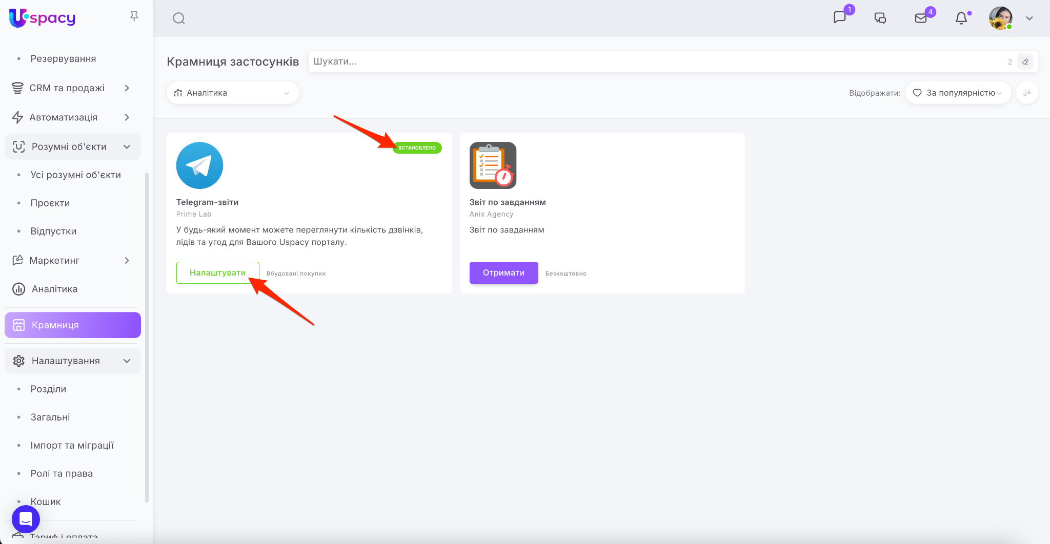 Крамниця в Uspacy – це маркетплейс застосунків для розширення можливостей вашого Простору. Тут ви знайдете інтеграції для комунікацій, продажів, роботи з документами, оплат та автоматизації.