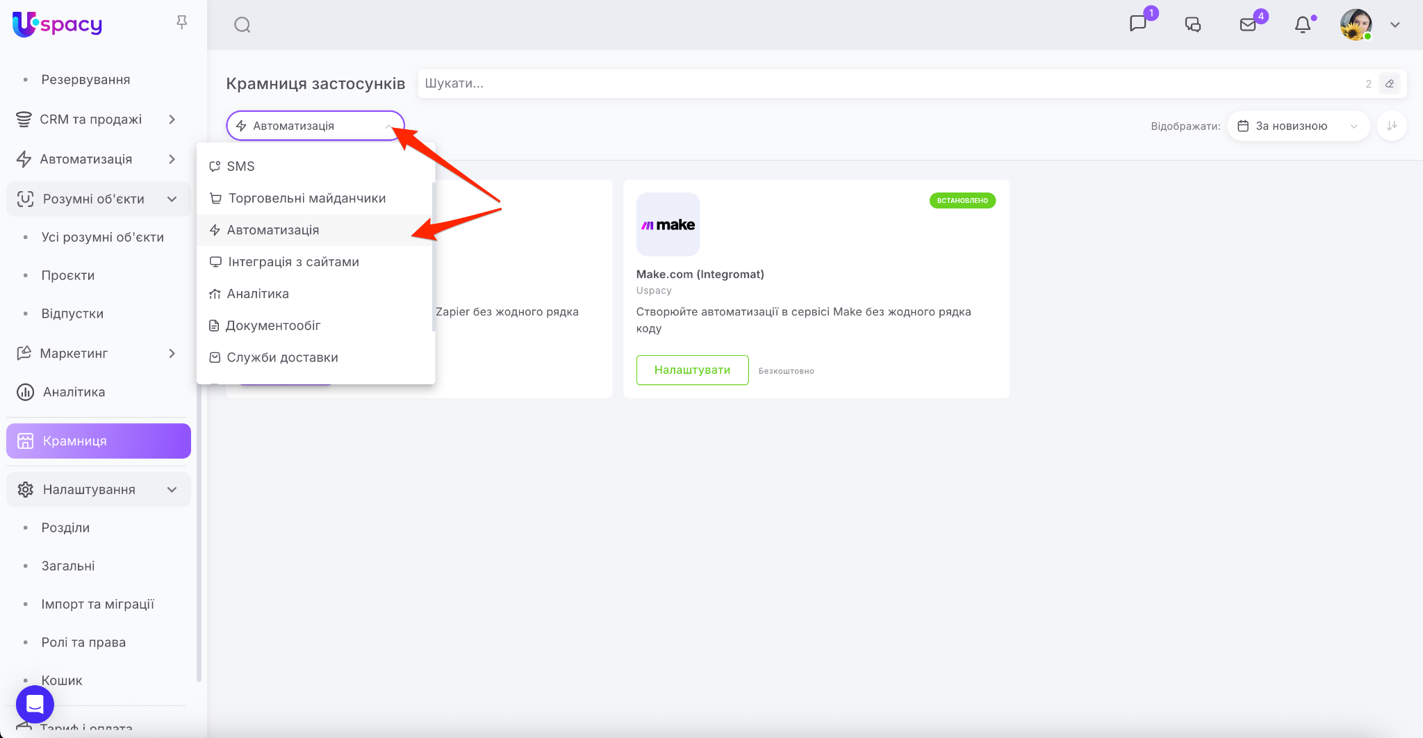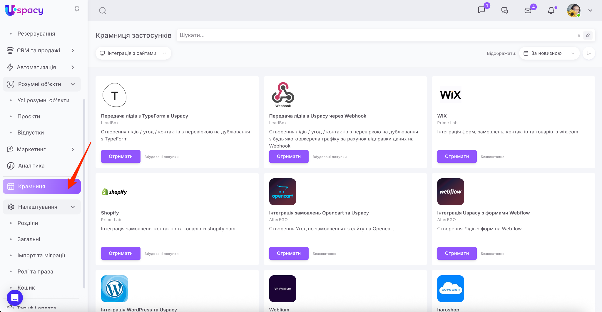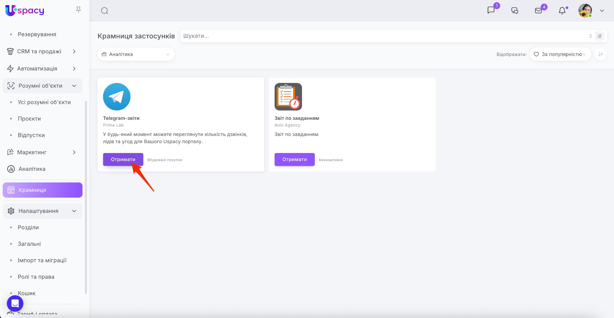 Крамниця в Uspacy – це маркетплейс застосунків для розширення можливостей вашого Простору. Тут ви знайдете інтеграції для комунікацій, продажів, роботи з документами, оплат та автоматизації.