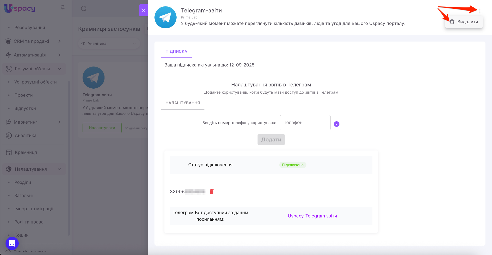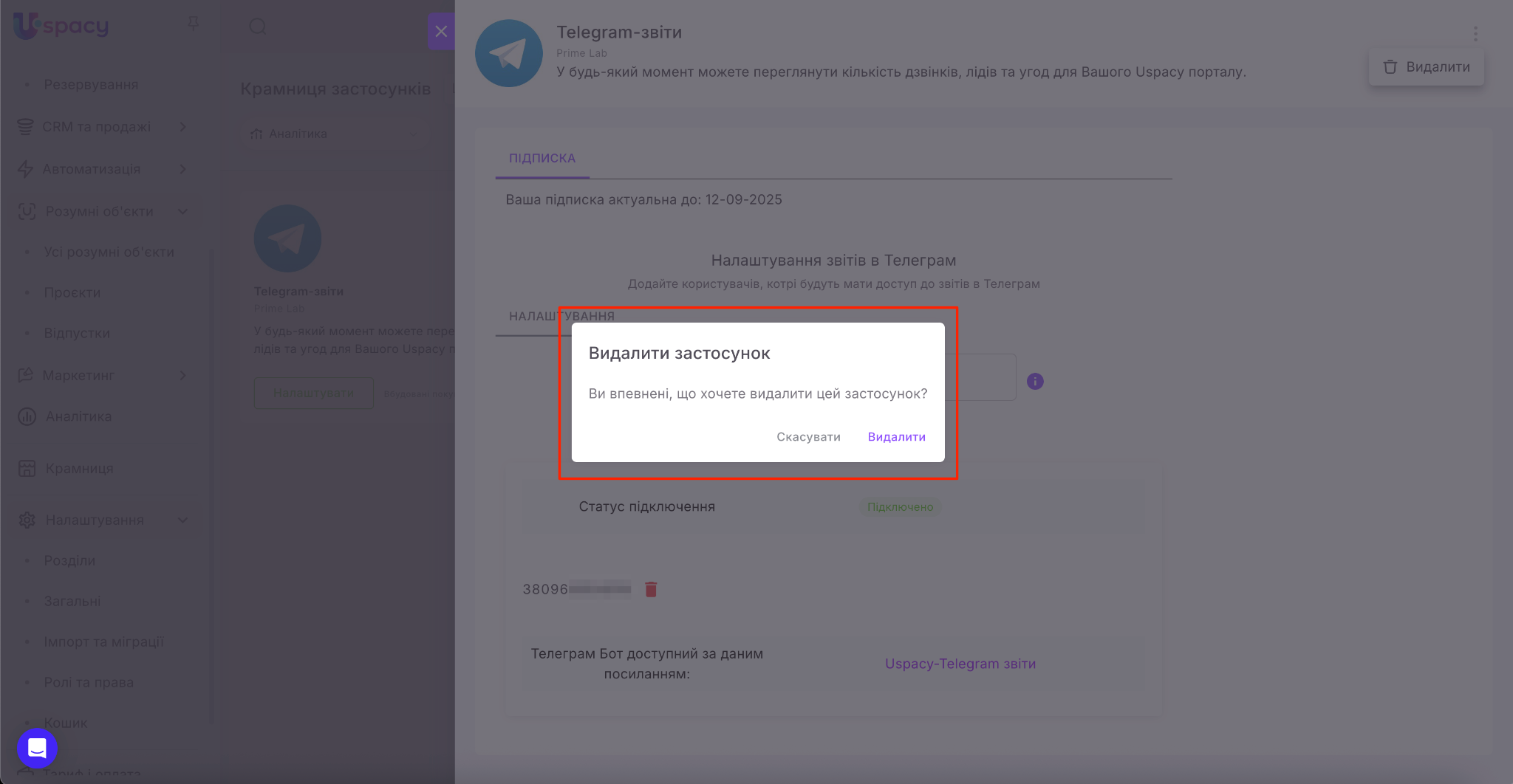 ☝🏻Зверніть увагу, видалення від’єднує інтеграцію від Простору та очищує її параметри в Uspacy. Якщо застосунок пов’язаний із платним стороннім сервісом та має в ньому активні підписки, вимкніть їх у цьому сервісі окремо, оскільки оплата за користування здійснюються на його боці.