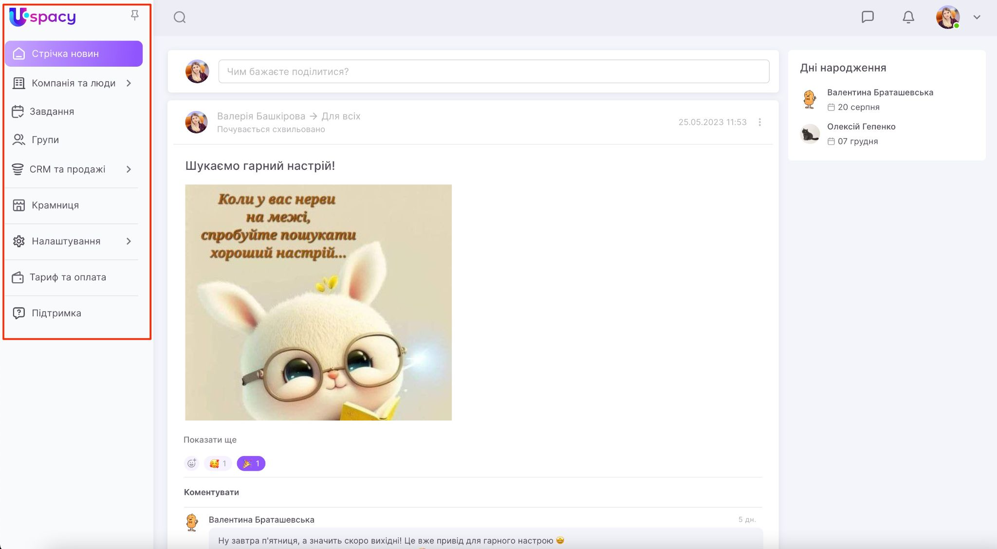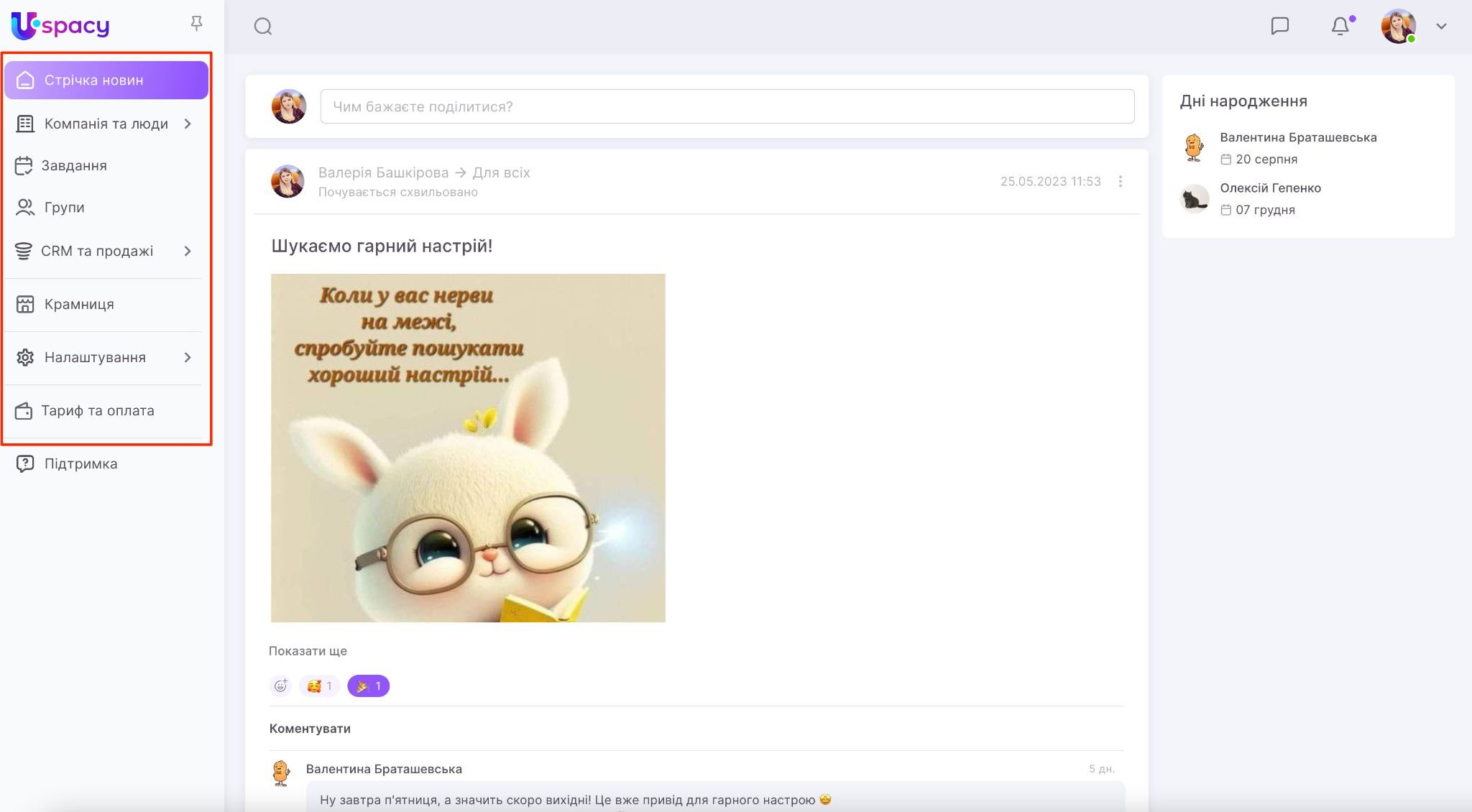 На даному етапі у лівому меню є 8 основних розділів: Стрічка новин, Компанія та люди, Завдання, Групи, CRM та продажі, Крамниця, Налаштування, Тариф та оплата. Деякі з них мають розгалужену структуру, тобто поєднують в собі декілька інструментів (підрозділів).