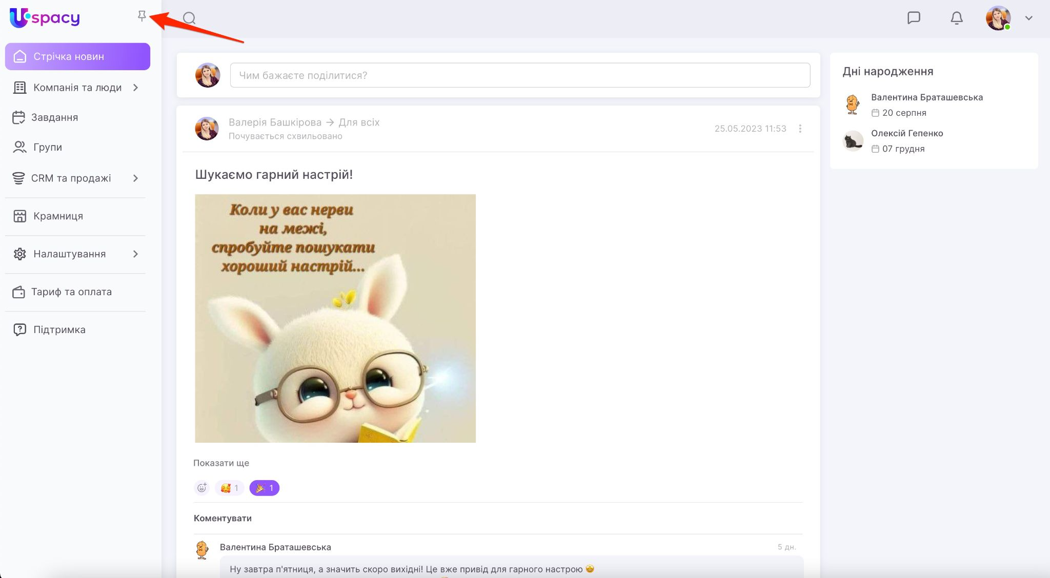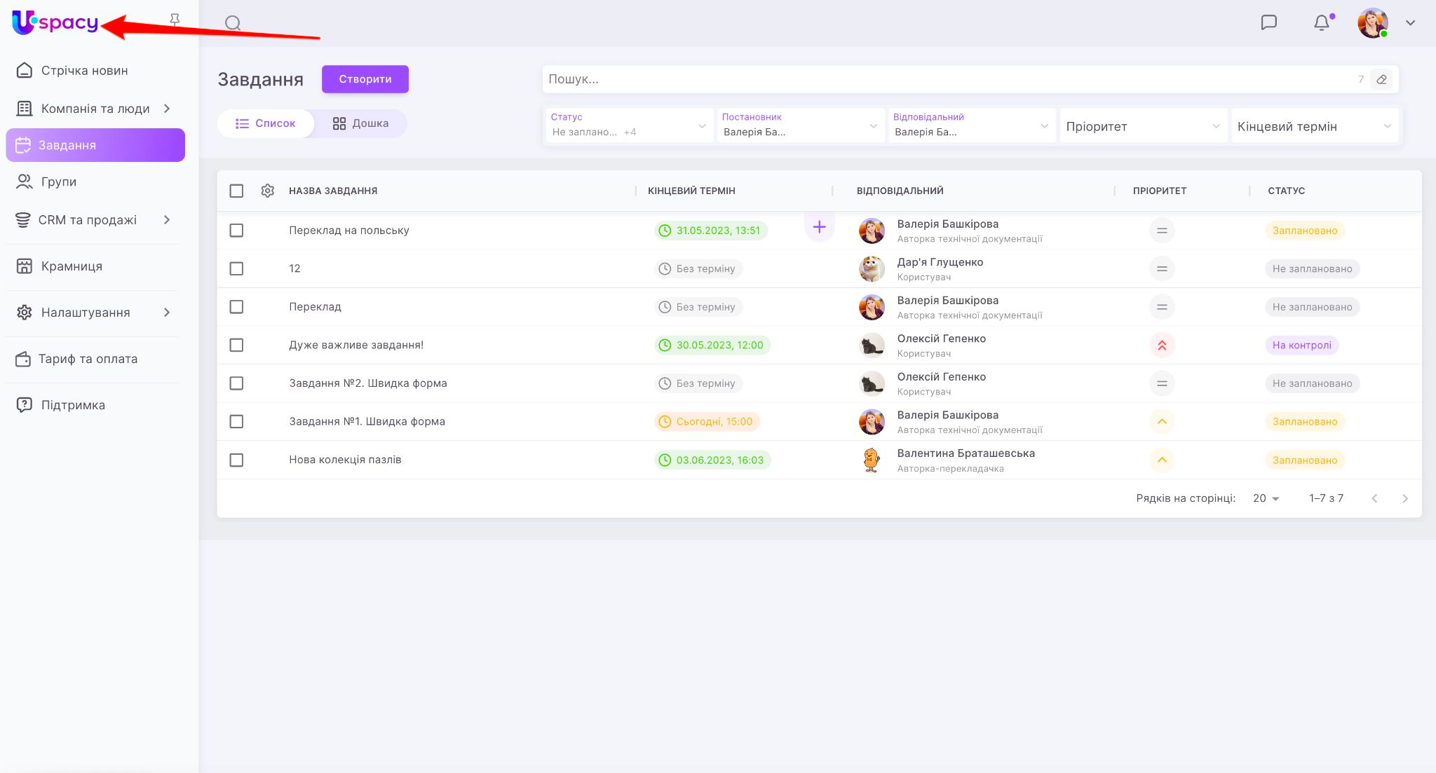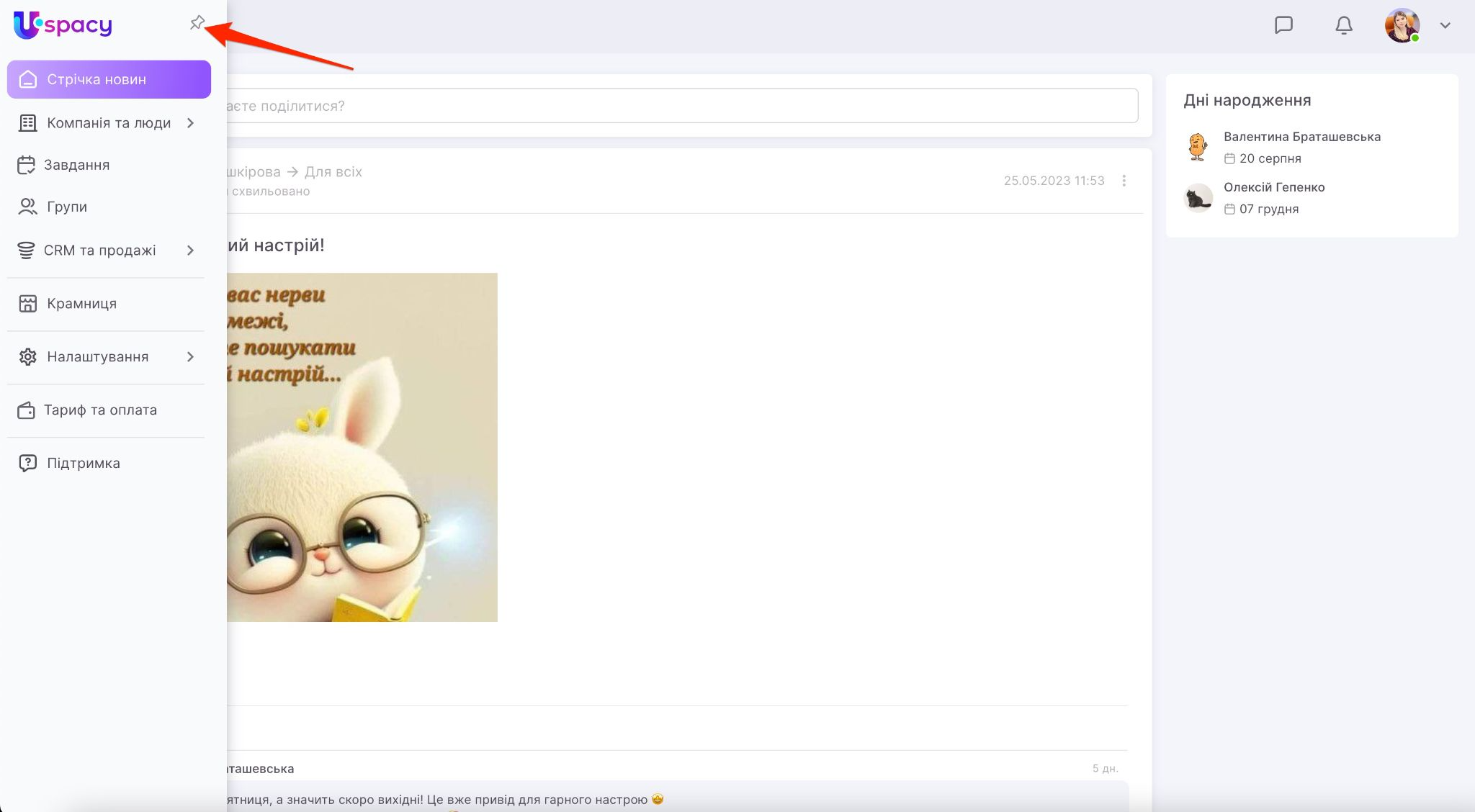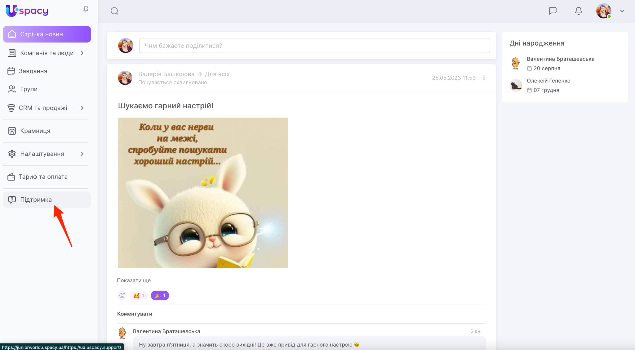 Крім того, у Лівому меню міститься посилання на перехід до сайту підтримки Uspacy.