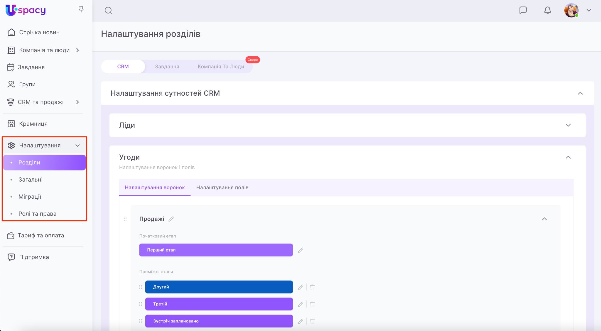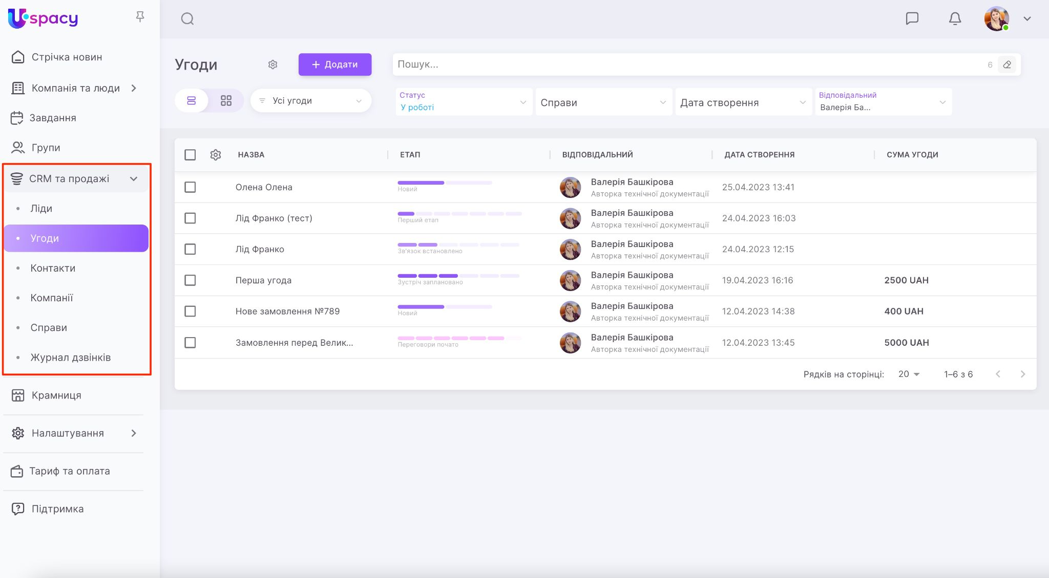А в СRM та продажах можна працювати з Лідами, Угодами, Контактами, Компаніями, Справами та Журналом дзвінків.