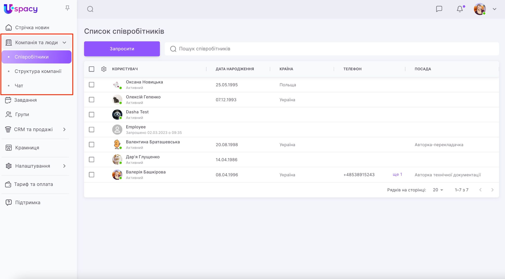 Наприклад, розділ Компанія та люди передбачає роботу зі Списком співробітників, структурою компанії та Чатами.