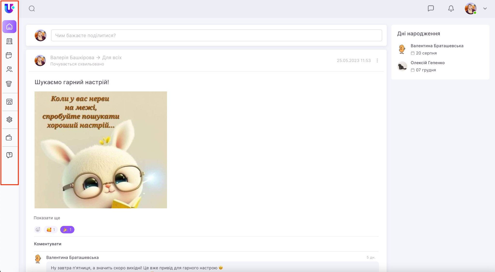 Також над розділами лівого меню міститься логотип. Він слугує для переходу на Головну сторінку з будь-якої іншої в Просторі.
