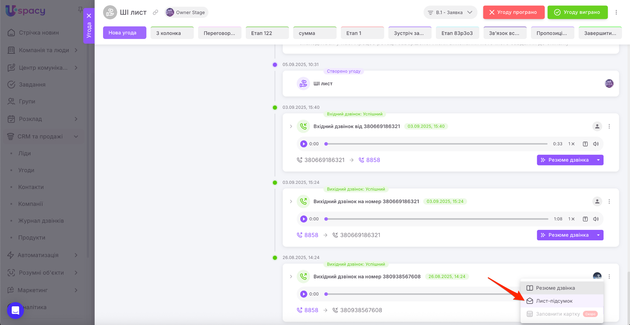 Опція Лист-підсумок допомагає швидко створювати якісні повідомлення для клієнтів після дзвінків прямо з картки CRM. Текст генерується ШІ на основі даних дзвінка, що дозволяє відобразити ключові домовленості та деталі розмови. Це економить час, підвищує ефективність комунікації та підтримує вашу професійність у взаємодії з клієнтами.