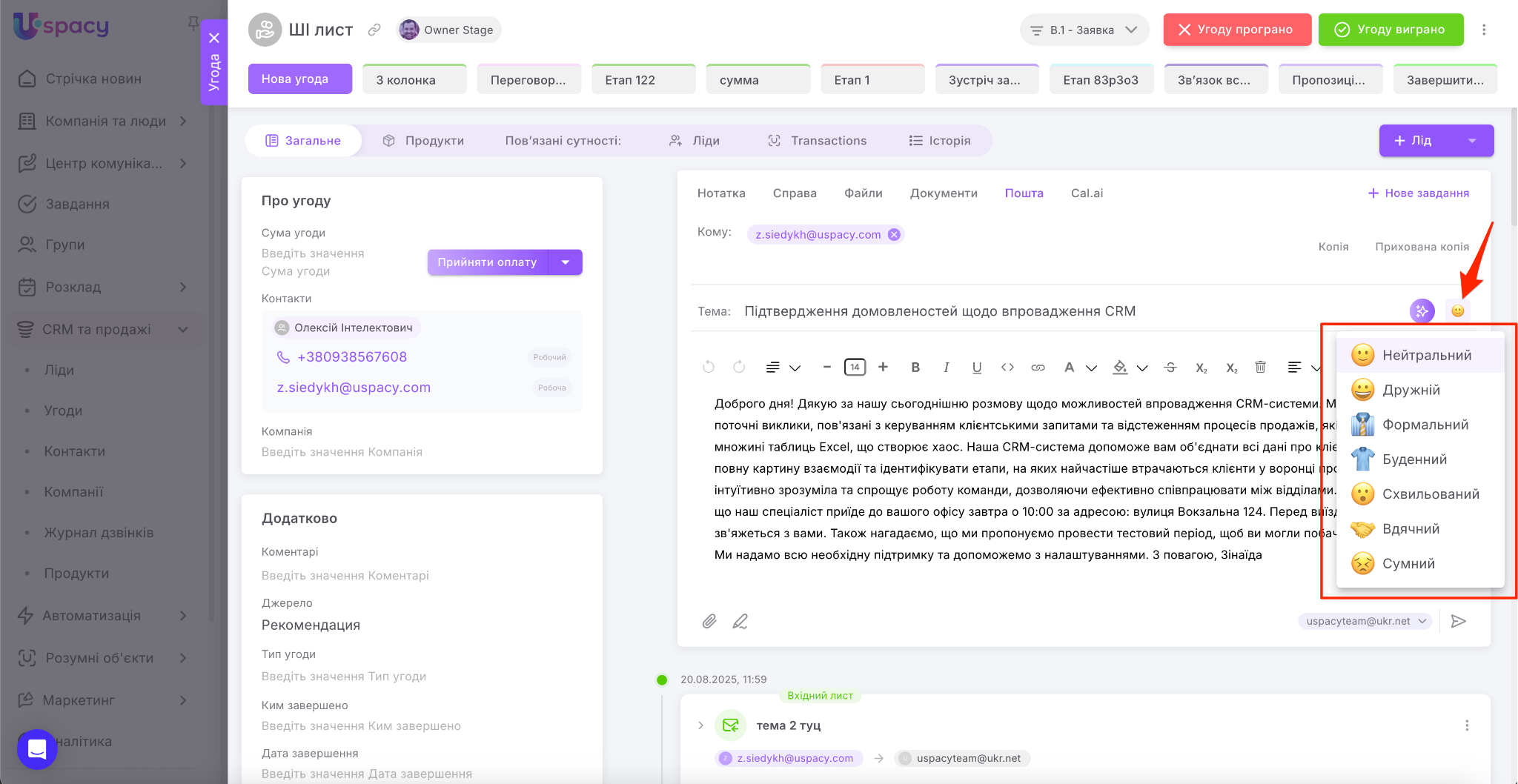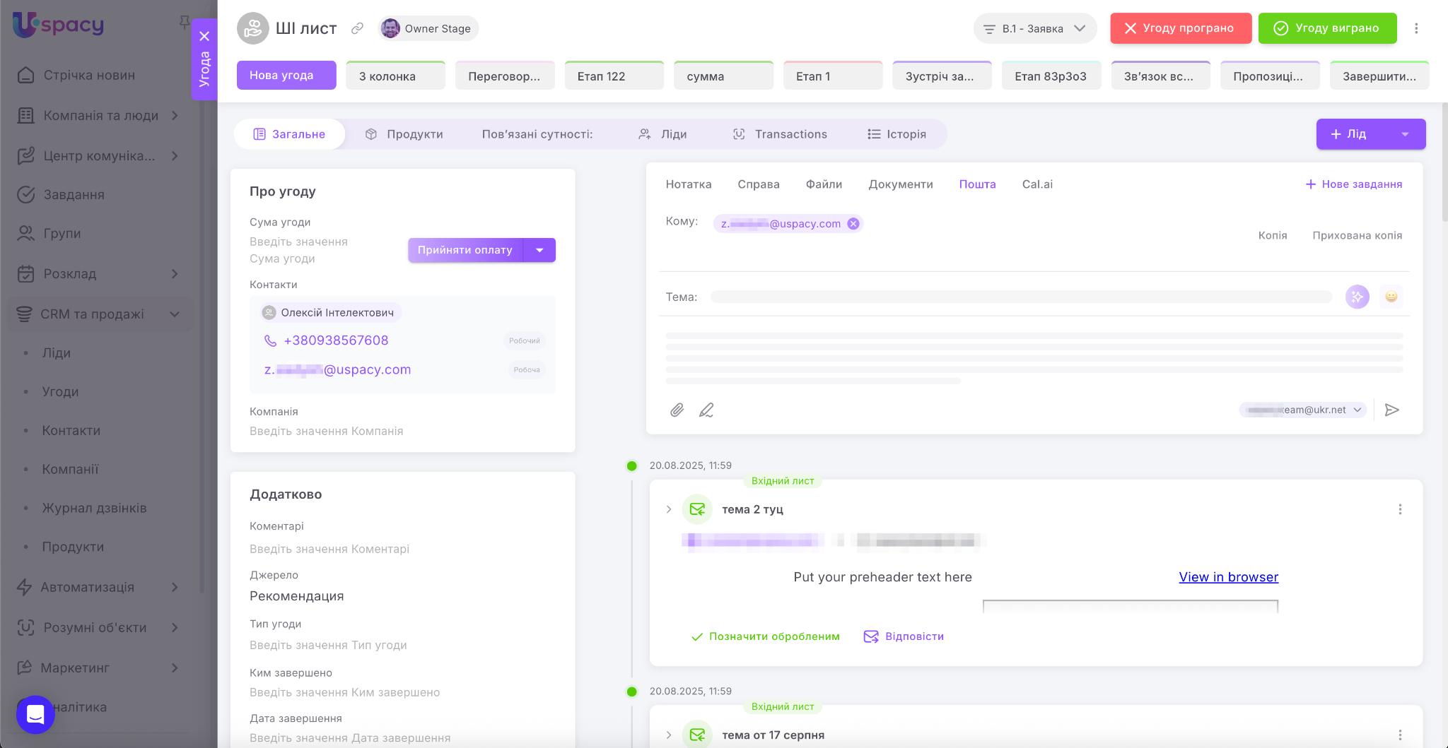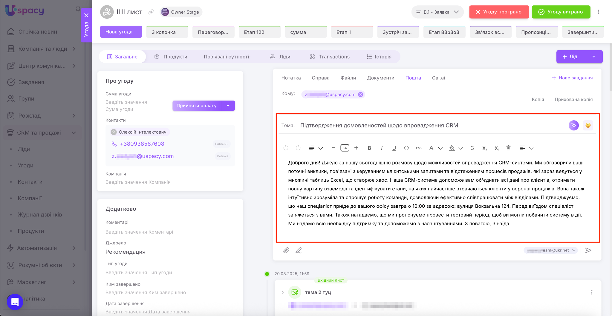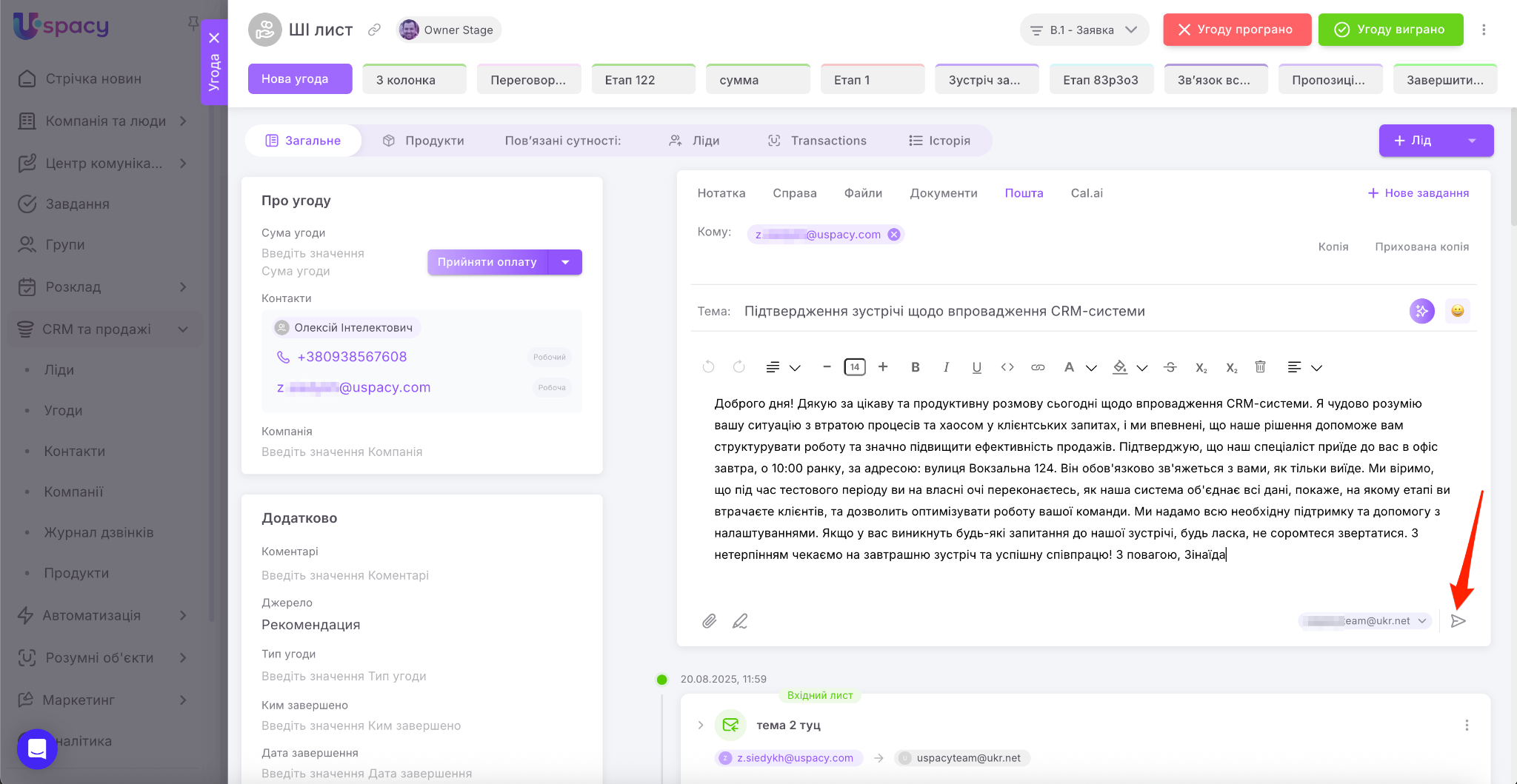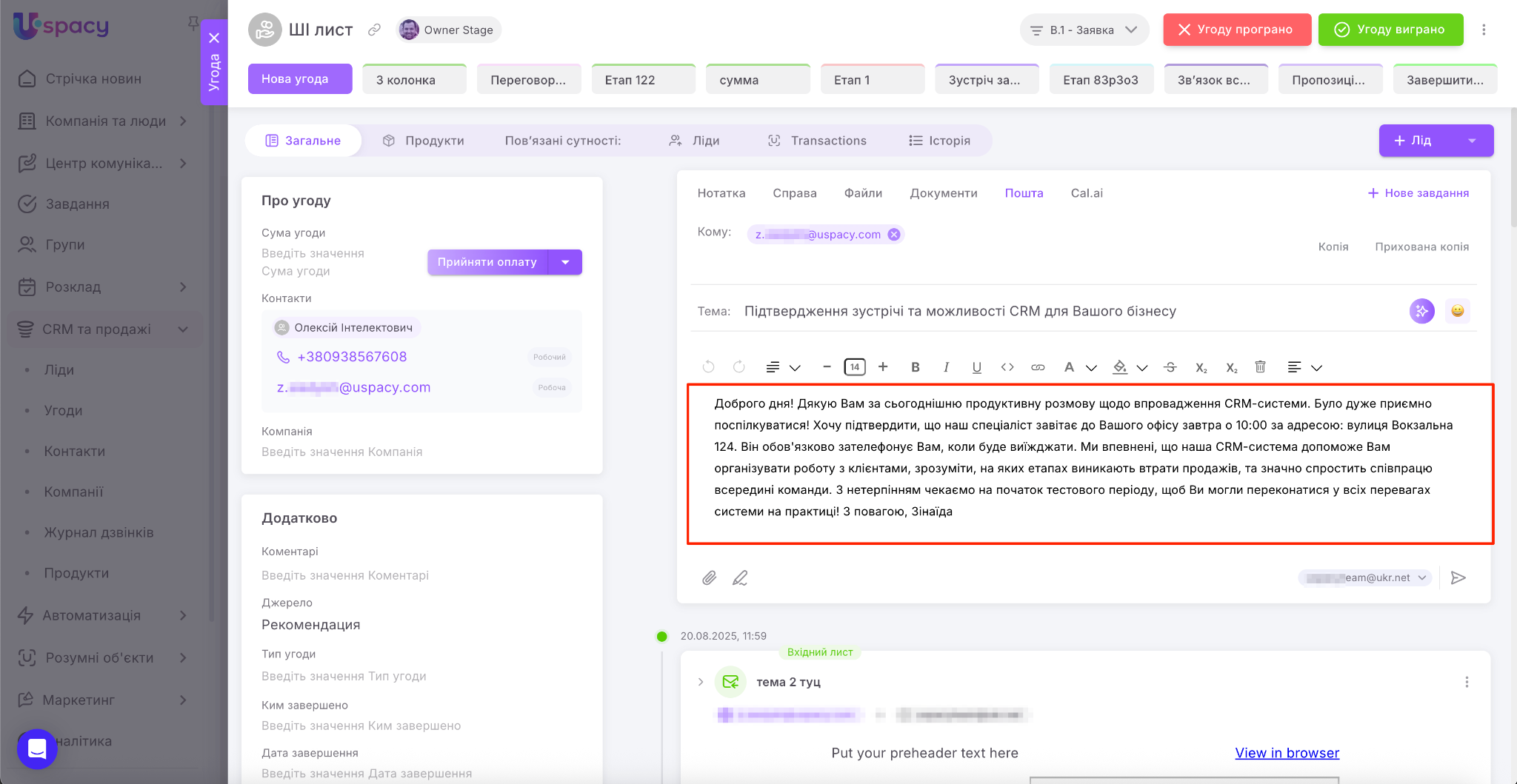 🟣 Для використання опції створення листа-підсумку обов’язково підключіть поштову скриньку до вашого робочого Простору. Якщо цього не зробити, відправлення листа буде недоступне.