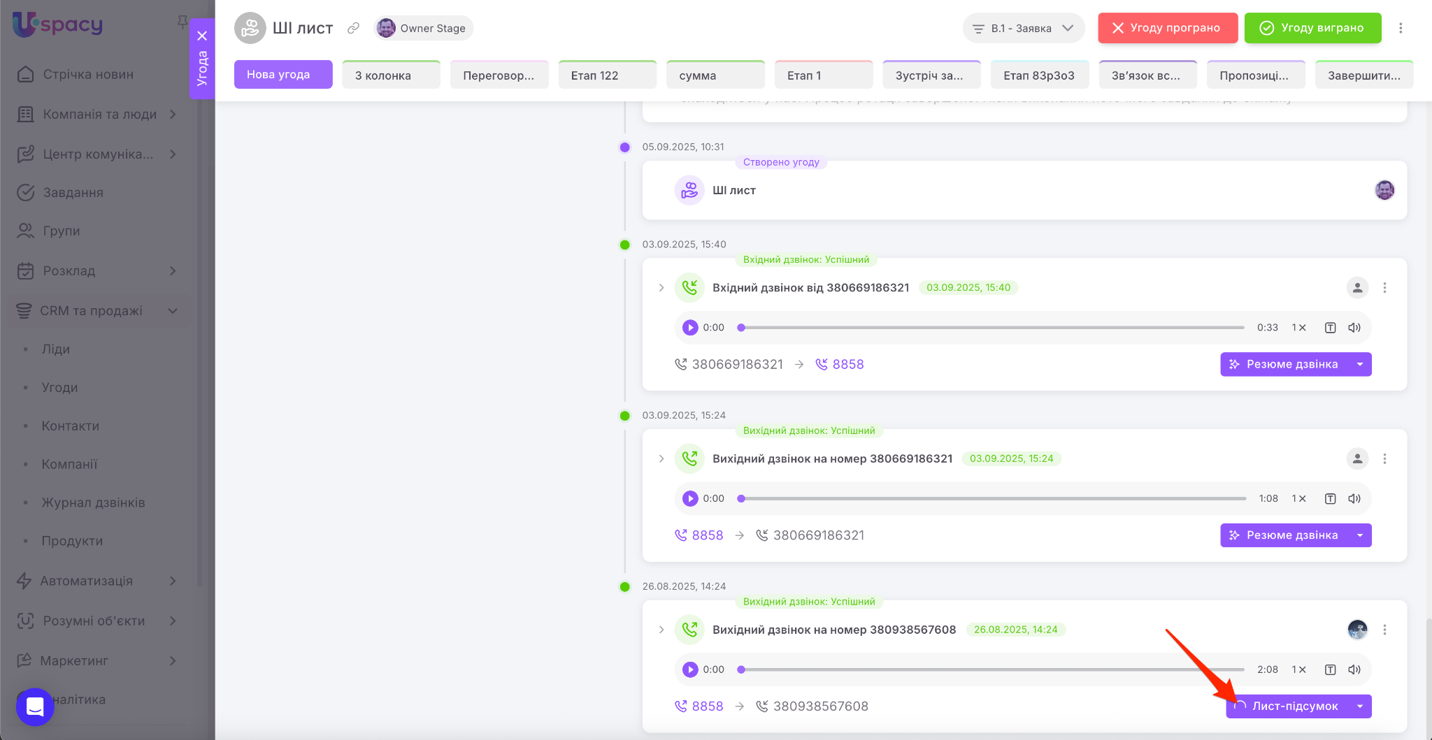 Лист-підсумок – це автоматично згенерований текст повідомлення після дзвінка, який можна надіслати клієнту. Його створює штучний інтелект на основі даних дзвінка (запису та тексту транскрибації). Це допомагає зекономити час і зробити комунікацію більш ефективною.