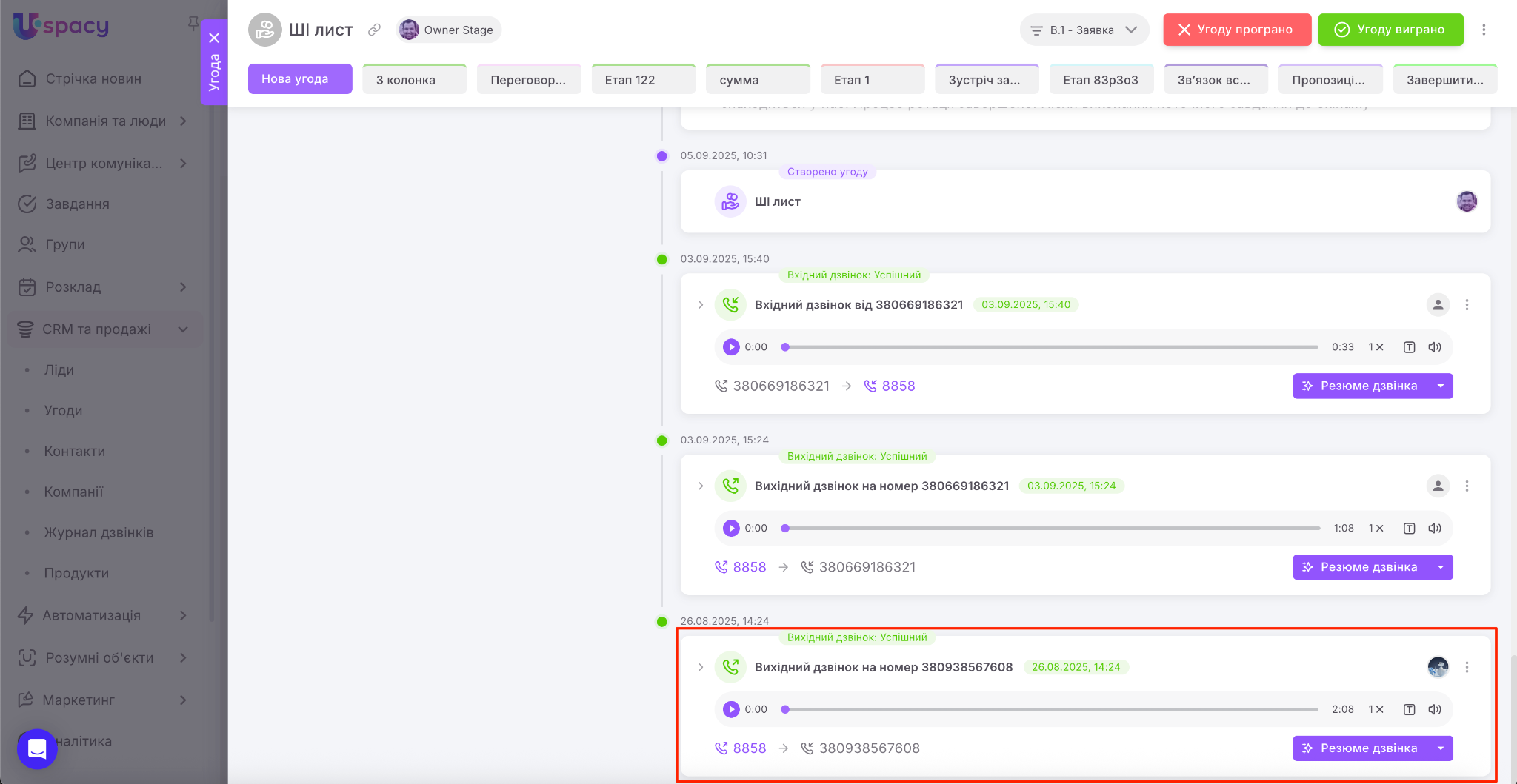 Виберіть запис дзвінка в картці потрібного елемента CRM.