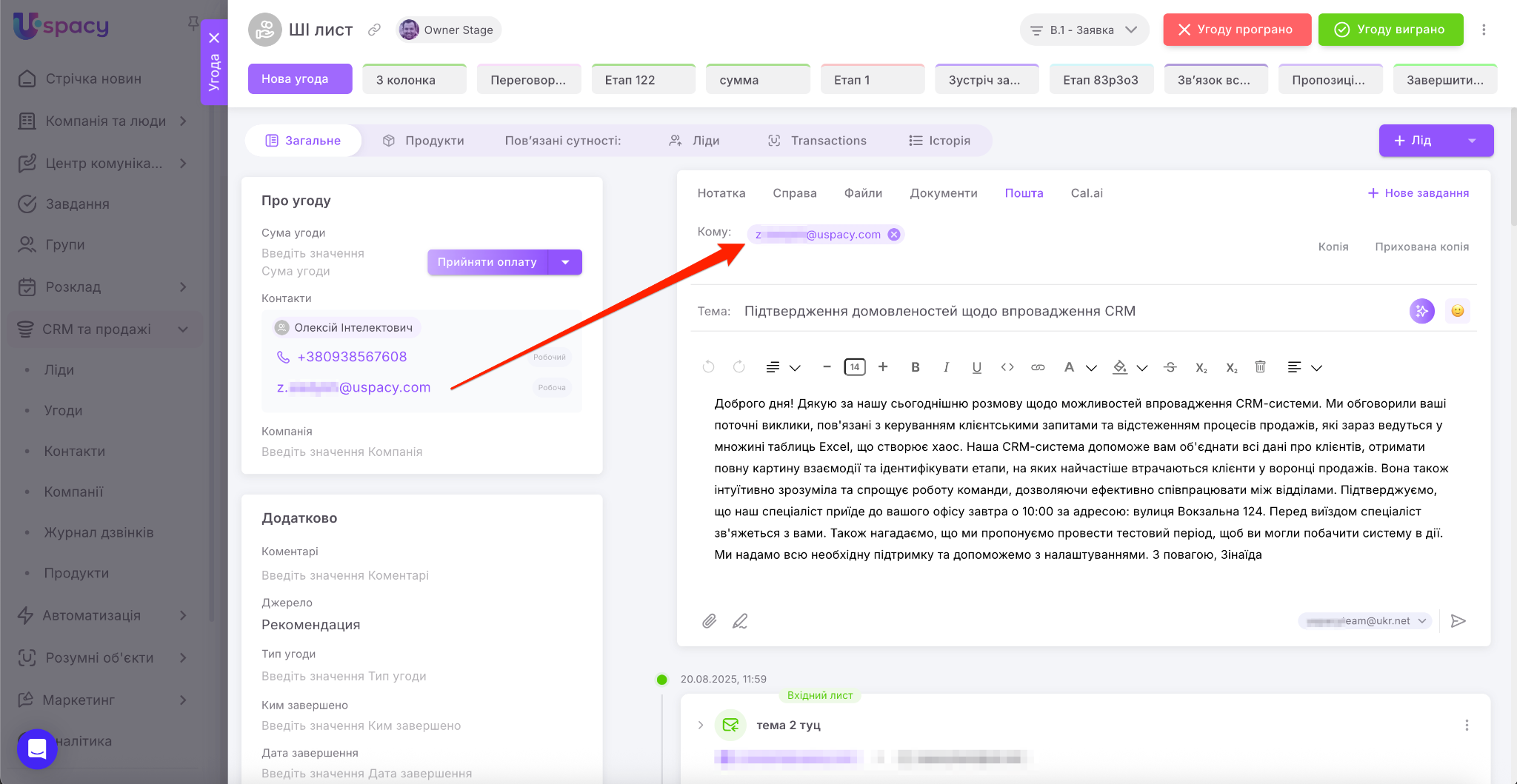 У якості отримувача листа буде підтягнута електронна пошта, яка пов’язана з контактом чи компанією й міститься в картці CRM.