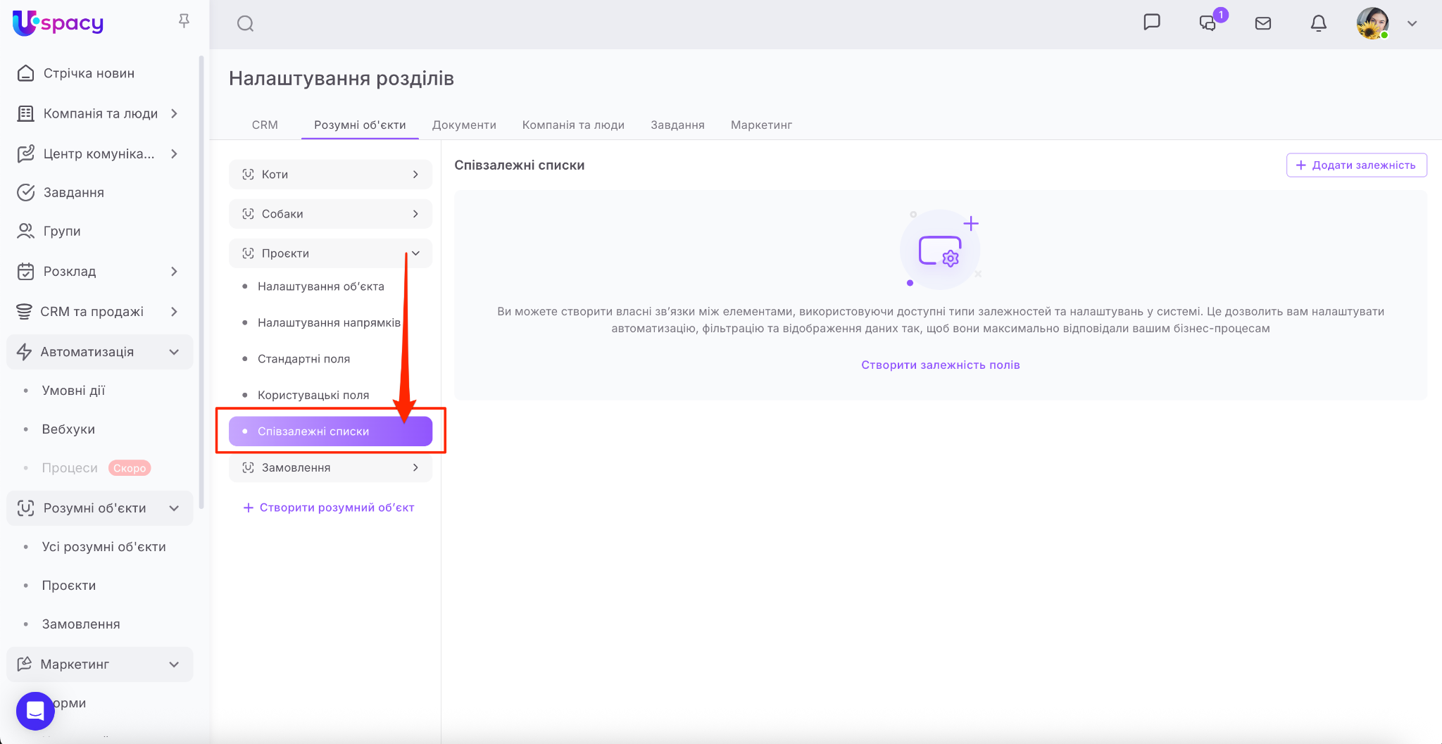 А останній пункт відповідає за можливість налаштувати співзалежні списки, тобто створювати взаємозалежності між полями розумного об’єкту.