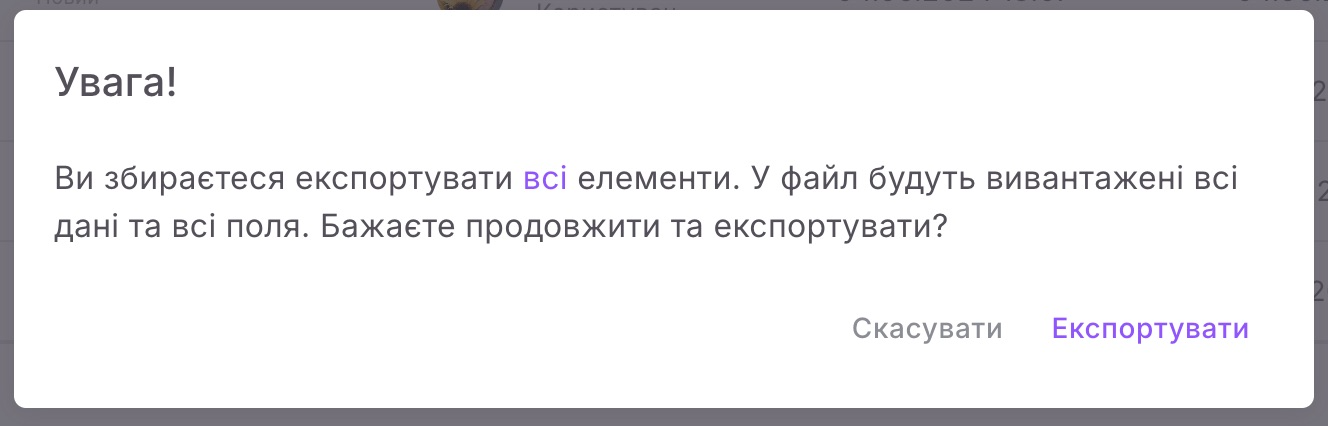Повний експорт передбачає вивантаження даних про всі елементи розумного об’єкта та інформації з усіх полів (незалежно від того, які з них відображаються в таблиці).