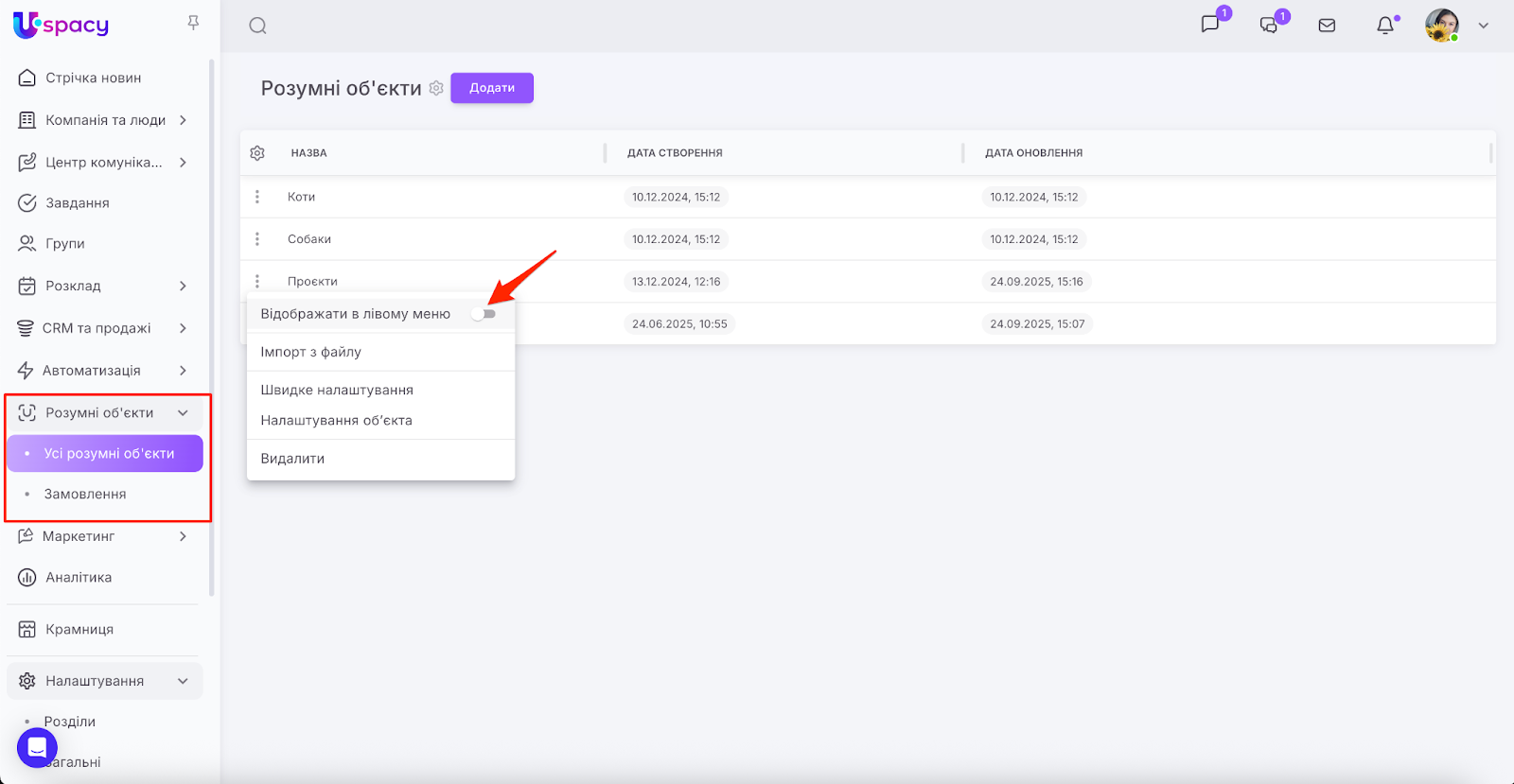🌟 Ця можливість є тільки у адміністратора чи власника Простору. Звичайні користувачі не можуть взаємодіяти з розумними об'єктами у списку.