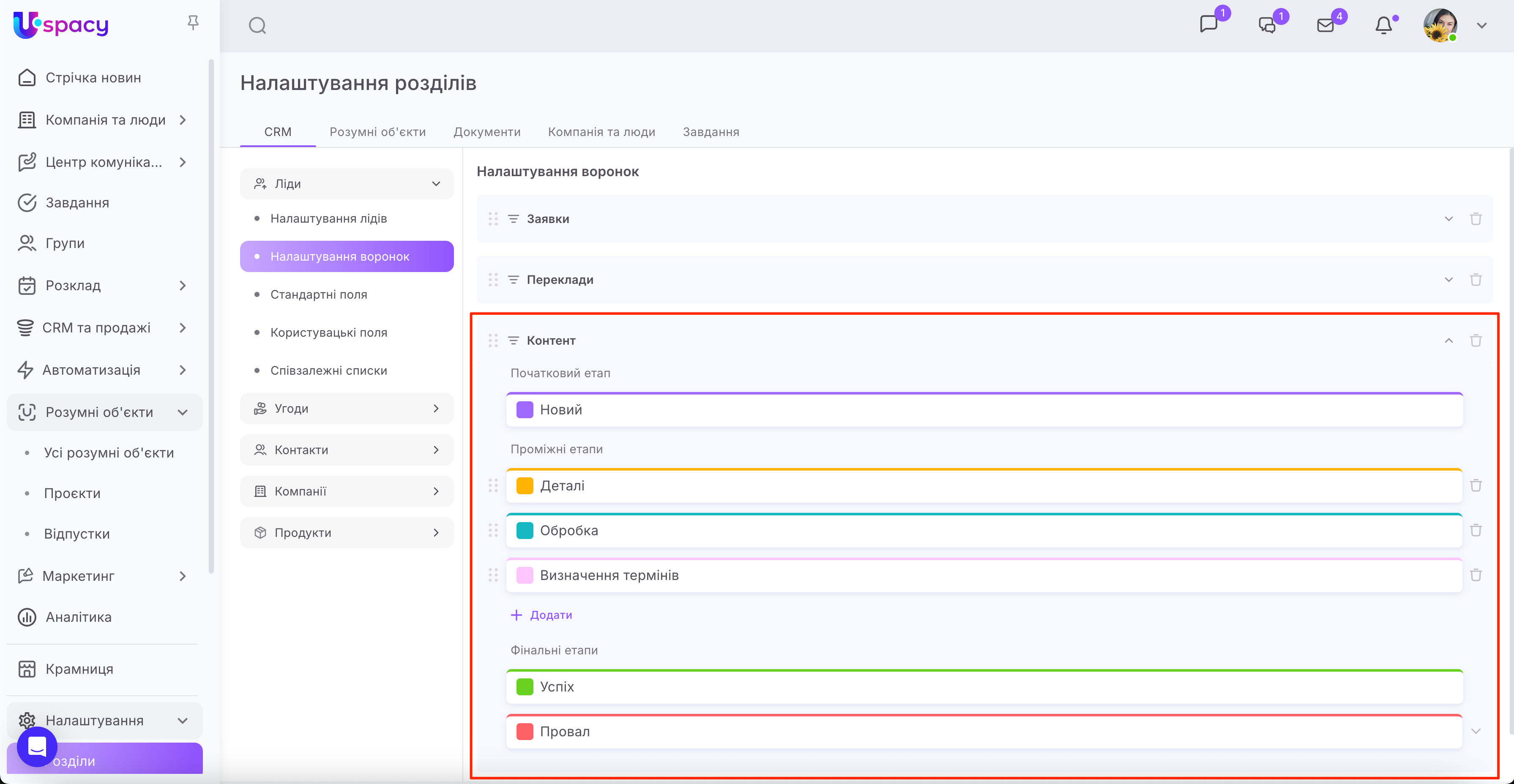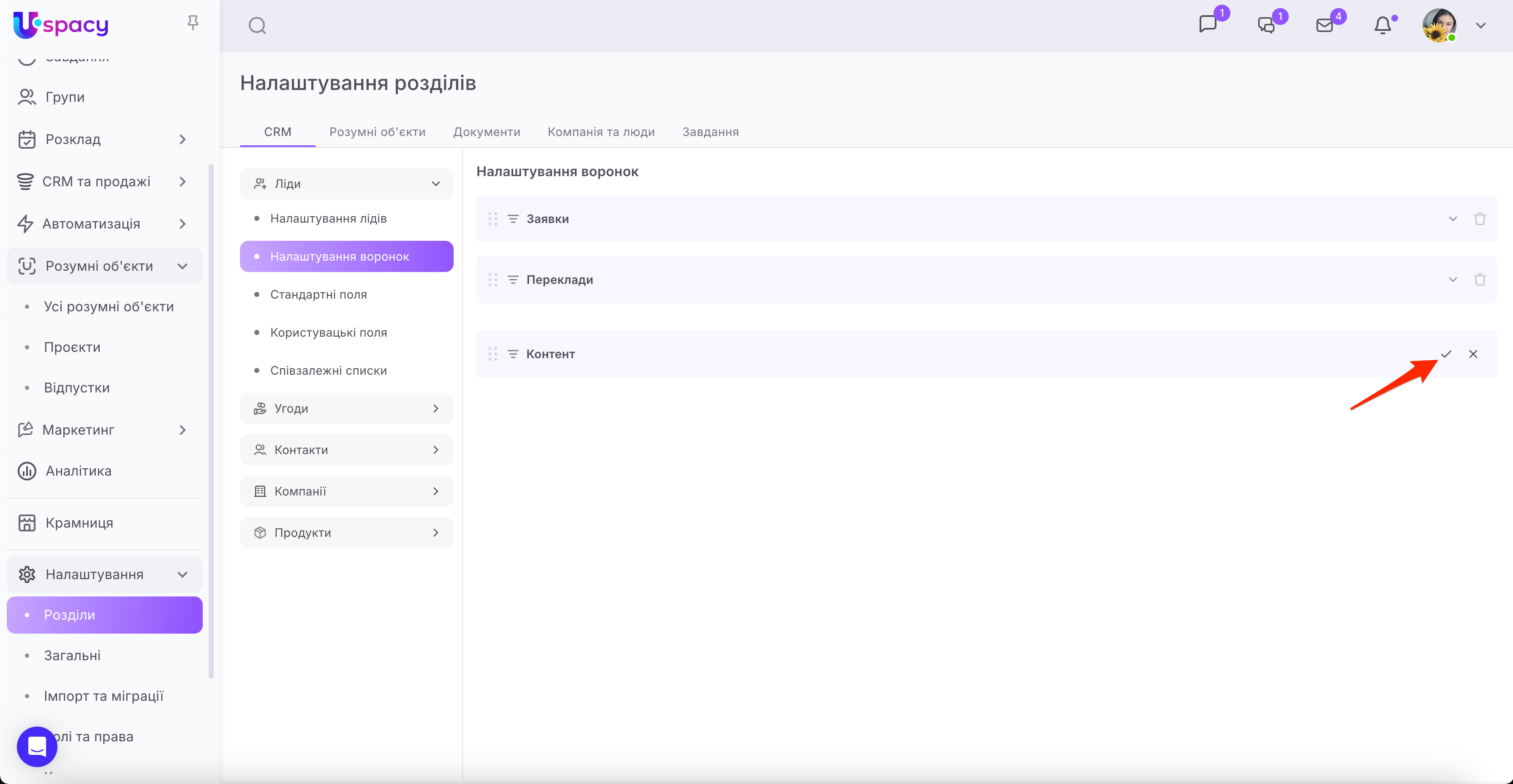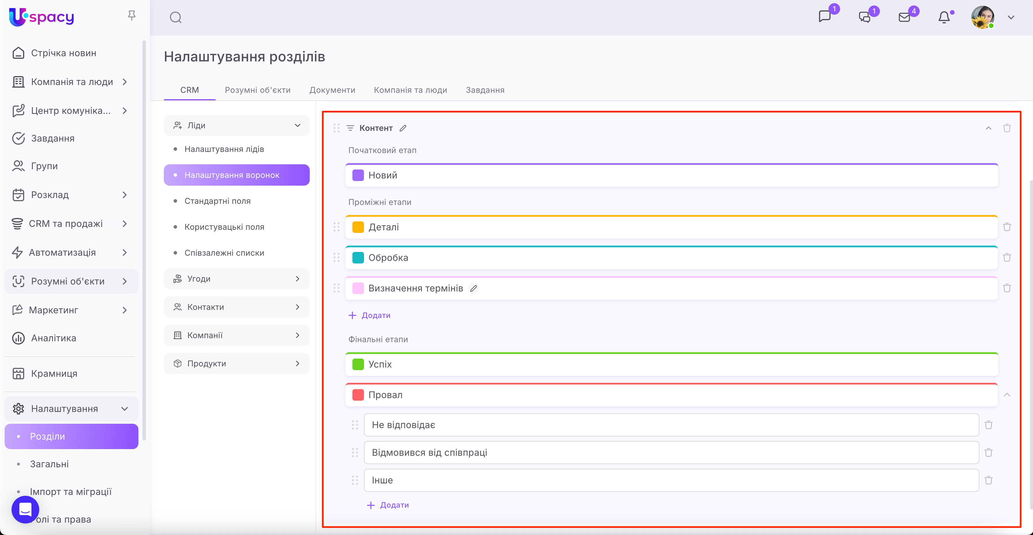 Такі самі опції доступні й на сторінці Налаштування – Розділи – CRM – Ліди чи Угоди – Налаштування воронки.
