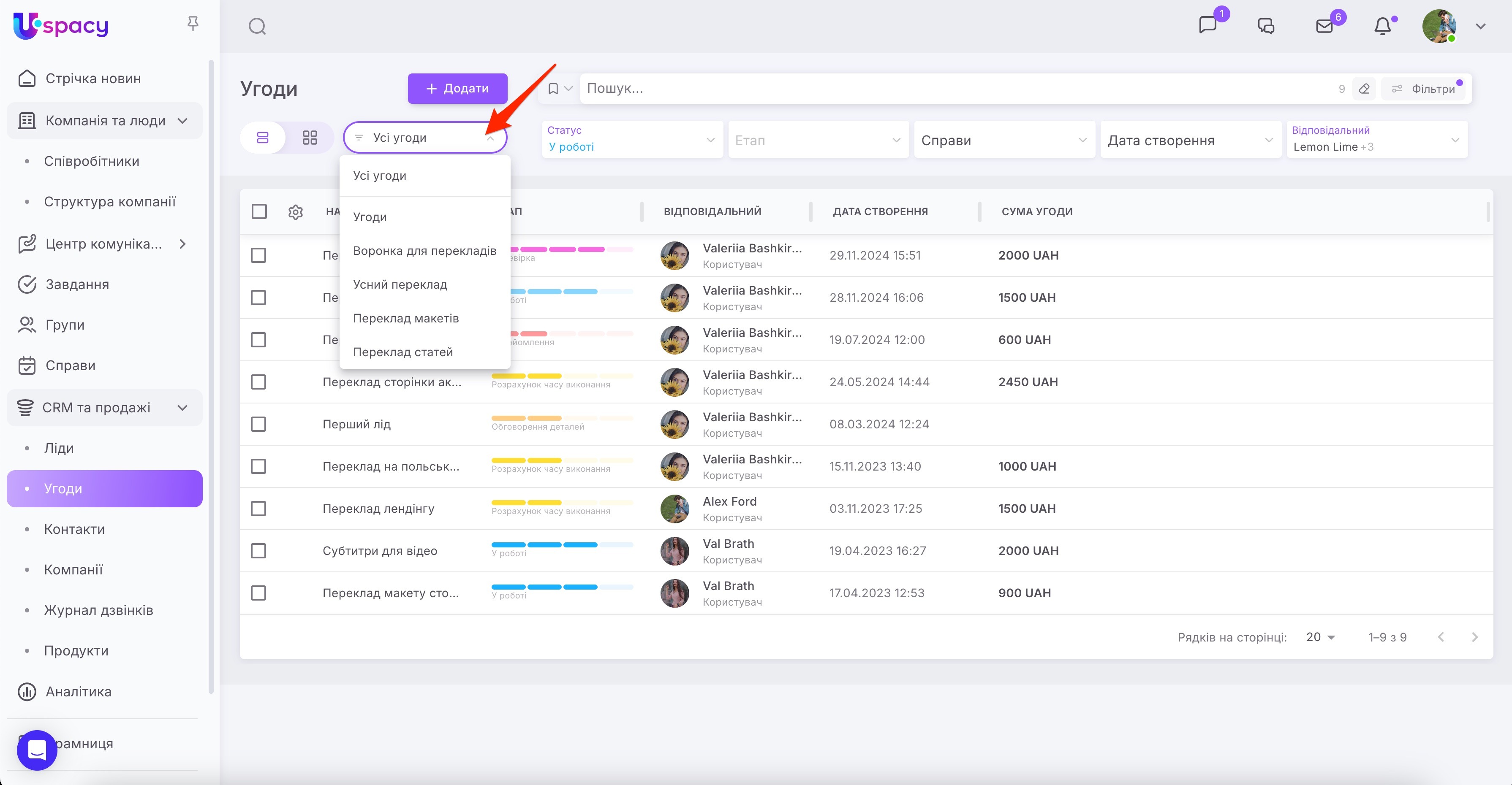 Під час створення як ліда, так і угоди можна одразу призначити воронку для елемента. А також вибрати потрібний етап у ній.