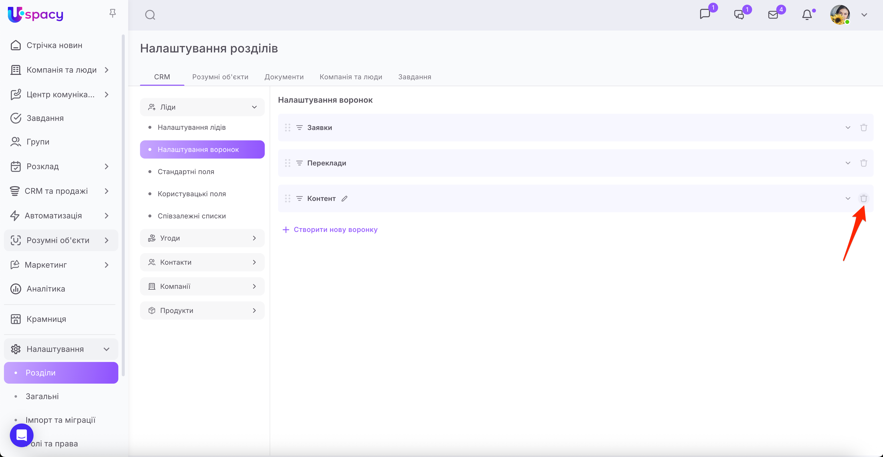 Здійснити видалення можна також на сторінці Налаштування – Розділи – CRM – Ліди чи Угоди – Налаштування воронки. Для цього натисніть на значок кошика, поруч з назвою потрібної.