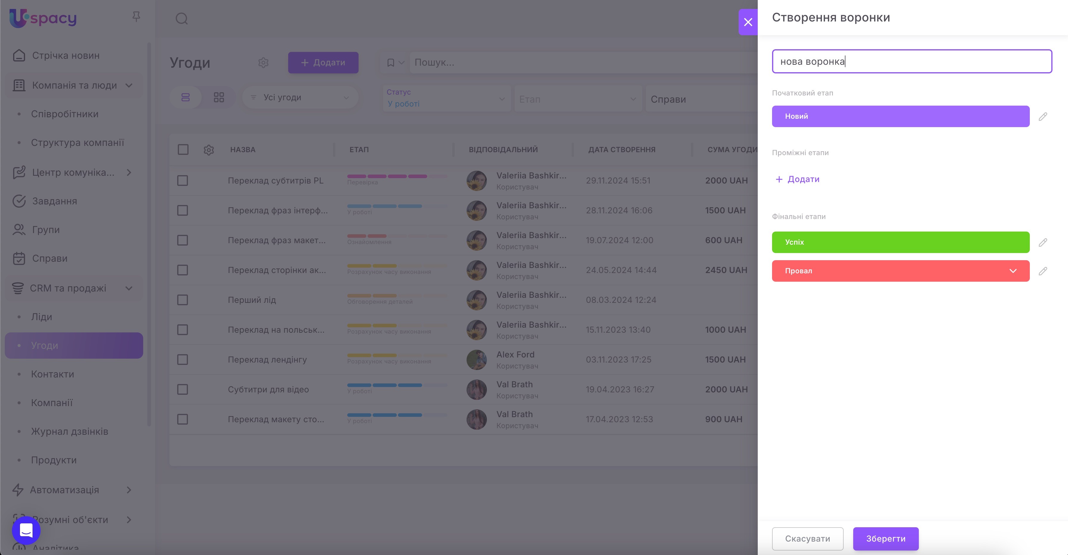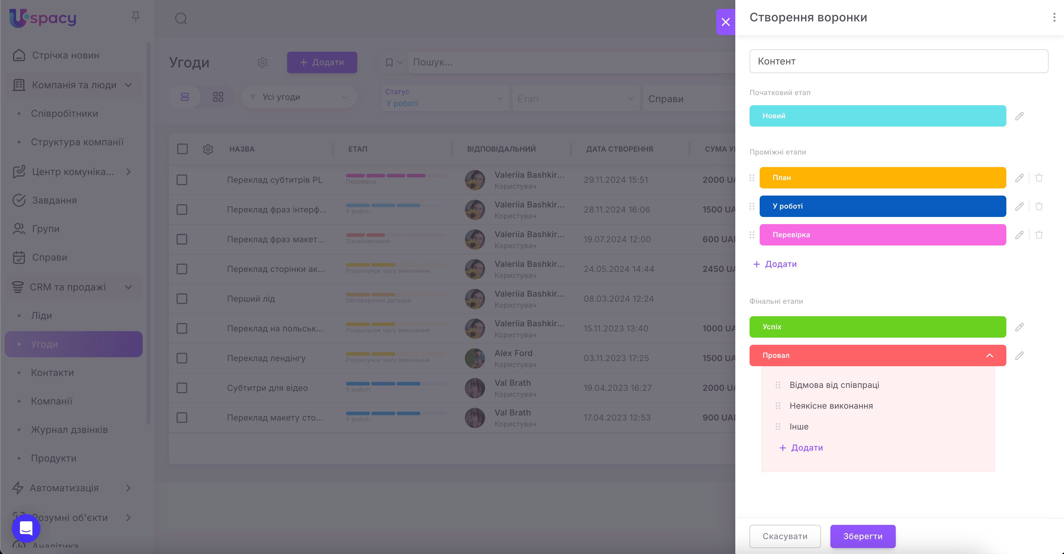 Тут потрібно буде придумати назву для нової воронки. Відредагувати існуючі стандартні етапи: перейменовувати їх, змінити колір та вказати причини провалу, які характерні для вашої сфери. А також додати свої проміжні етапи.