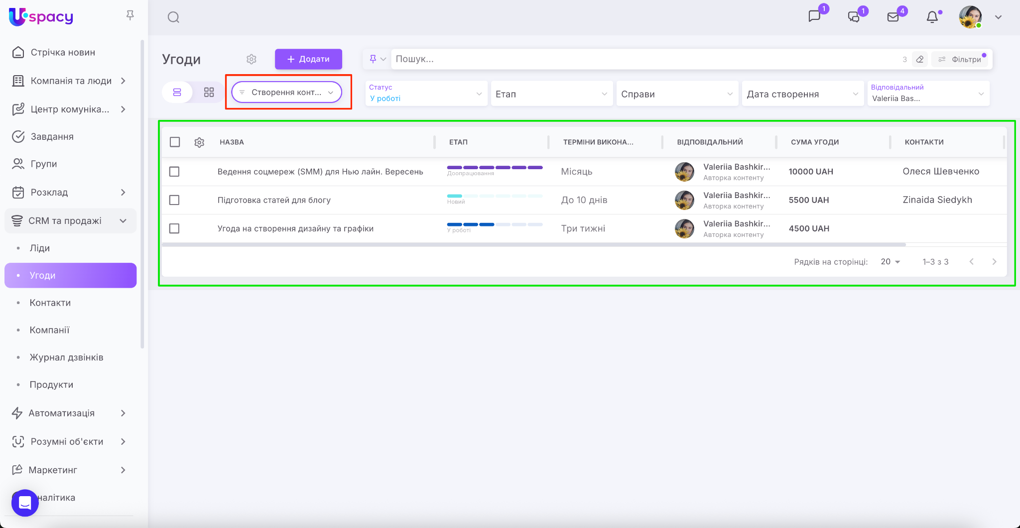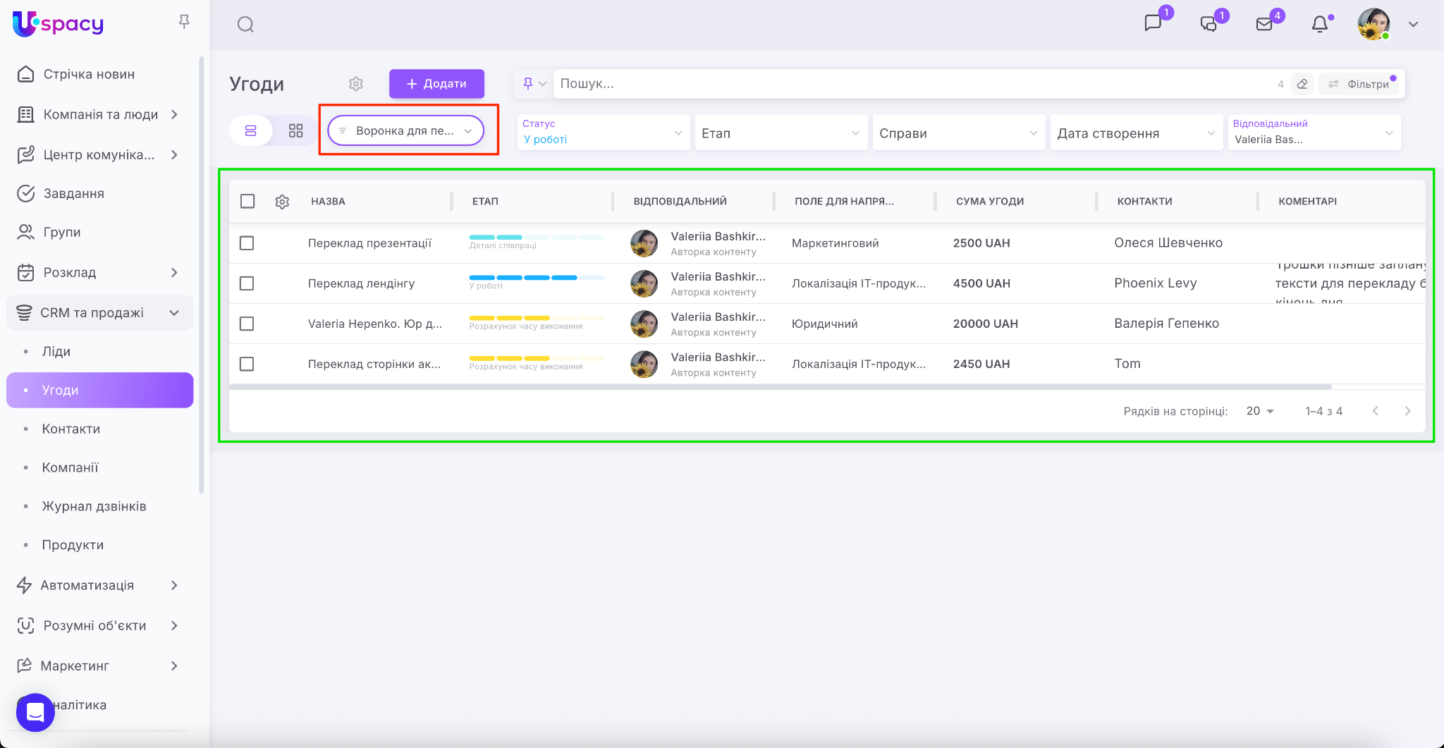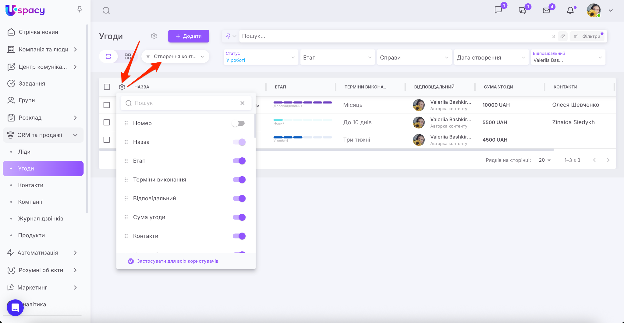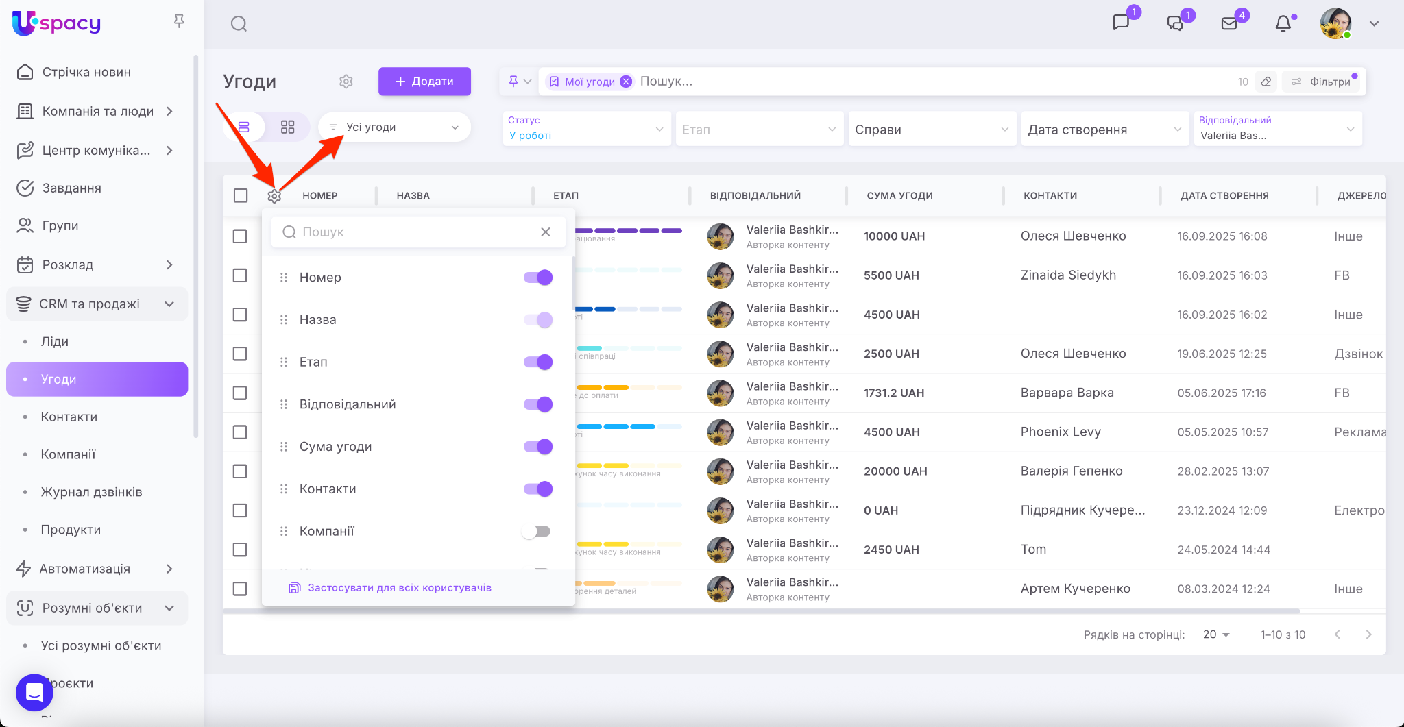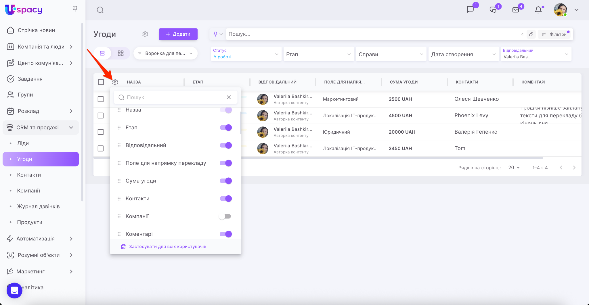 У CRM Uspacy ви можете персоналізувати таблицю угод чи лідів під конкретні бізнес-процеси. Тепер налаштування відображення полів зберігається для кожної воронки окремо. Це дозволяє працювати з даними максимально зручно та ефективно. Наприклад, у «Воронці для перекладів» бачити одні параметри, а у «Воронці для створення контенту» – інші.