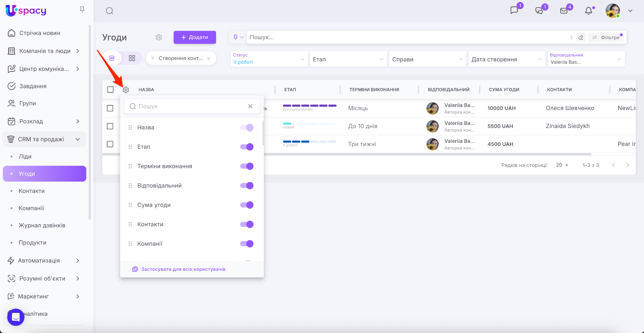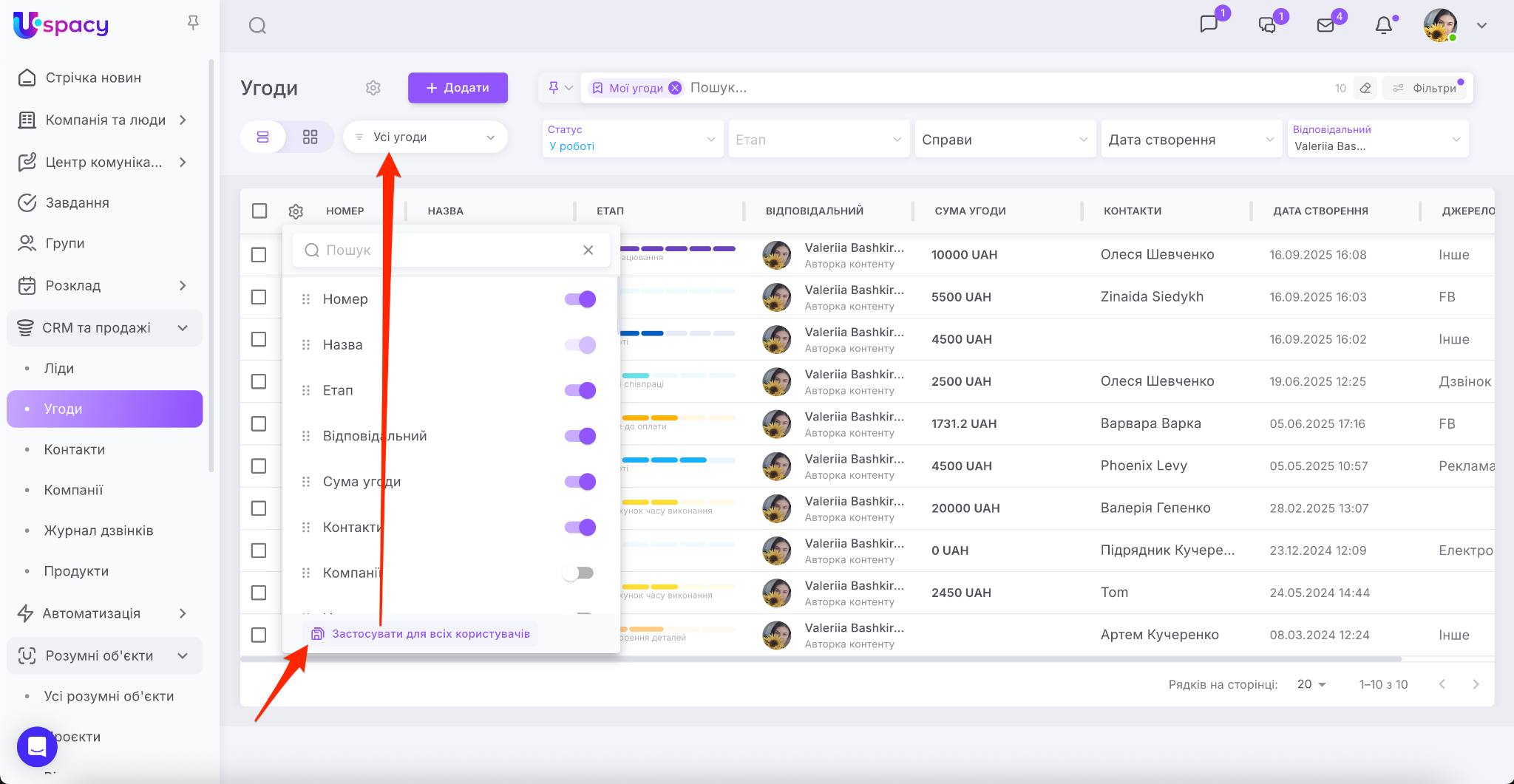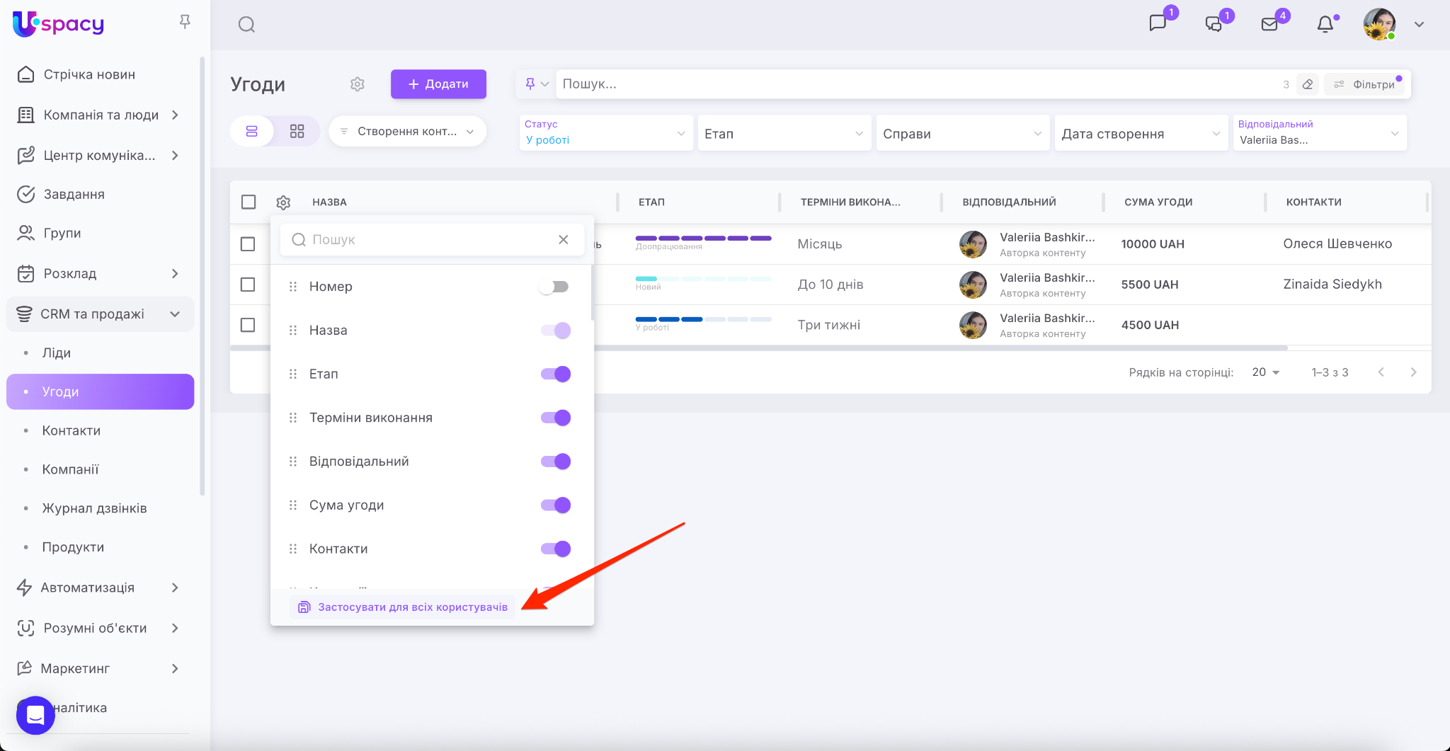 🟣 якщо адміністратор або власник Простору вибирає опцію «Застосувати для всіх користувачів» у конкретній воронці, то налаштування вигляду таблиці поширюються лише на неї (або напрямок у Розумних об’єктах), а не на всі;
