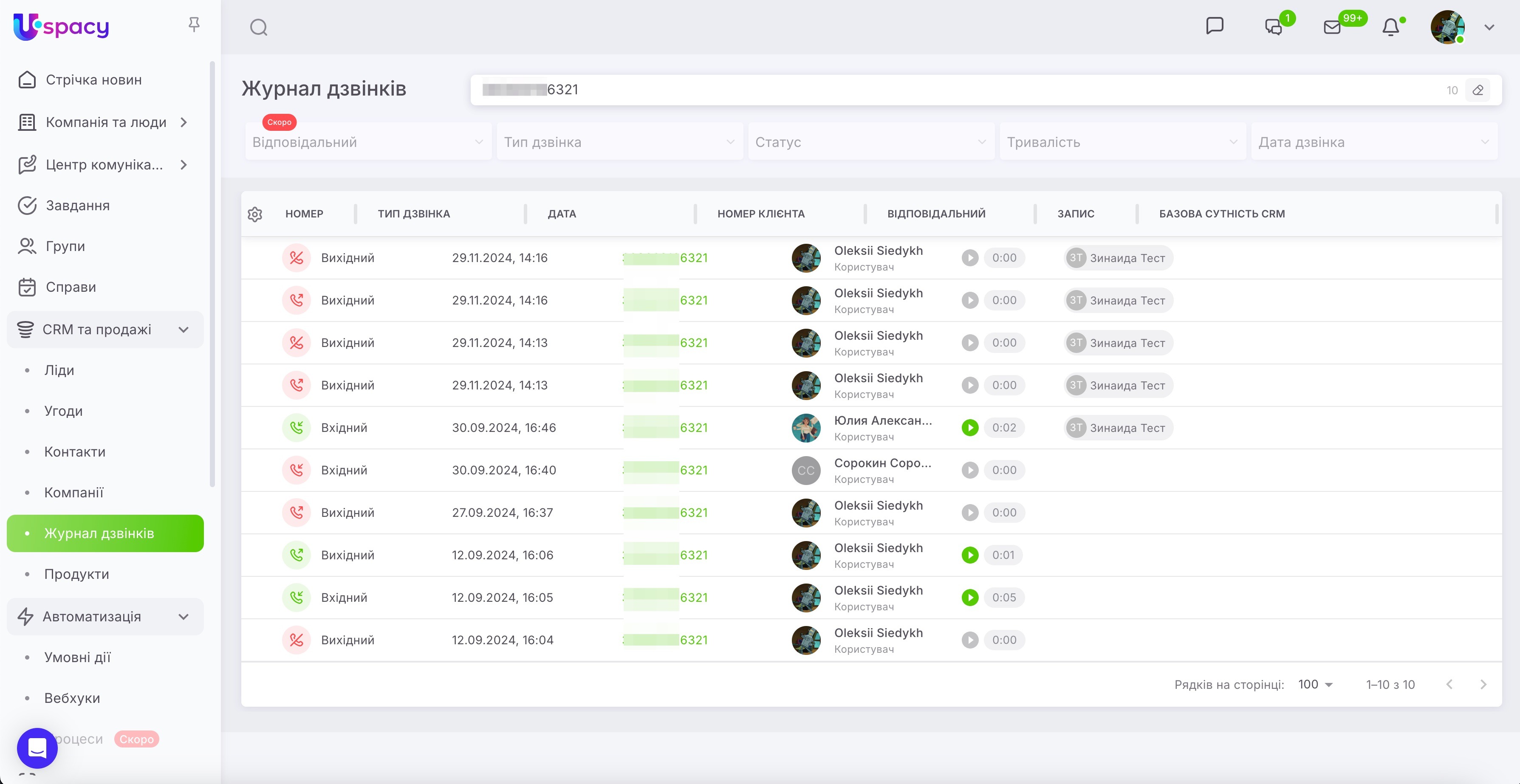 🟣 Пошук за номером телефону ну просто просився в нашому Журналі дзвінків. І як знайдете номер, то одразу зможете прослухати записи та побачити до яких сутностей вони прикріплені.