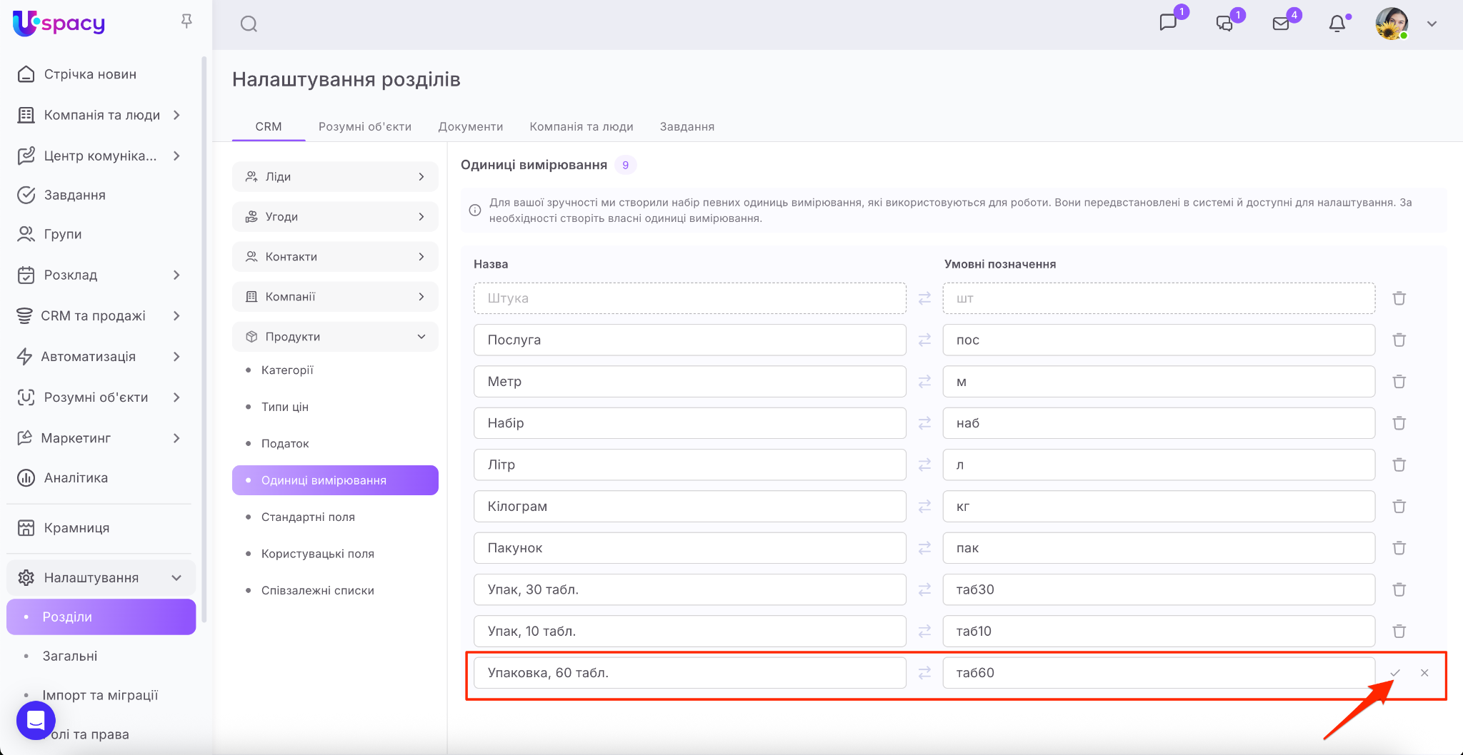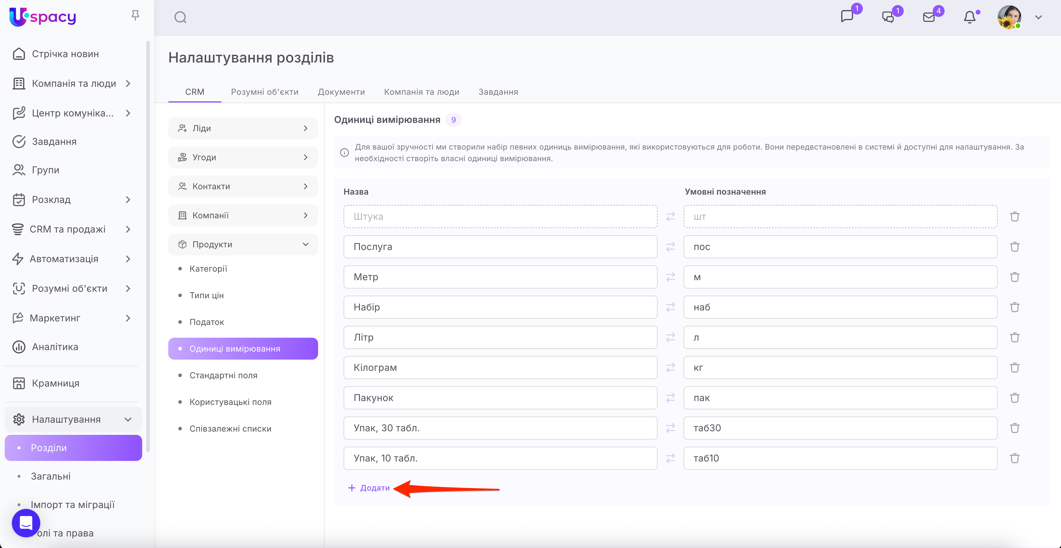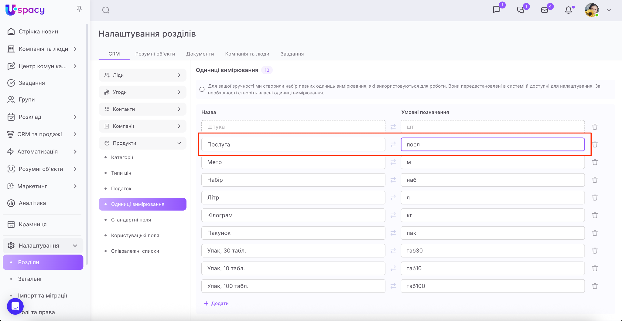 Для цього достатньо знову перейти в Налаштування – Розділи – СRM, розгорнути блок Продукти та вибрати пункт Одиниці вимірювання.