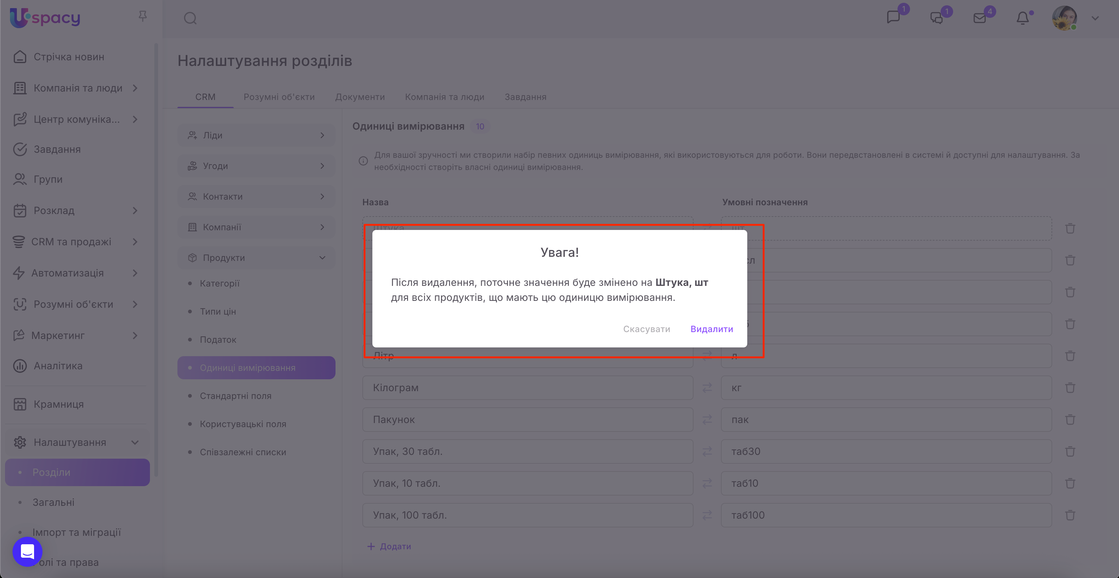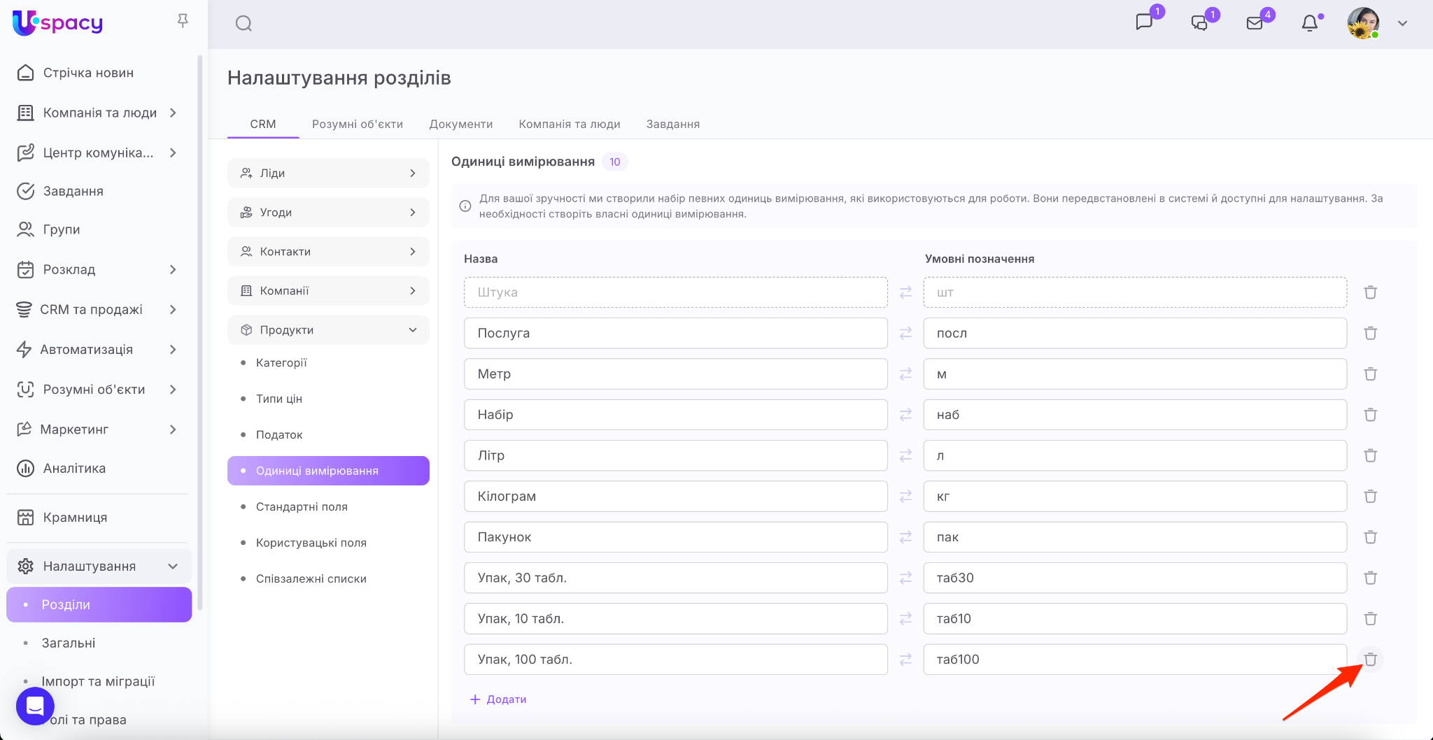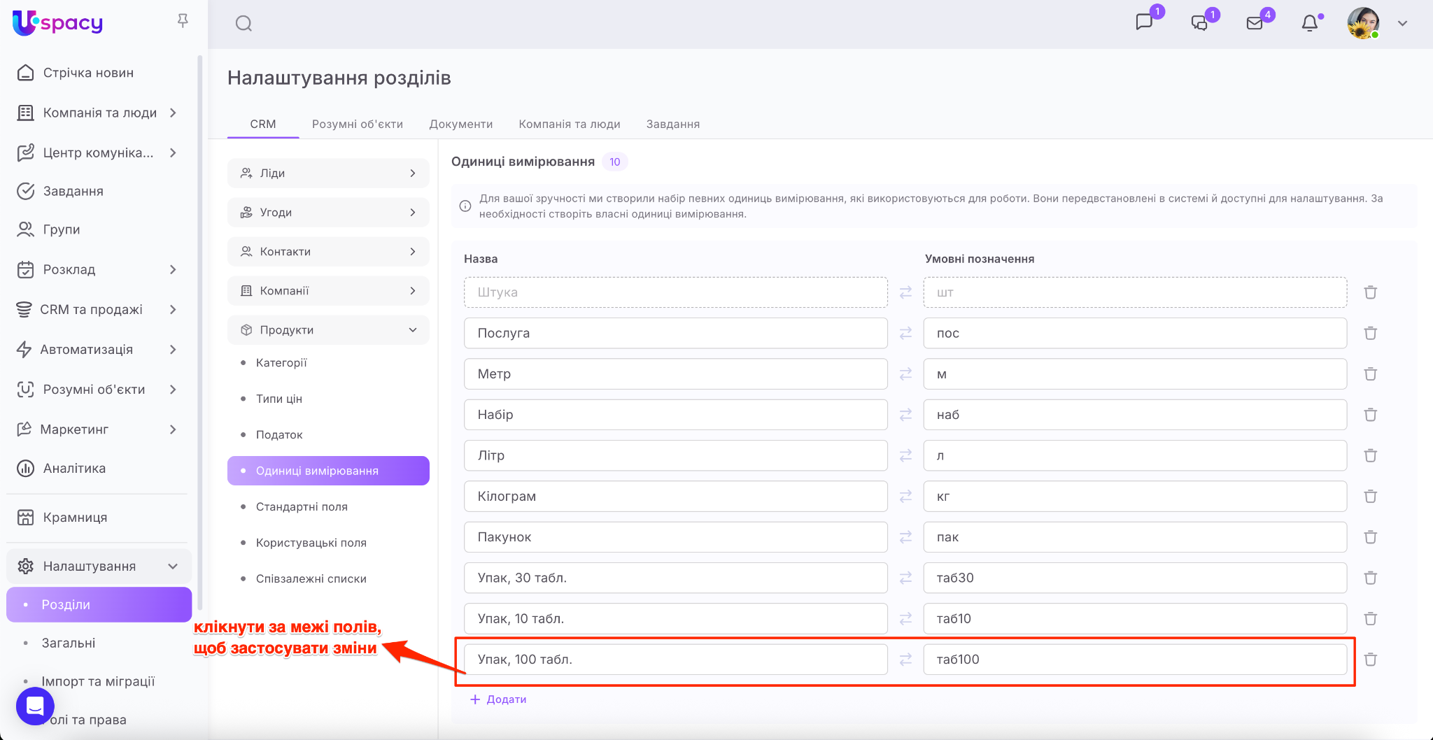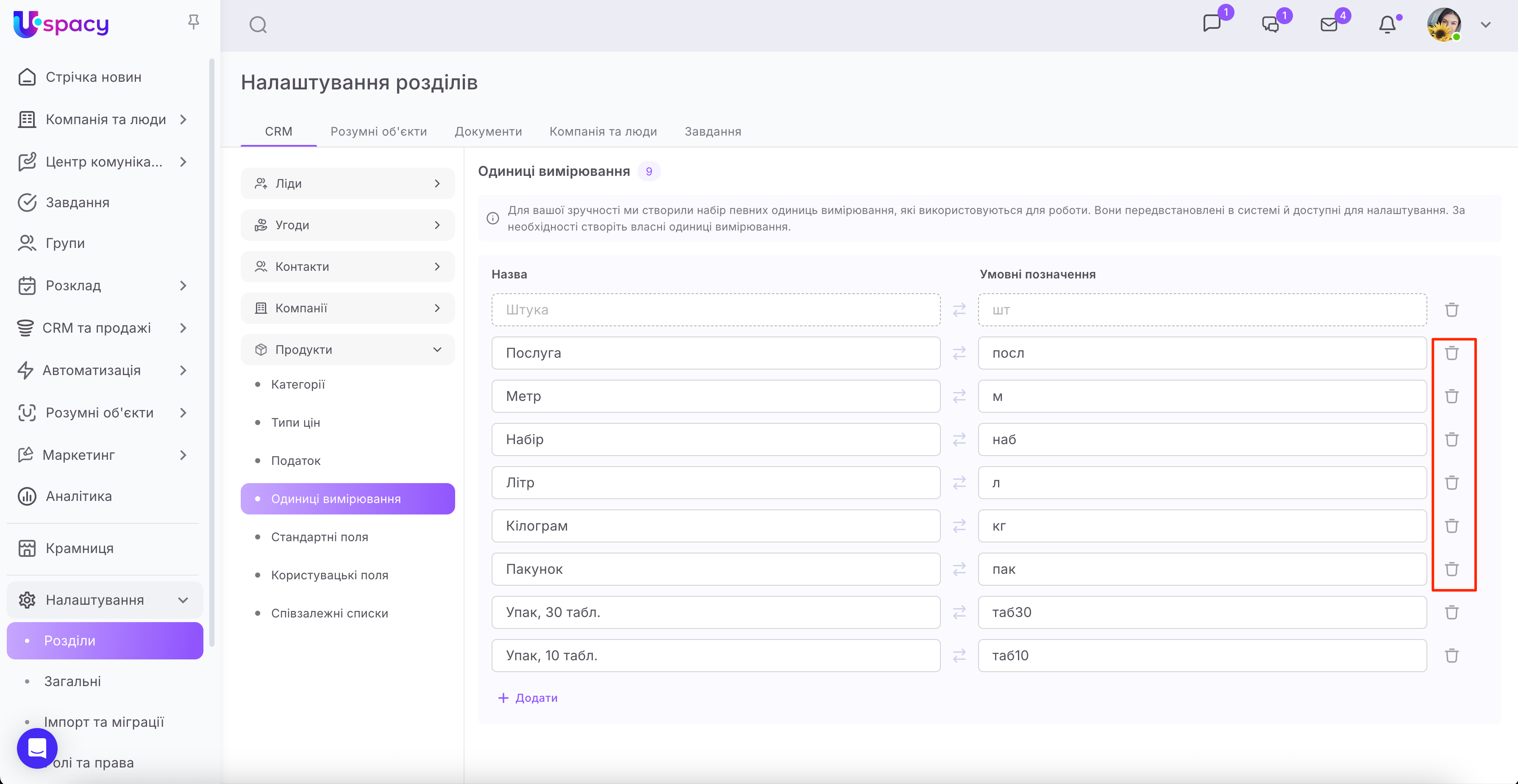 Для цього достатньо знову перейти в Налаштування – Розділи – СRM, розгорнути блок Продукти та вибрати пункт Одиниці вимірювання.