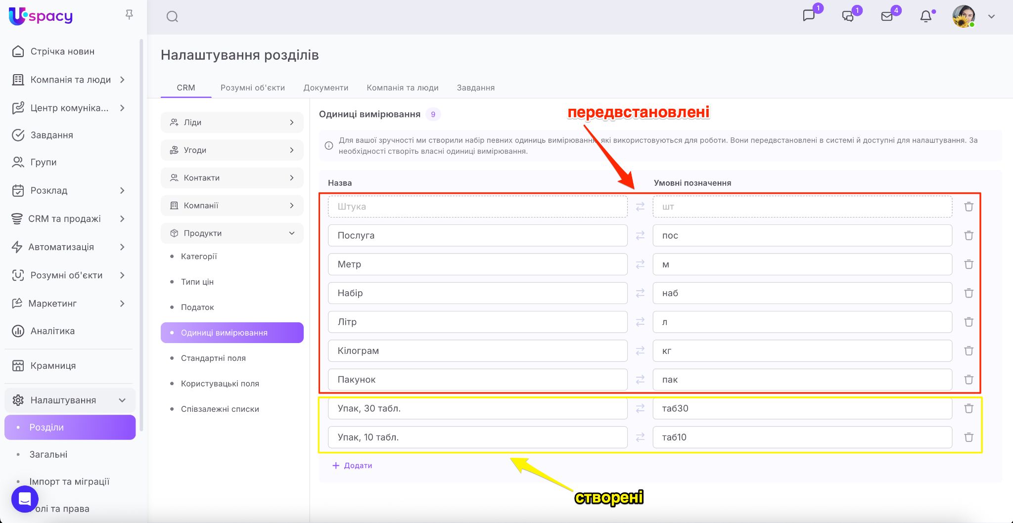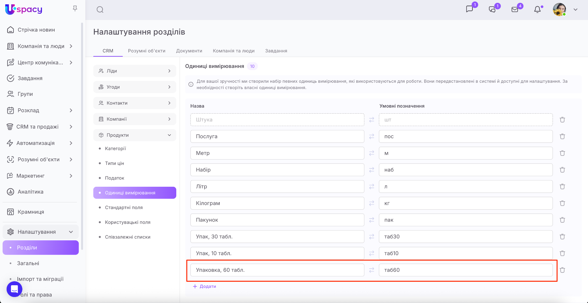 Для зручності в CRM вже доданий набір певних одиниць вимірювання, які використовуються для роботи. Вони передвстановлені в системі й доступні для налаштування. Але за необхідності можна створювати й власні одиниці вимірювання.