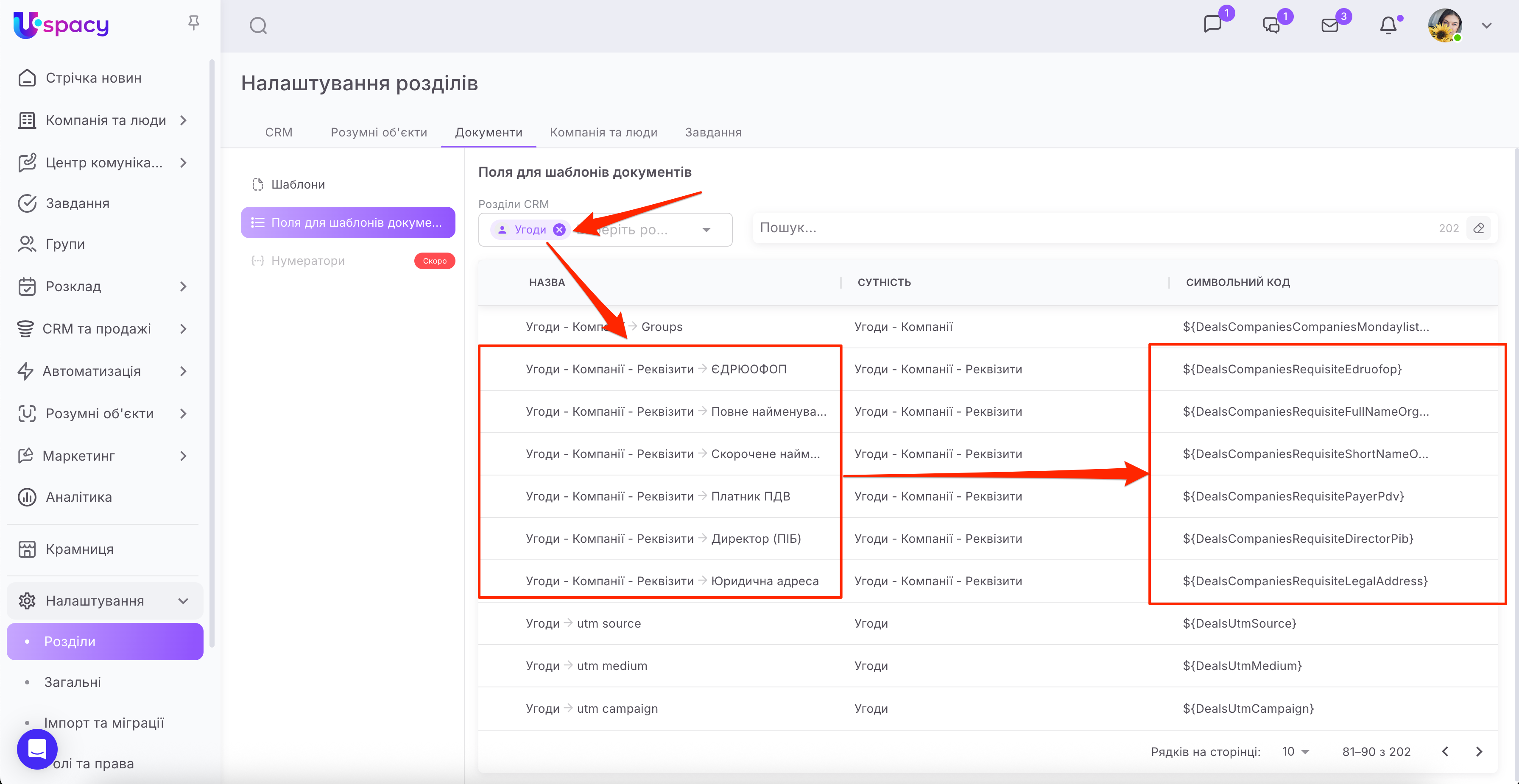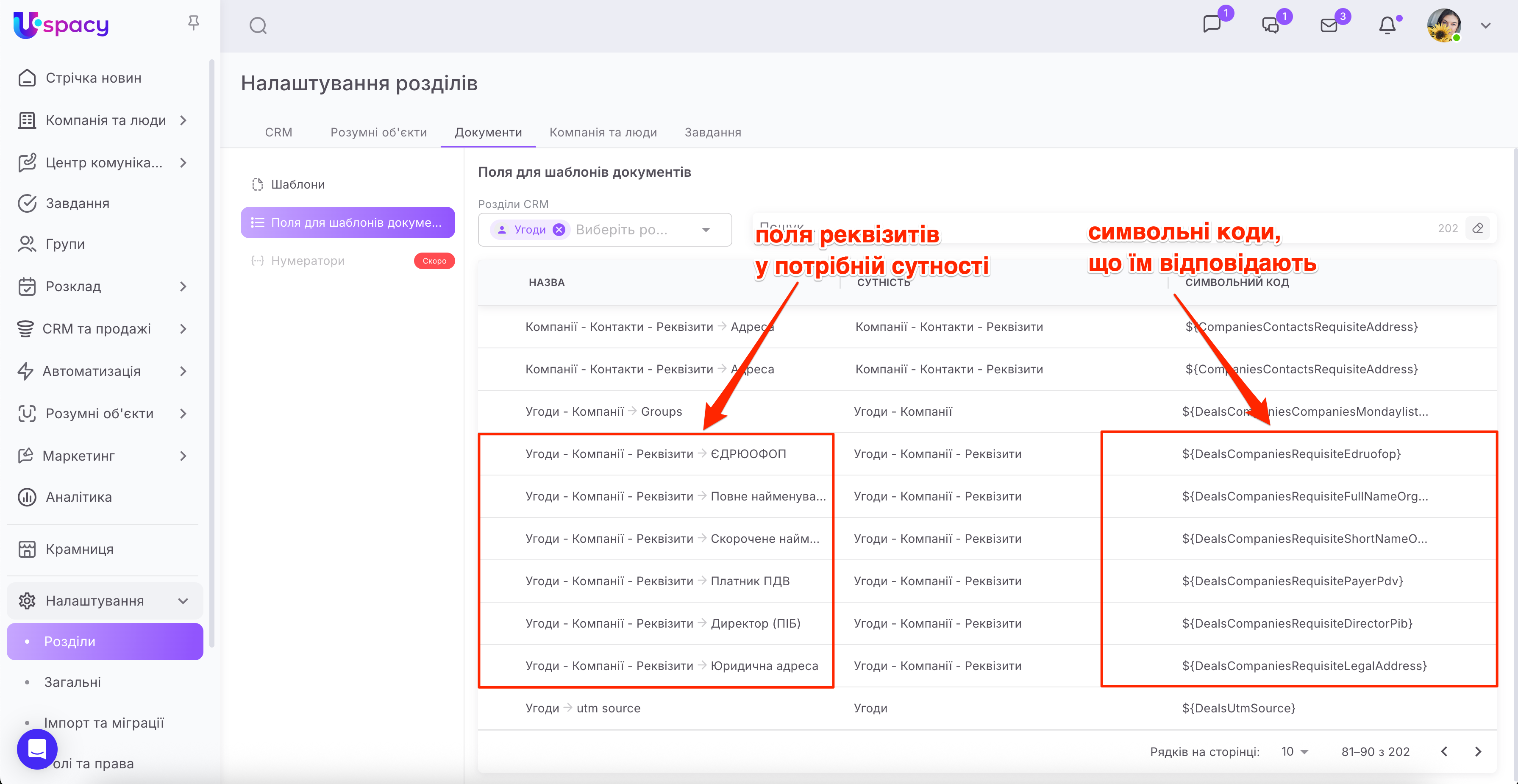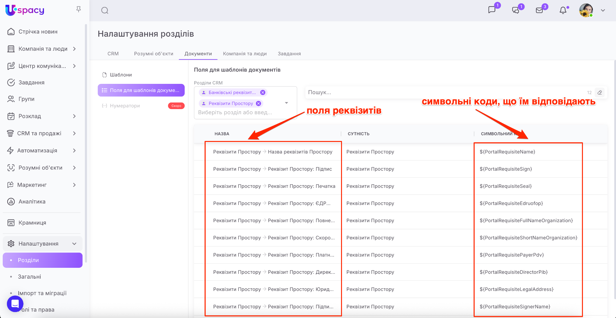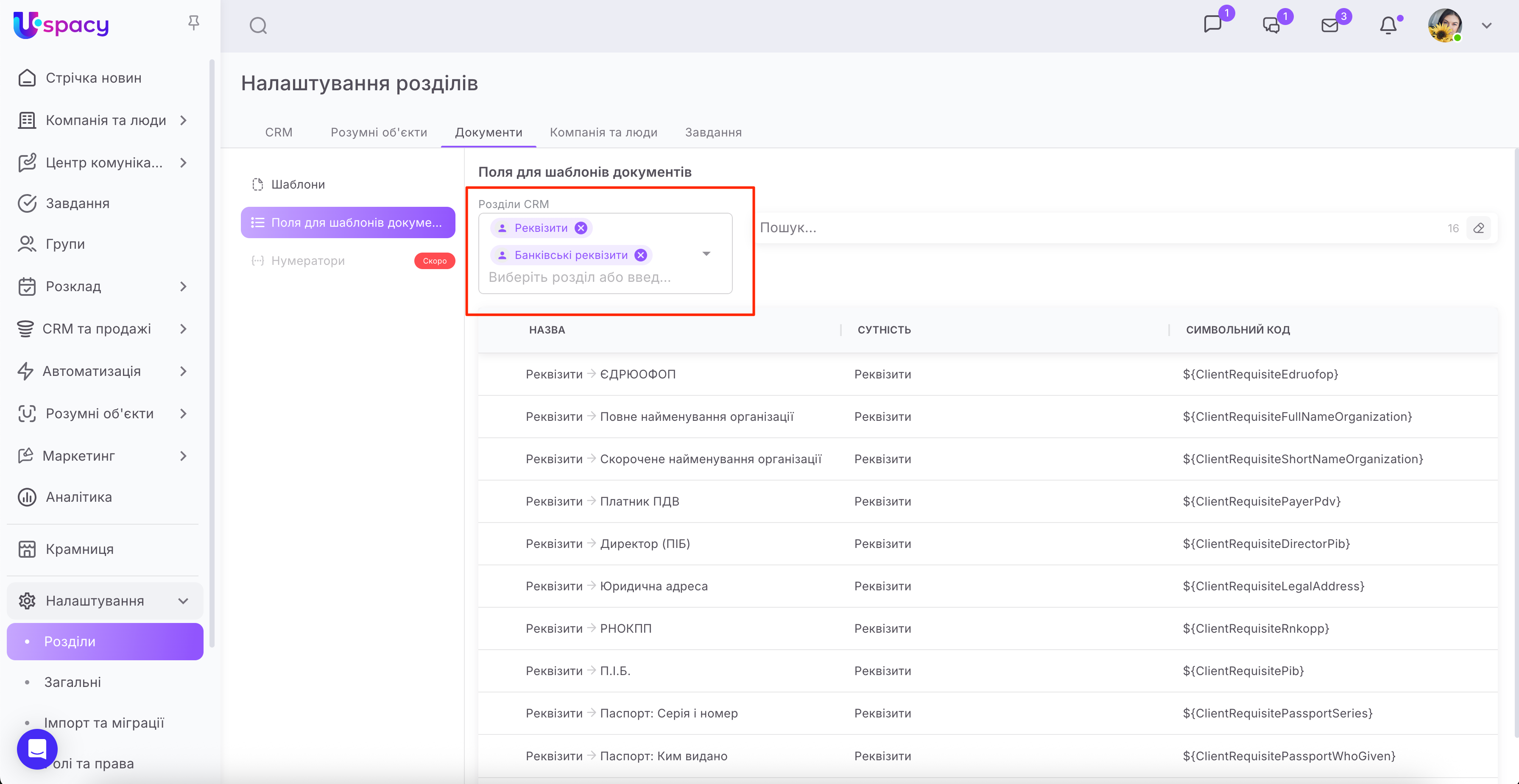 🟣 символьні коди для полів з розділів Реквізити та Банківські реквізити. Це забезпечить вивантаження в документ реквізитів саме компанії/контакту з картки CRM, у якій документ генерується.