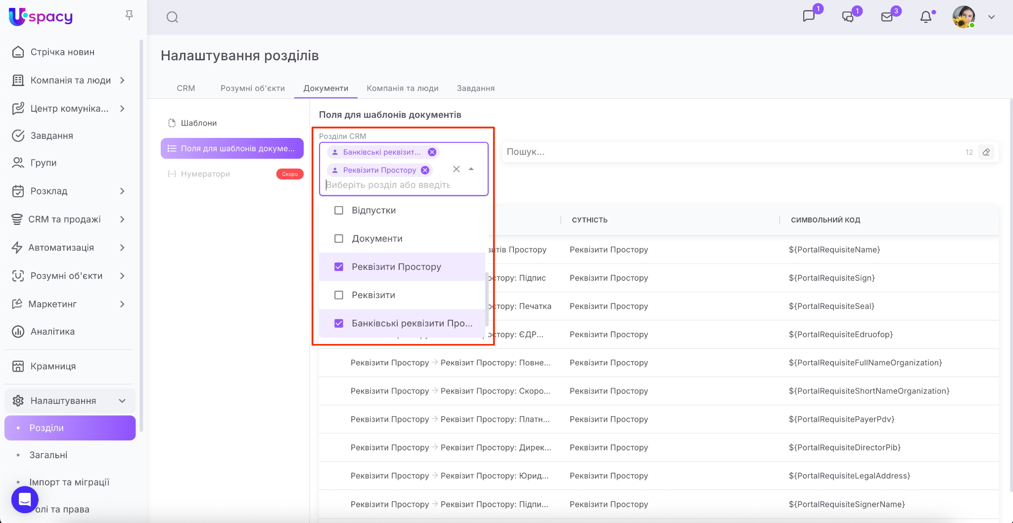 Щоб швидко знайти символьні коди полів Реквізитів Простору та полів Банківських реквізитів Простору, використайте фільтр Розділи CRM.