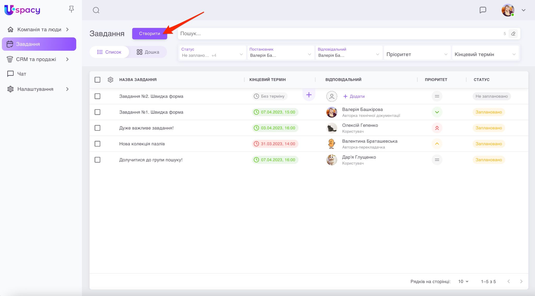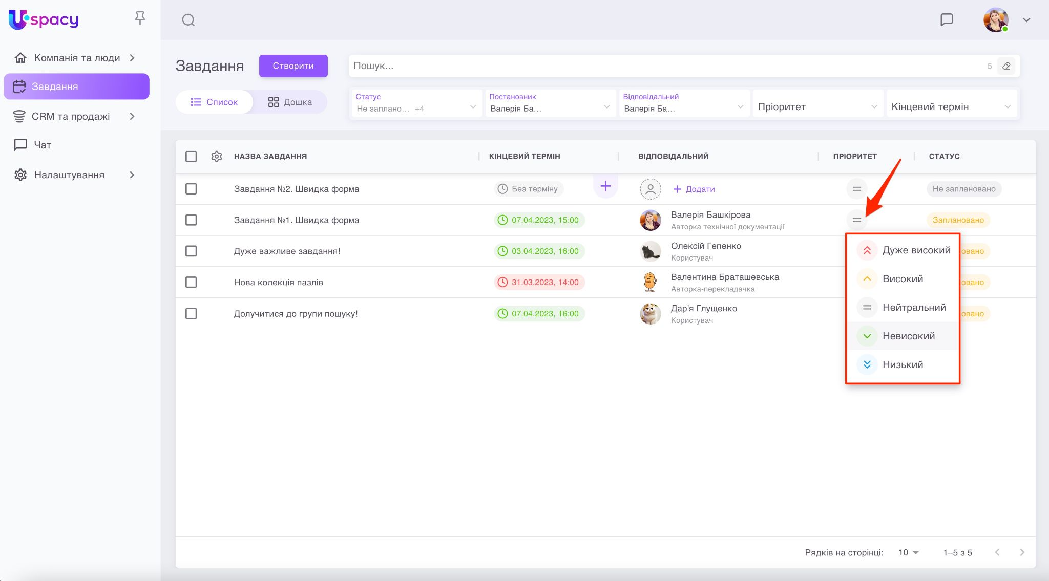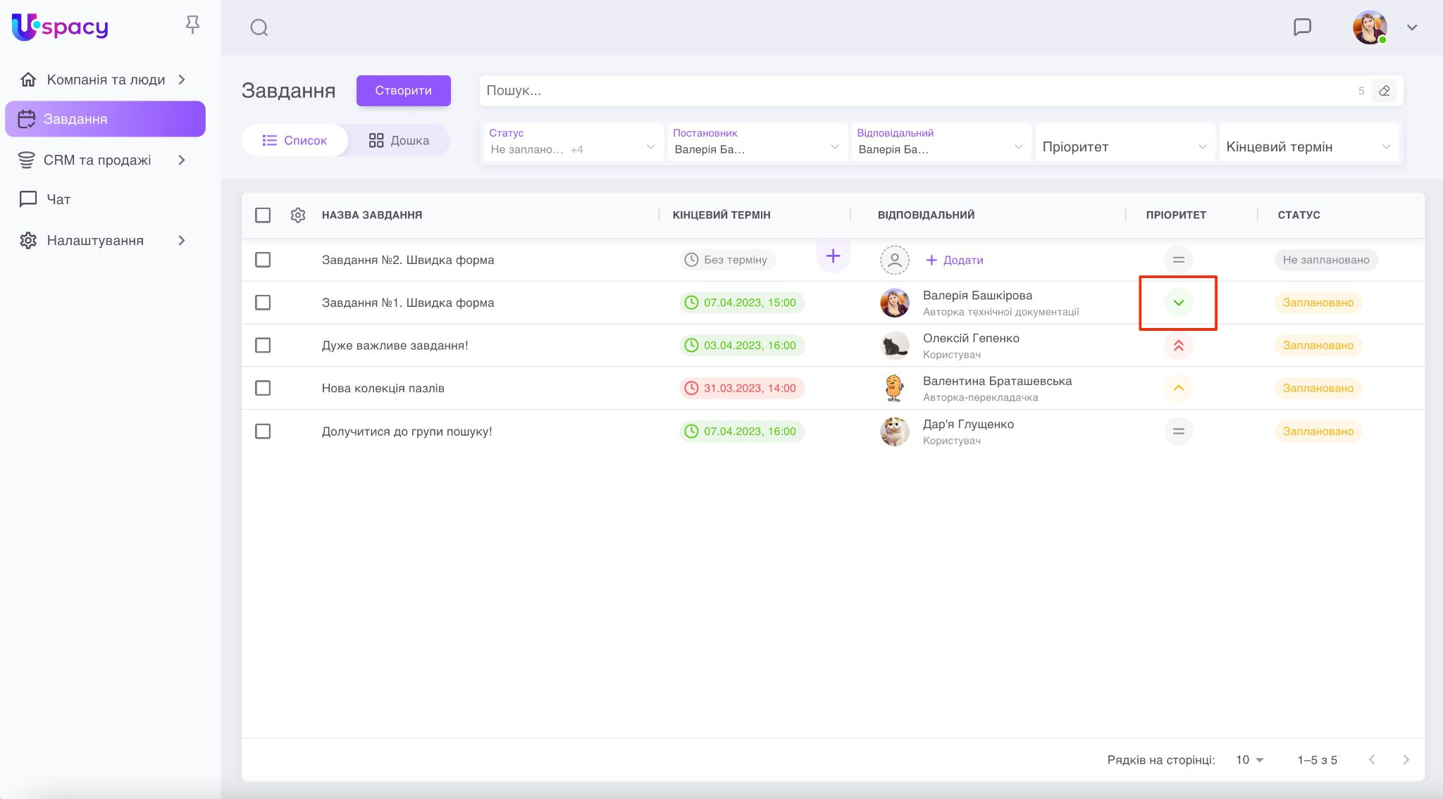 Над списком завдань знаходиться рядок пошуку та фільтри: Статус, Постановник, Відповідальний, Пріоритет, Кінцевий термін.