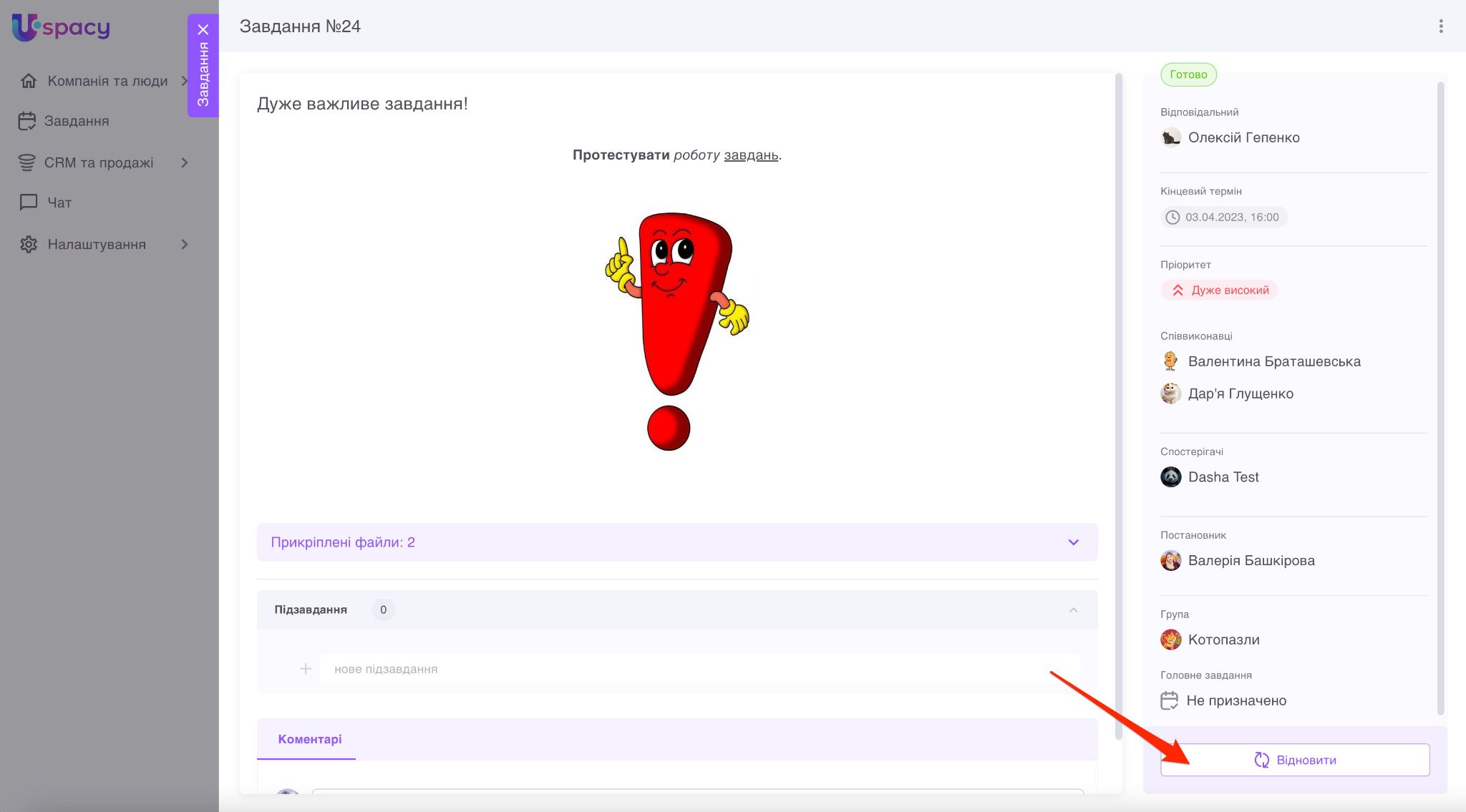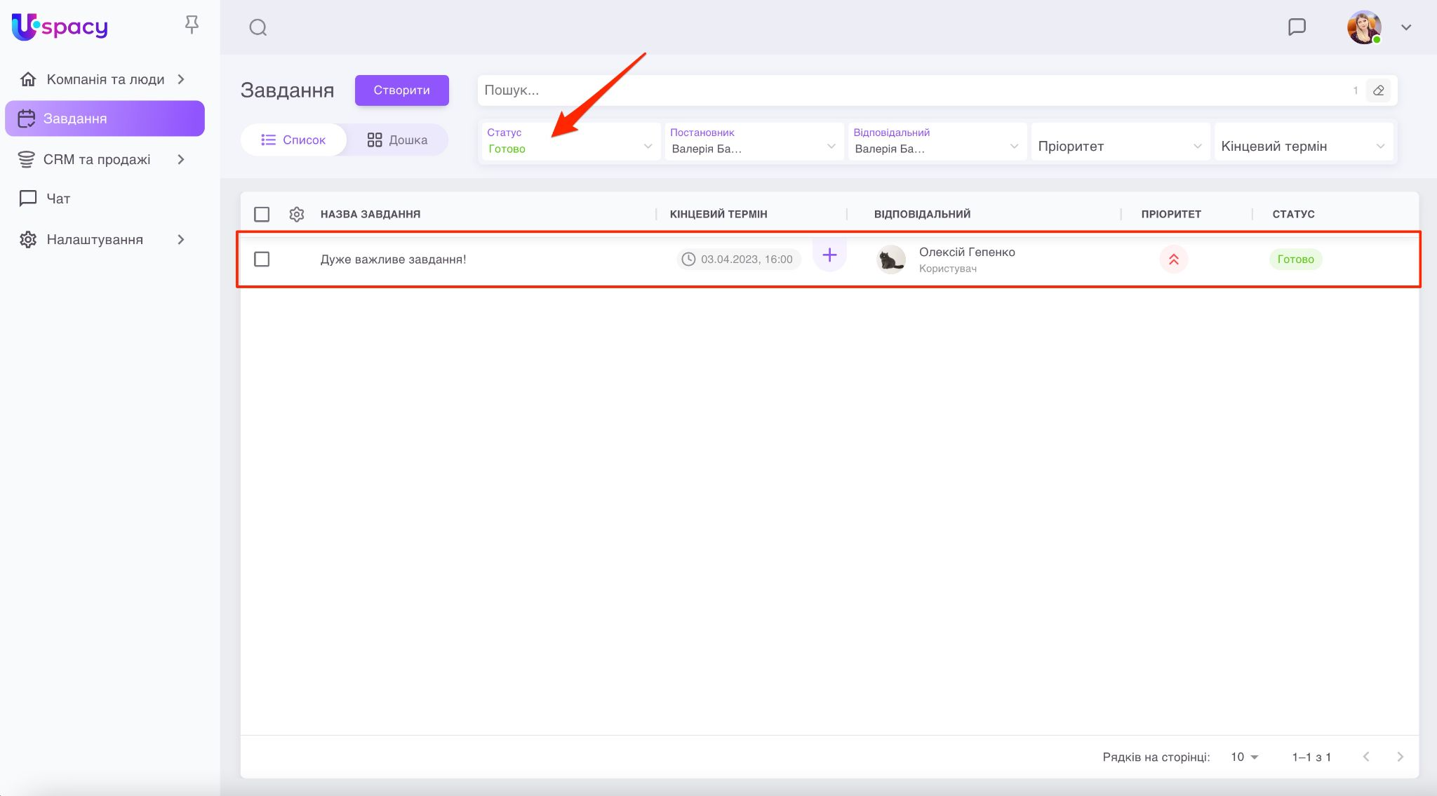 При натисканні на кнопку Завершити завдання отримує статус Готово й зникає із загального списку. Його можна легко знайти, скориставшись фільтром.