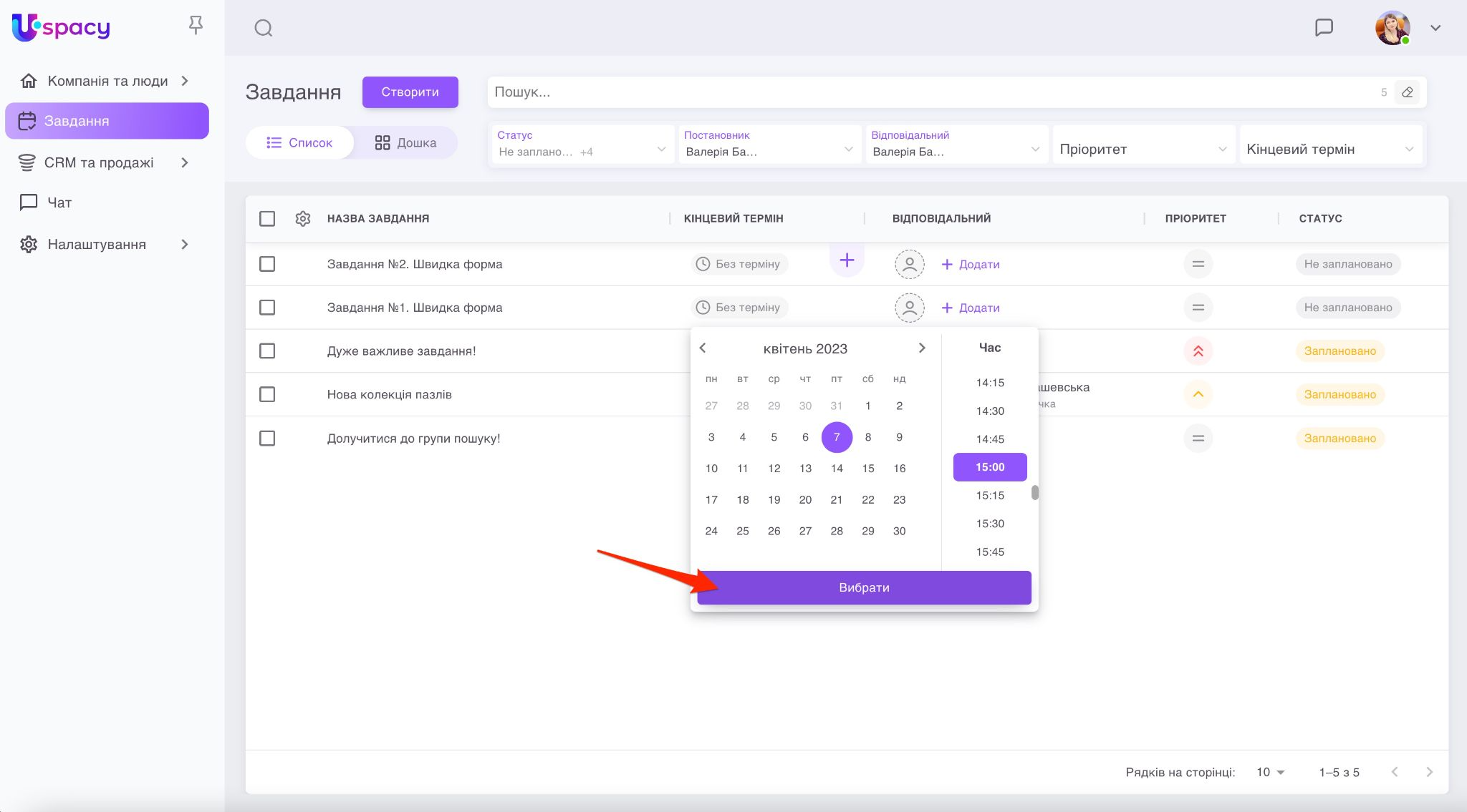 Щоб вказати новий кінцевий термін завдання, достатньо натиснути на поточний та вибрати нове значення.