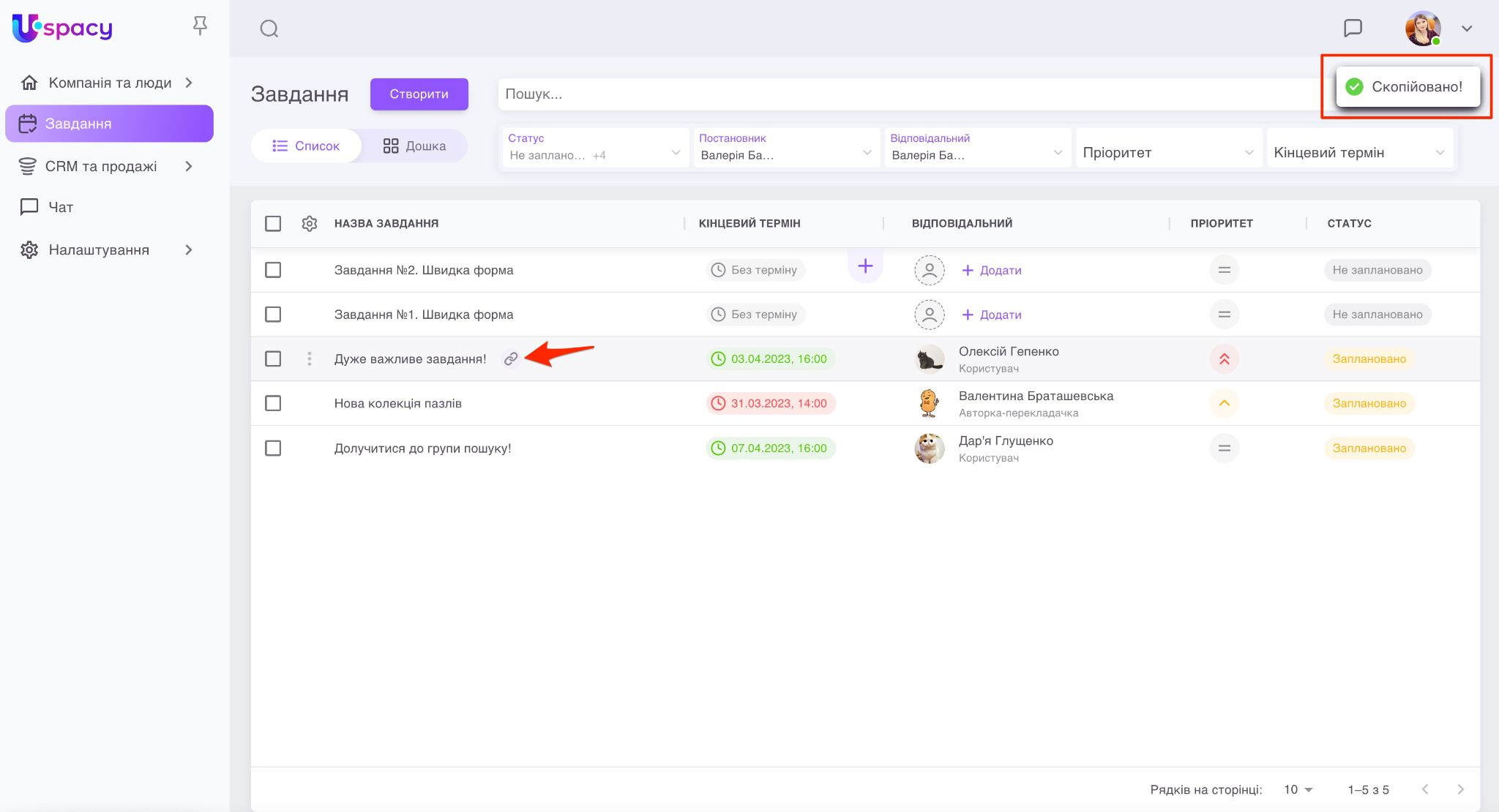 Отже, можна скопіювати посилання на завдання на значок 🔗. Про успішне копіювання система повідомить спеціальним сповіщенням.