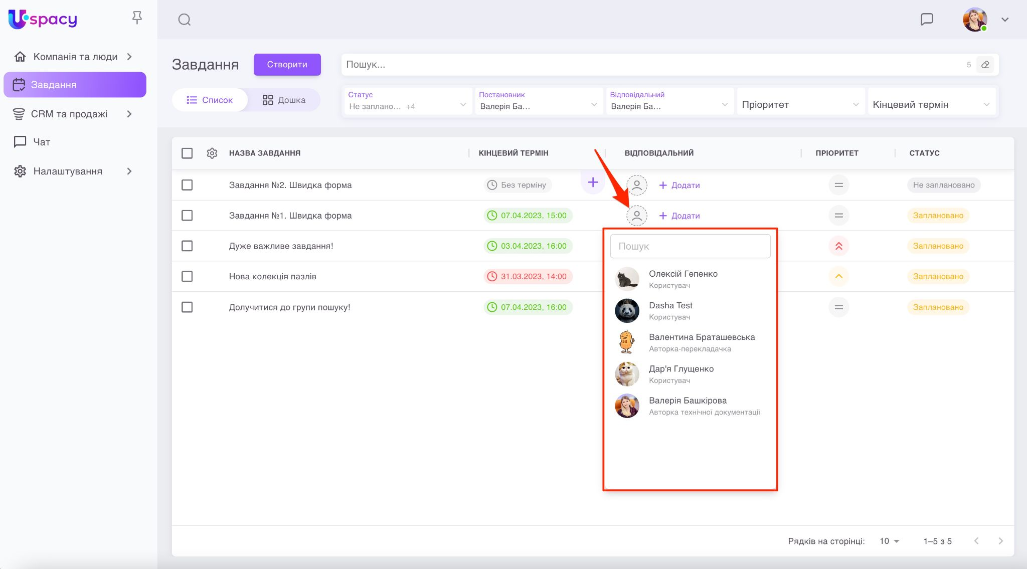 Щоб призначити для завдання нового відповідального достатньо натиснути на іконку фото. Виберіть користувача у списку або скористайтеся рядком пошуку.