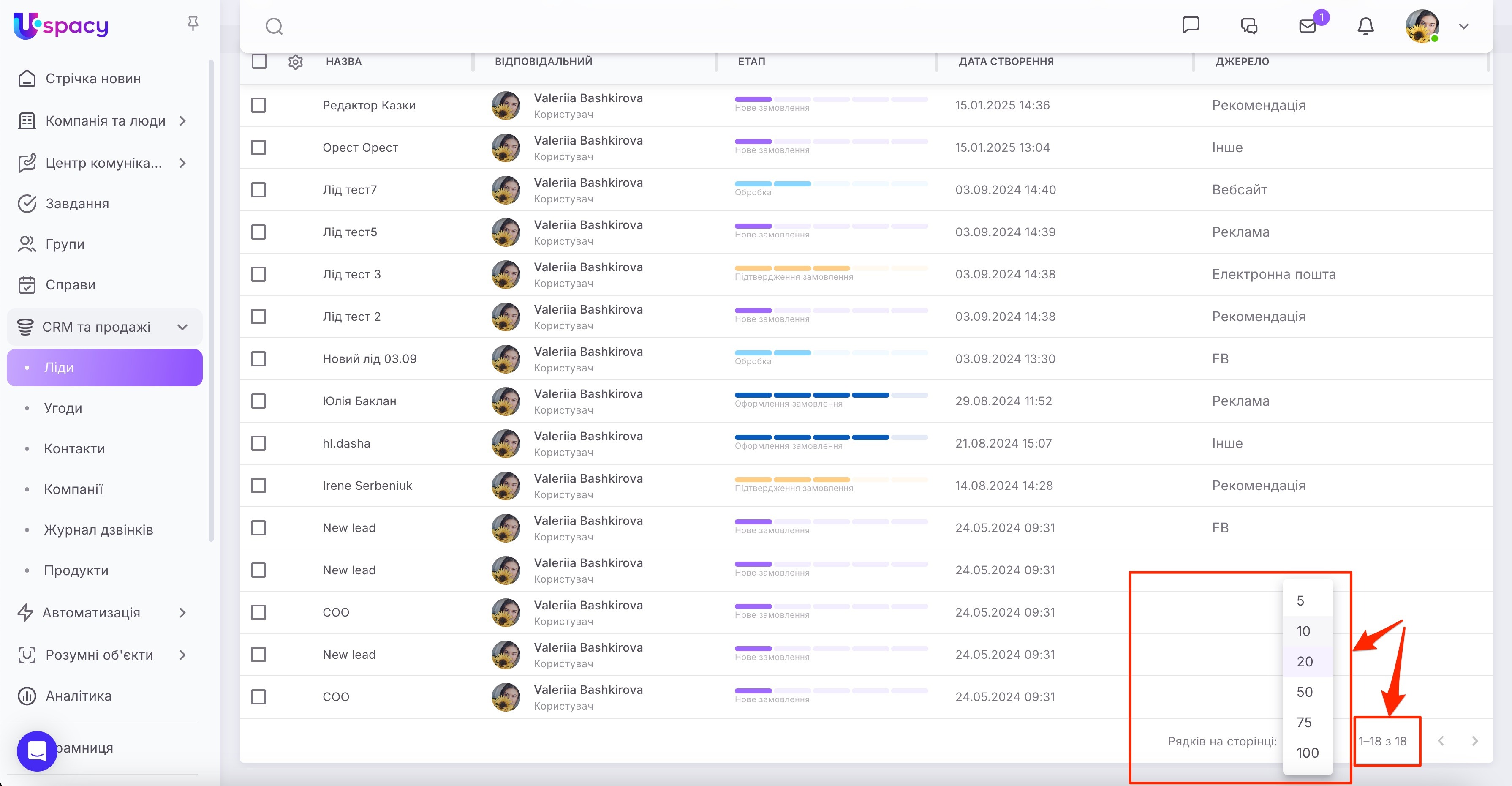 ❗️Мінімальна їх кількість – це 5, а максимальна – 100. За замовчуванням система показує 20 елементів на сторінці. А також можна побачити загальну кількість елементів сутності в цьому списку.