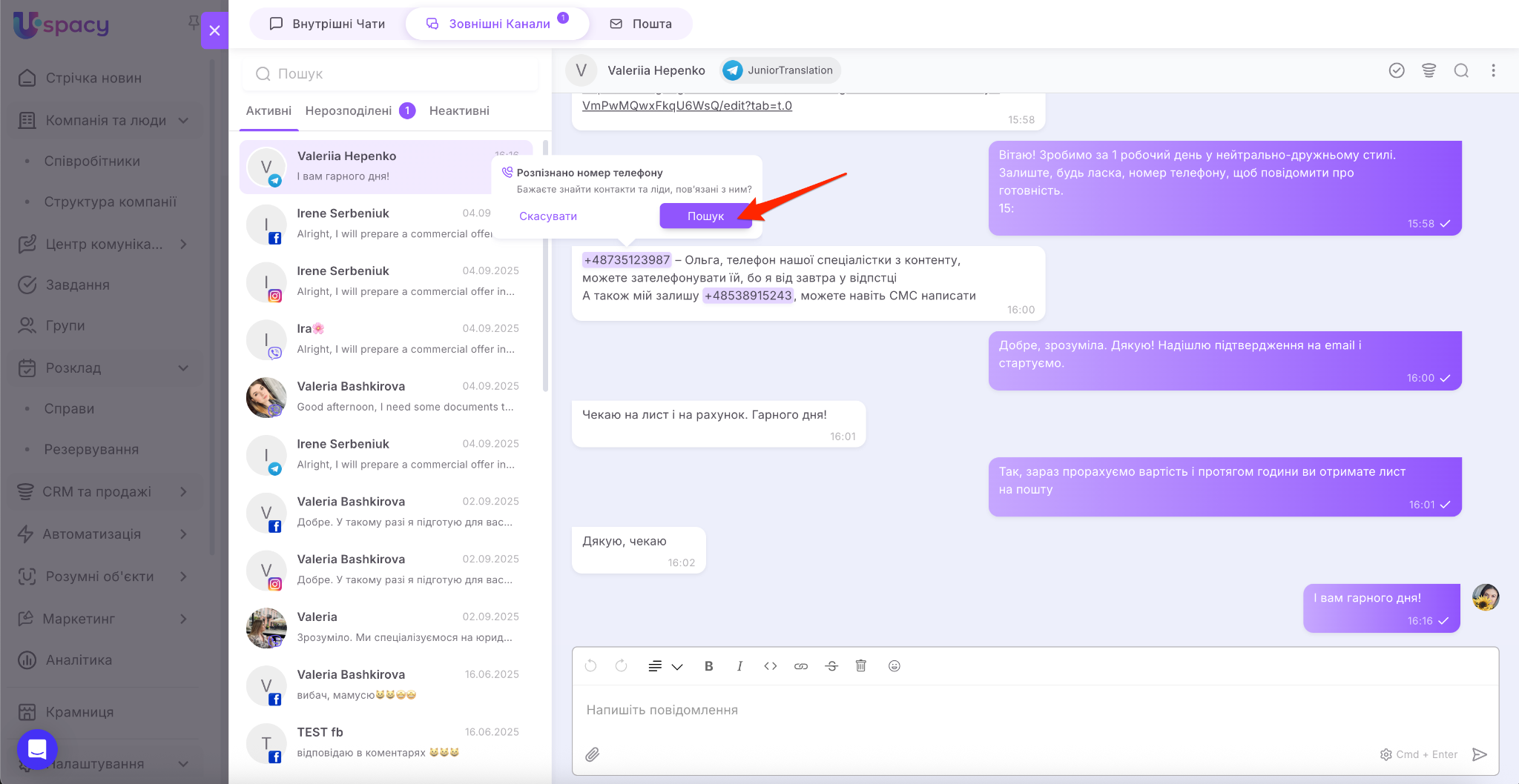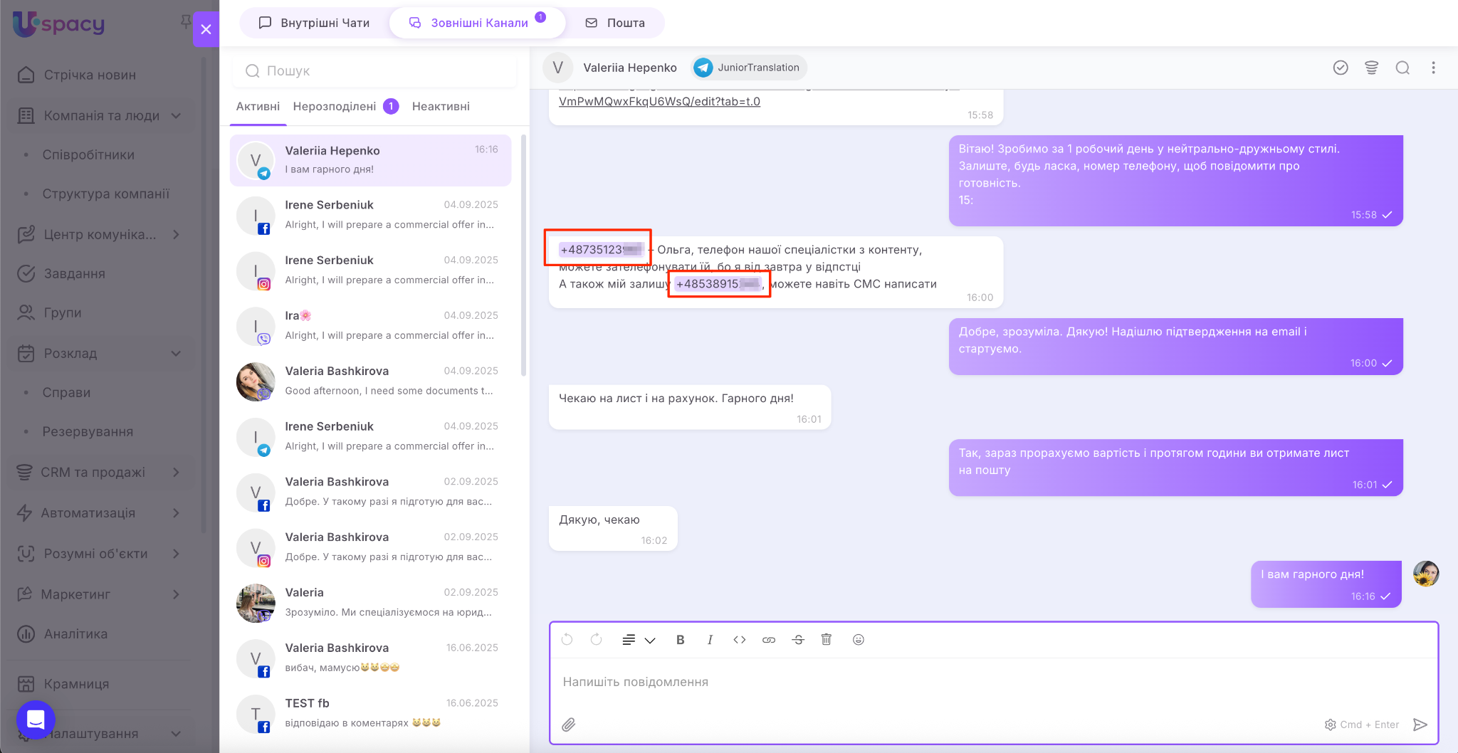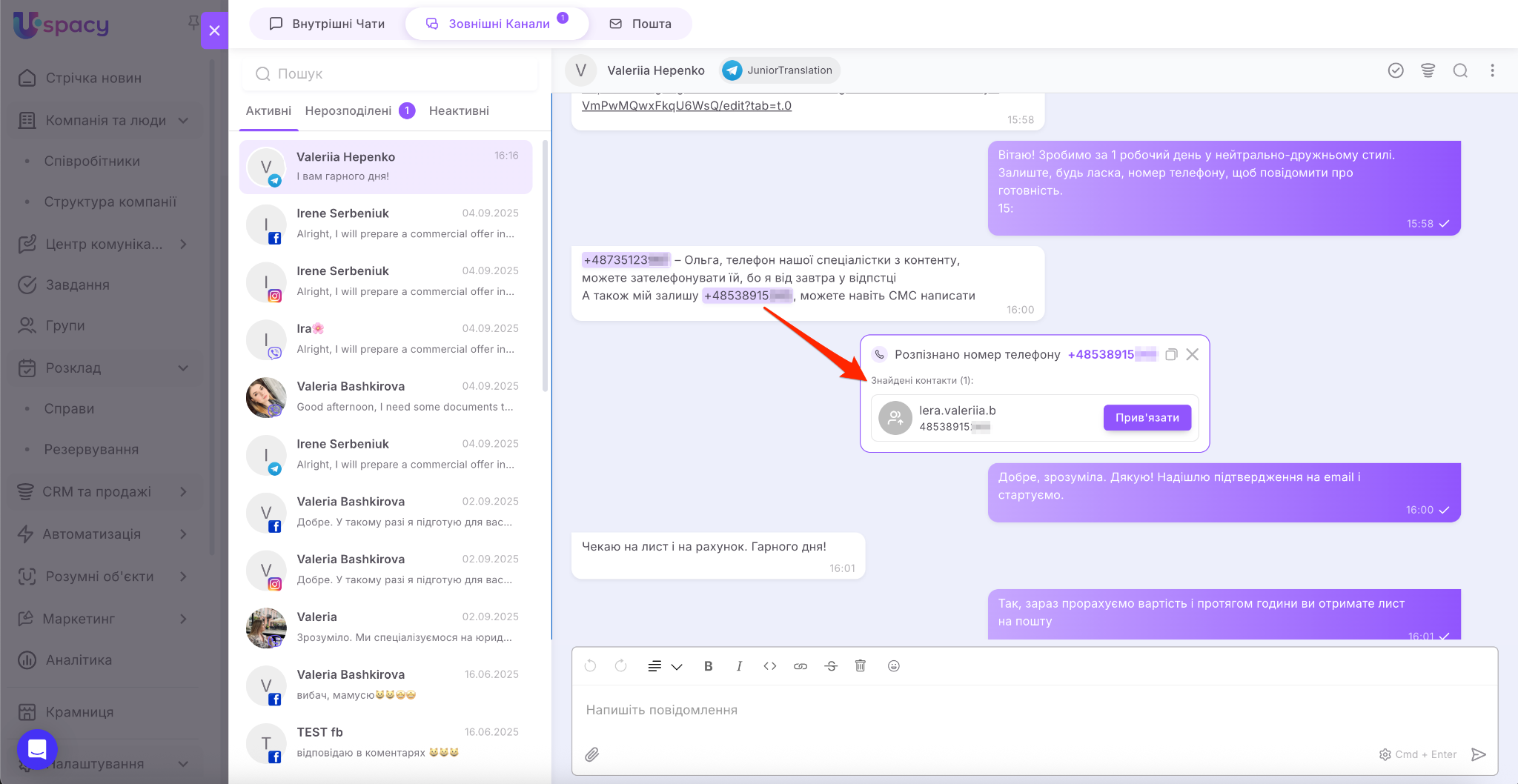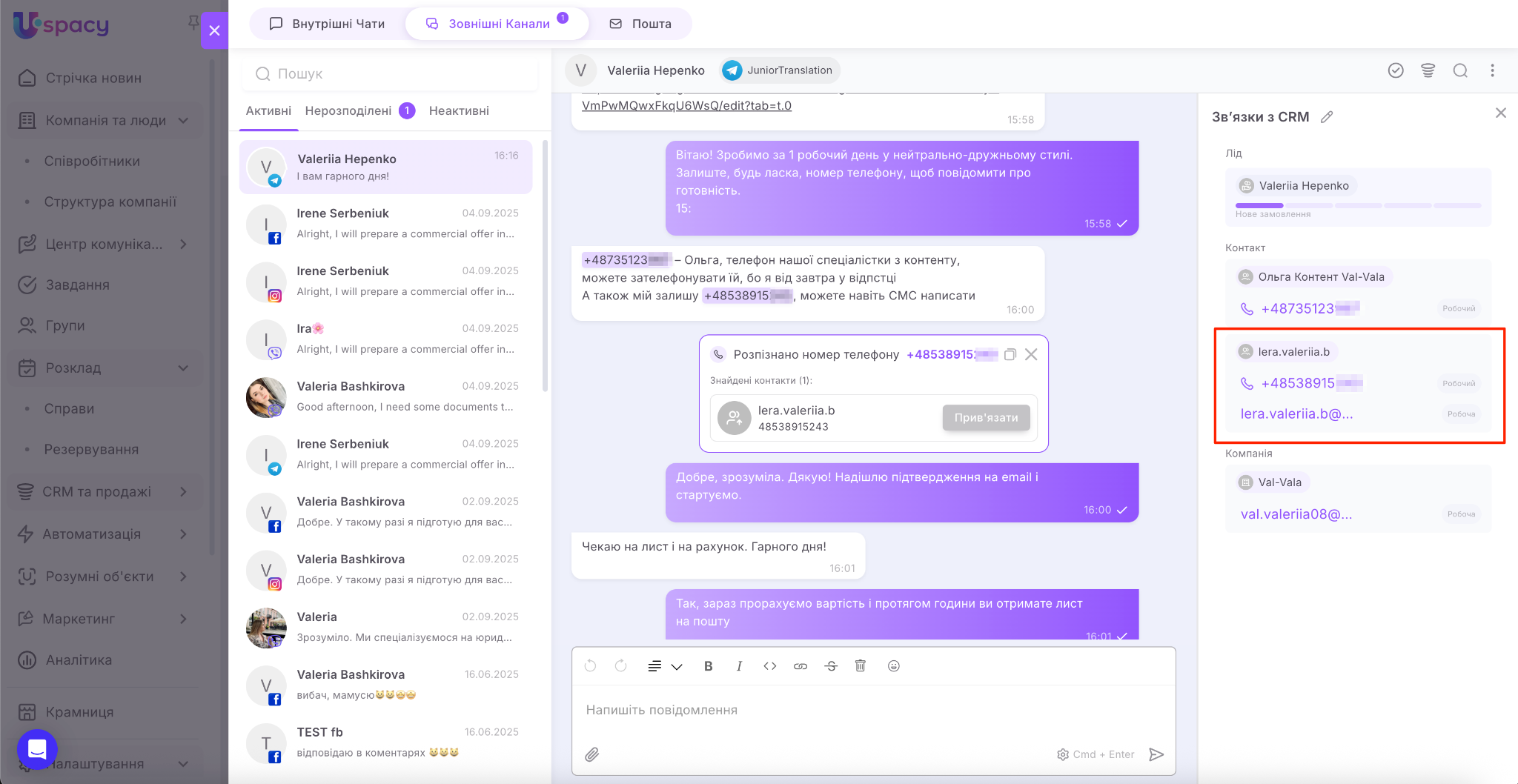 Зовнішні Лінії дозволяють спілкуватися з клієнтами з месенджерів прямо у вашому Просторі Uspacy.