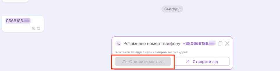 А ще досить зручно, коли клієнт залишає у чаті номер телефону, а ви можете використати його для швидкого пошуку відповідних сутностей у CRM та прив’язки до діалогу. Якщо збігів немає, за наявності прав доступу у один клік створіть Лід або Контакт безпосередньо з інтерфейсу чатів у зовнішніх каналах.