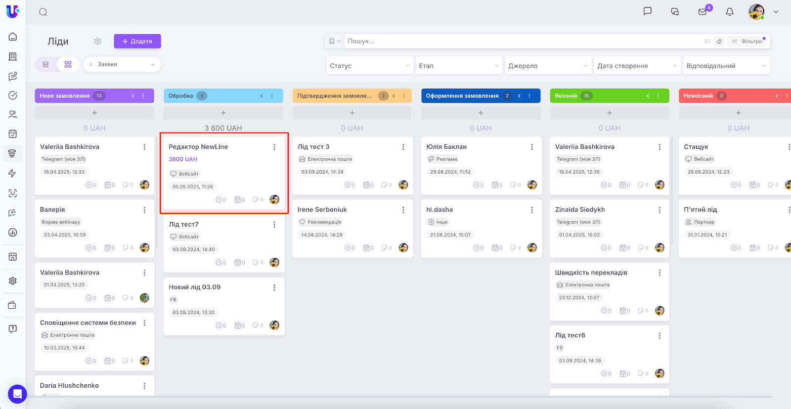 Отже, щоб додати новий лід, натисніть на значок плюс, під назвою будь-якого етапу.